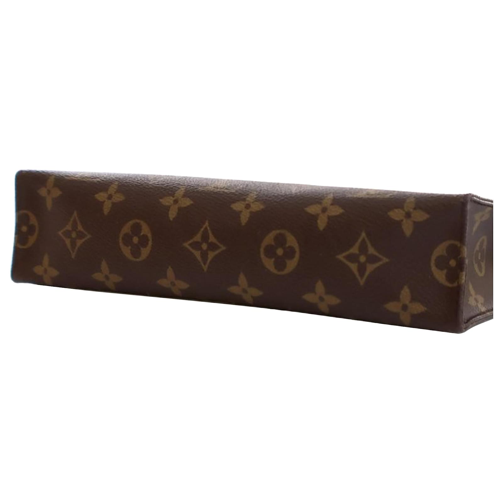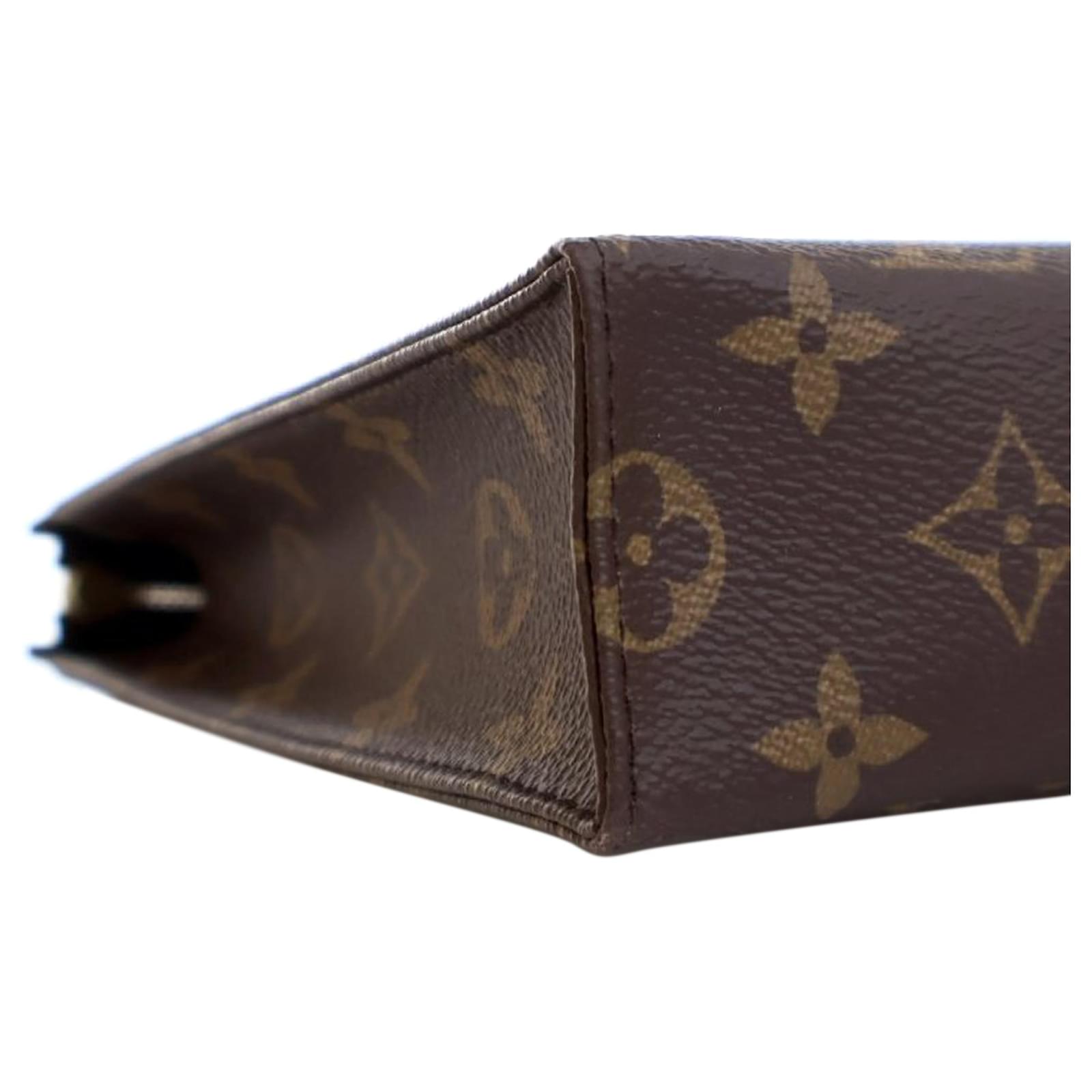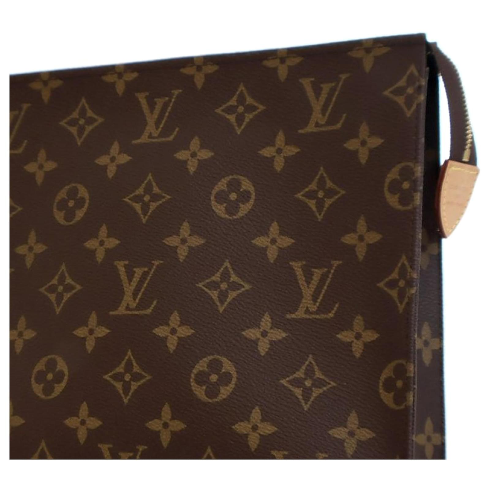 The Toiletry Pouch 26 features a monogram canvas body, and a top zip closure. It carries an AB condition rating.\r\n\r\nExterior Bottom stained with Other. Exterior Corners Worn. Exterior Front stained with Other. Item has an odor of Other. \r\n\r\nDimensions: \r\nLength: 20 cm\r\nWidth: 25 cm\r\nDepth: 4 cm\r\n\r\nInclusions: Dust Bag, Box\r\n\r\nColor: Brown\r\n\r\nMaterial: Canvas x Monogram Canvas\r\n\r\nCountry of Origin: France\r\n\r\nBoutique Reference: PJC325185F956 \r\n
