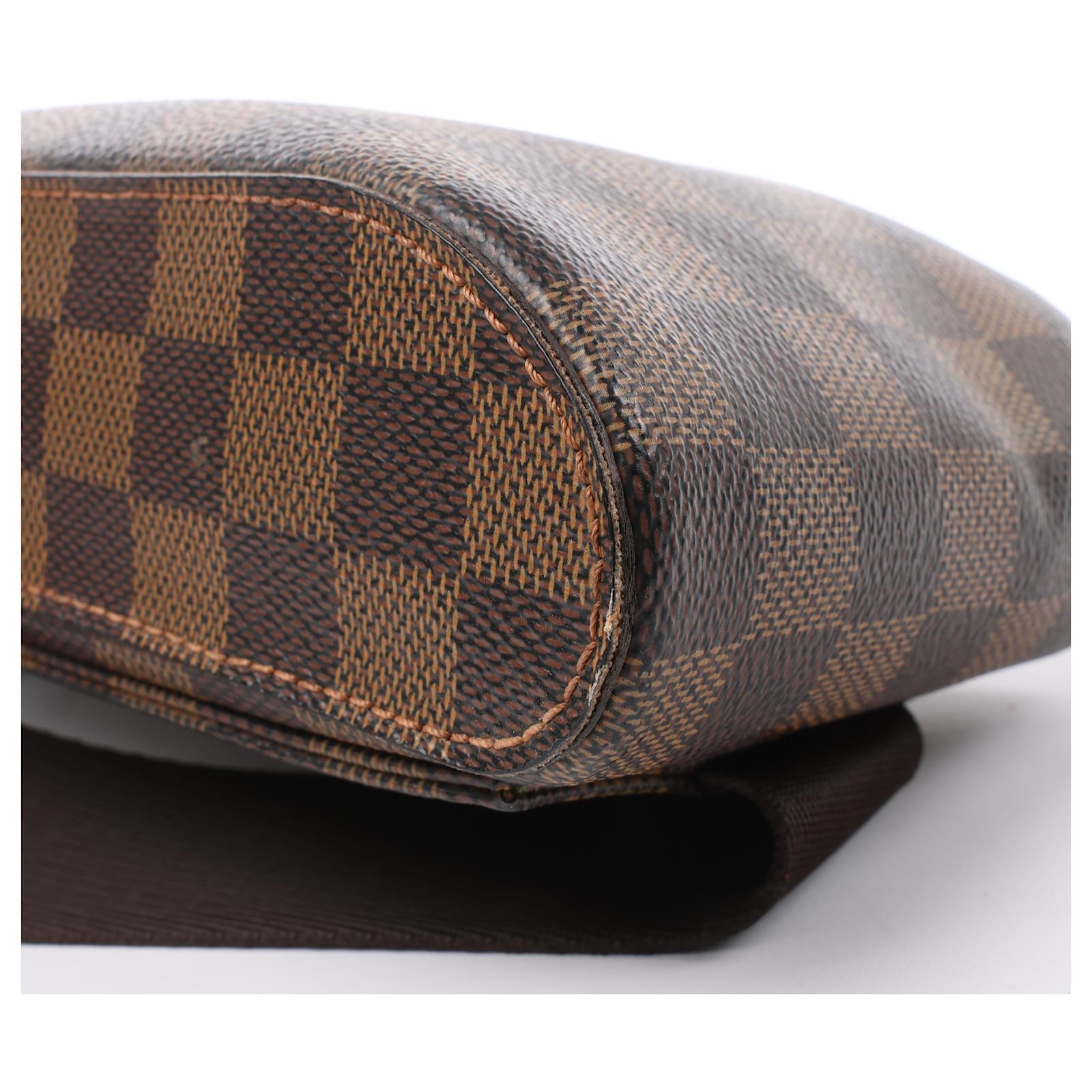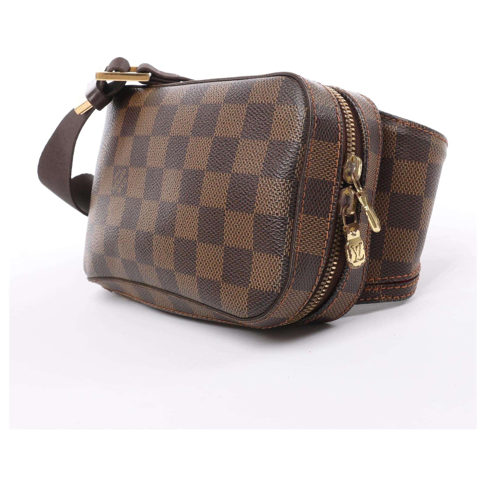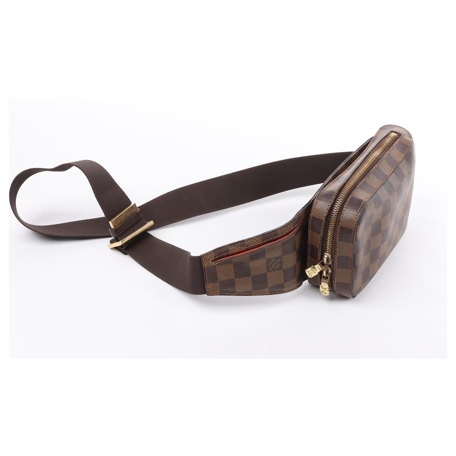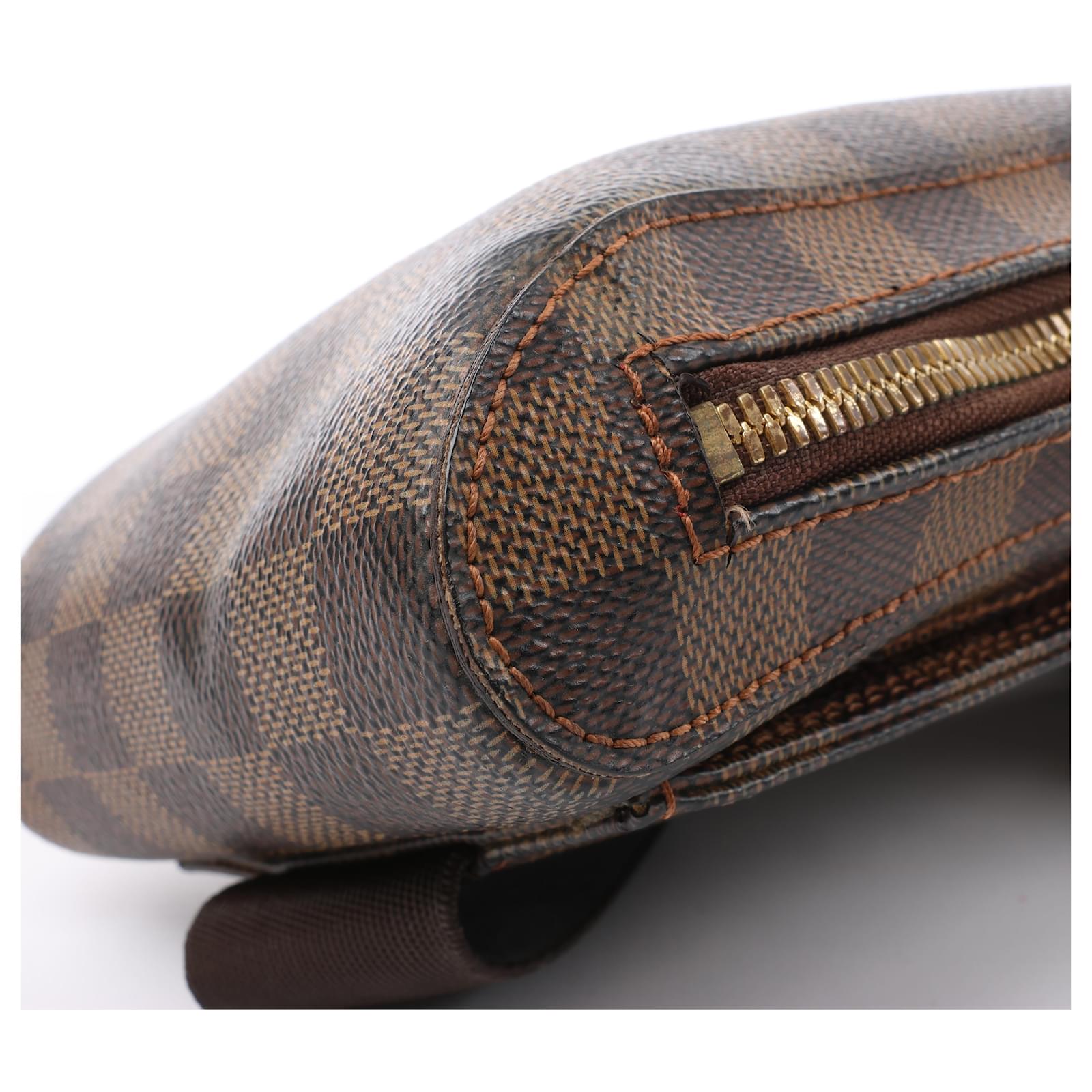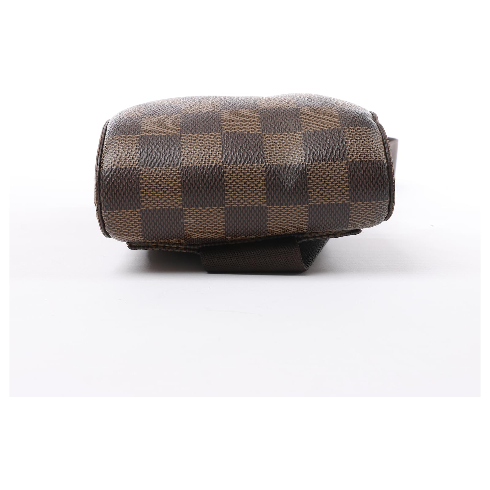 Louis Vuitton Damier Ebene Geronimos Crossbody Bag N51994 combines style and\nfunctionality with its iconic checkered canvas, adjustable strap, and zip\nclosure. Compact yet spacious, it’s perfect for hands-free convenience on the\ngo.\nBrand: Louis Vuitton\nModel: Geronimos\nSize: -\nWidth: 19 cm\nHeight: 12 cm\nExterior Condition: Excellent\nInterior Condition: Excellent\nCondition Details: Outer canvas is clean and beautiful in excellent condition.\nThe hardware has hairline scratches and some parts starts to lose it gold tone,\nbut is bright and crisp. The interior is clean and in excellent condition, but\nwith light storage odor. Date code: CA0015\nColour: Brown\nInterior Colour: Red\nHardware Colour: Gold\nMaterial: Leather, Canvas\nComes With: –