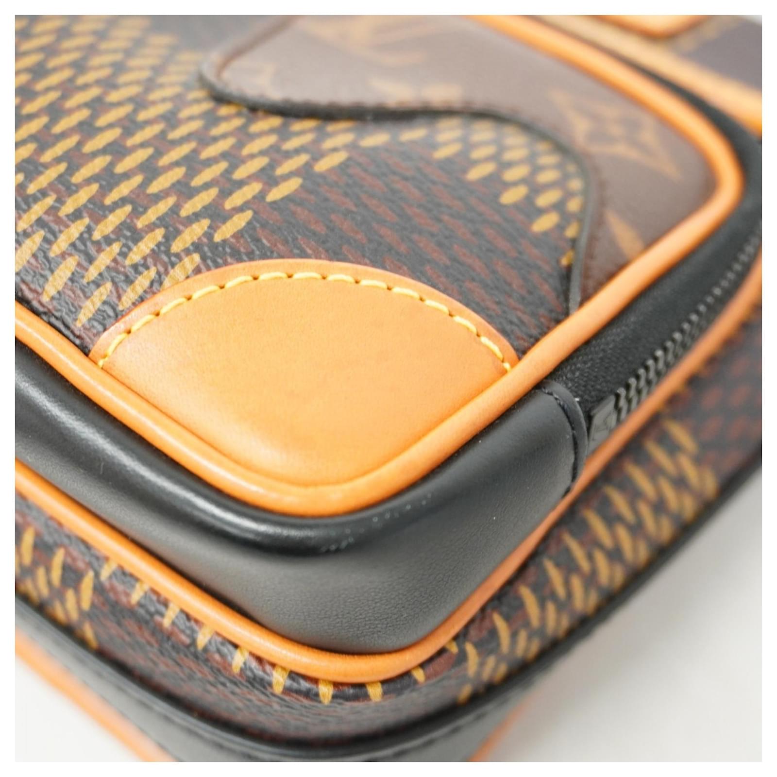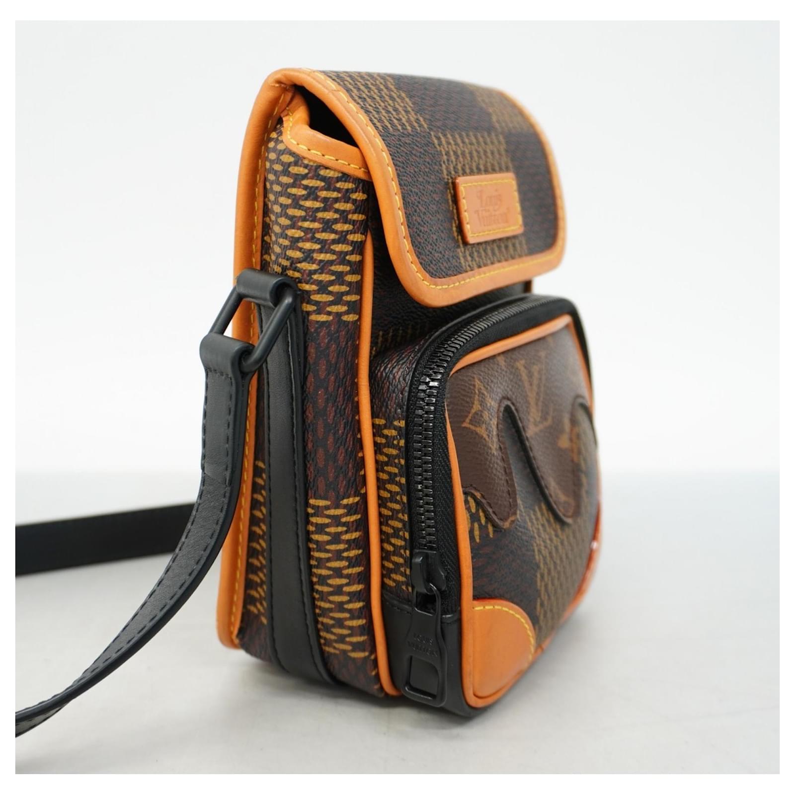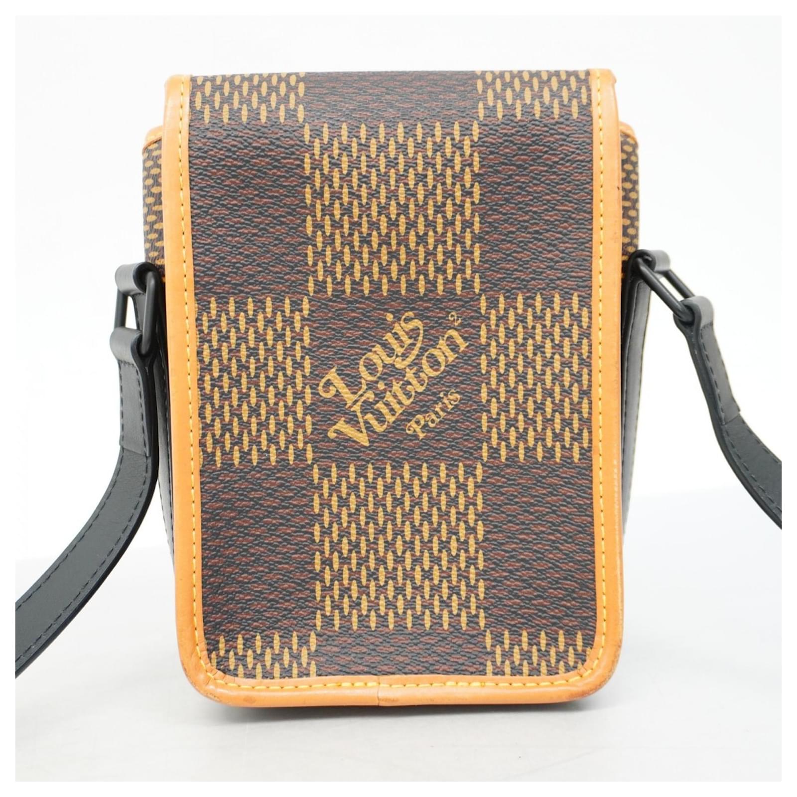 This Louis Vuitton shoulder bag, part of the Damier Giant Amazon collection, features a brown Ebene color scheme and is designed for men. It is a product of the collaboration with NIGO. The bag is classified as used but is in good condition, showing slight traces of use, including minor scratches and dirt. Potential buyers are encouraged to review the provided images for a detailed view of the item’s condition and included accessories.
