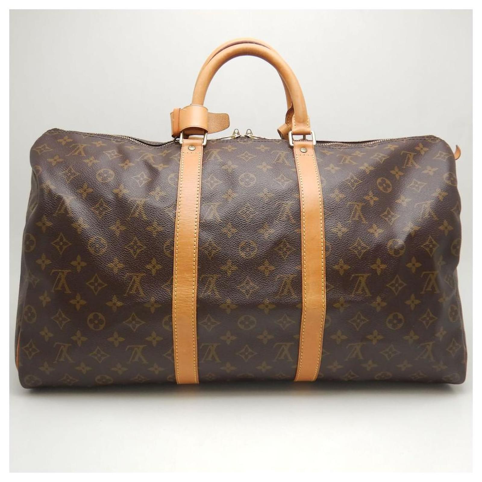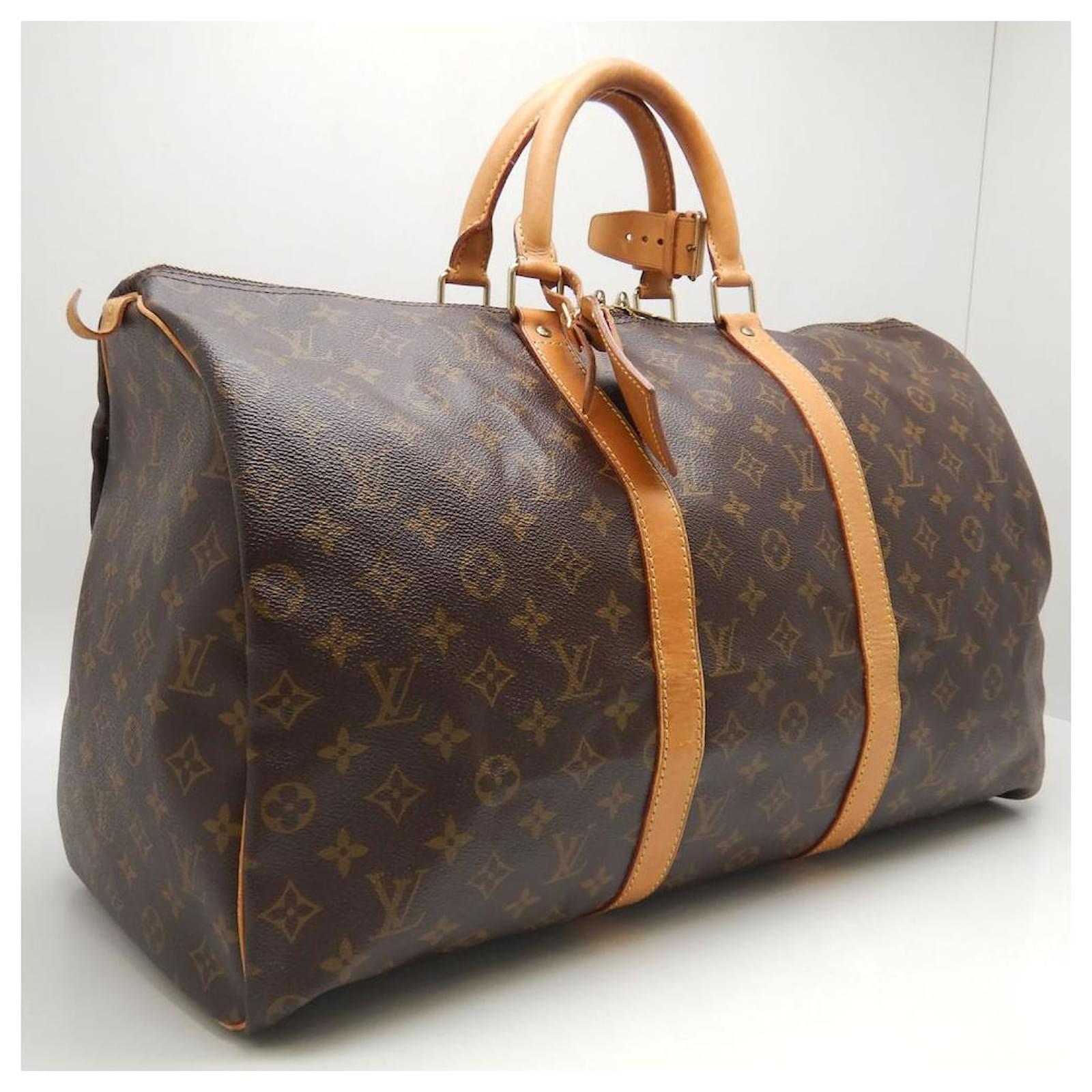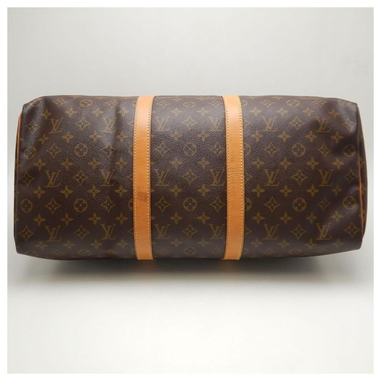 – General information -\nBrand : Louis VuittonItem name : Louis Vuitton Keepall Monogram Boston BagModel number : M41426 – Design -Type : Travel BagMaterial : CanvasColor : BrownGender : Male- Size -Size : Length : 50Depth : 22Height : 29Item Material : PVCItem Series : MonogramItem Color : BrownClosure Type : ZipperInterior : Main compartment x 1- Inventory -Serial Number : SP0974SKU : 120210020865600A0025714455- Included Items -Accessories : Padlock,Key,Name Tag*Before purchasing, please refer to the images of the accessories included with the item.- Condition -Condition : Good ConditionRank : Used A Used condition with obviously scratches and stains.Condition Notice : Before purchasing, please refer to the images for the exact condition of the item. Measurments: width: 220 mm length: 500 mm height: 290 mm \n Product Id: 496169 \n