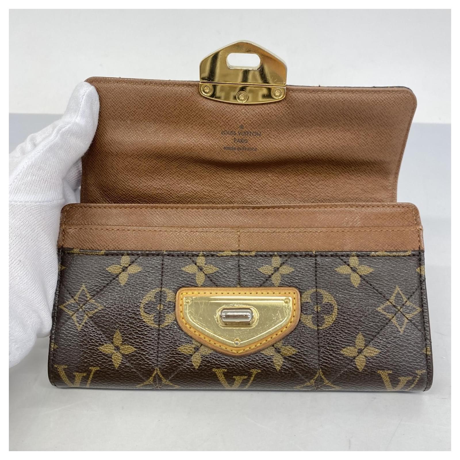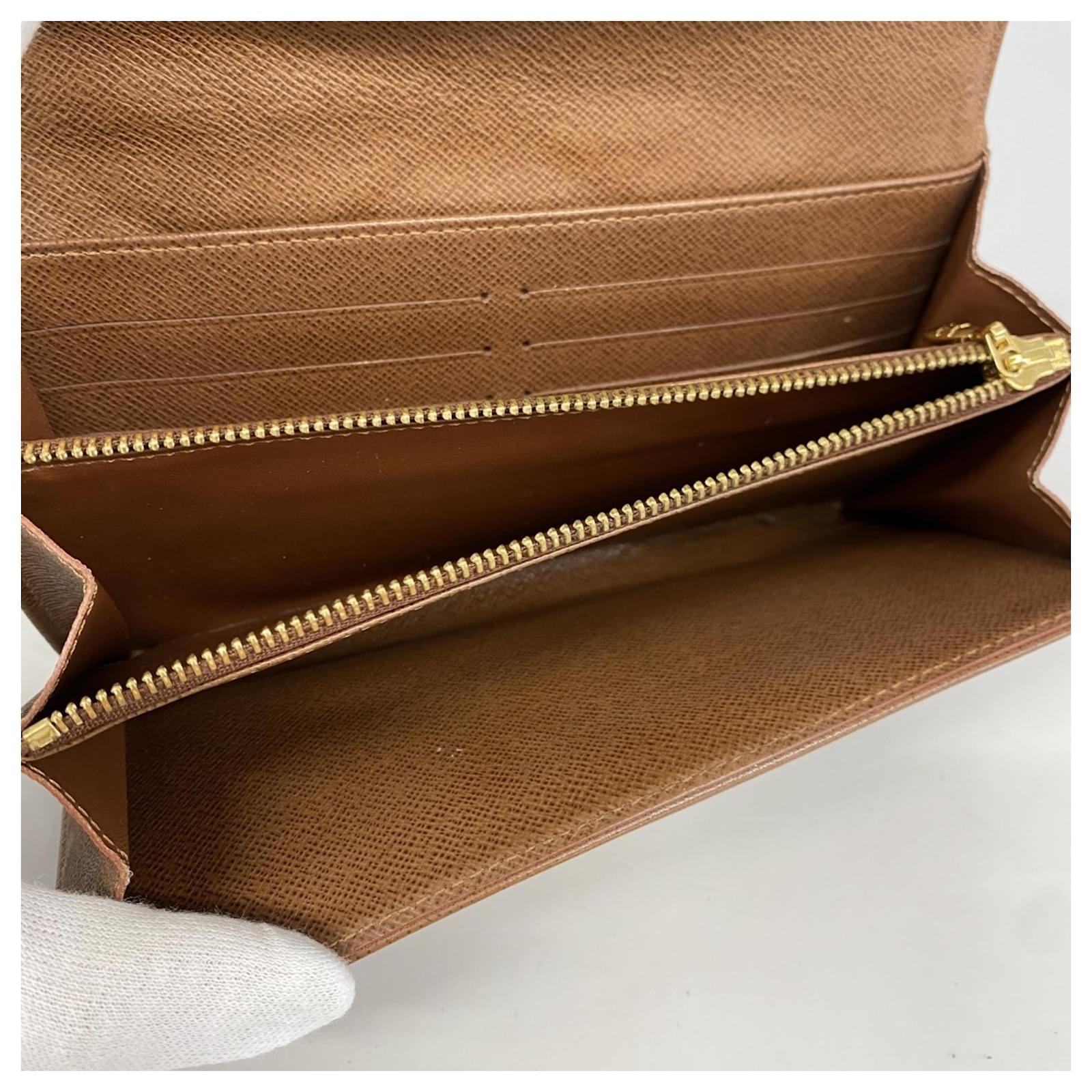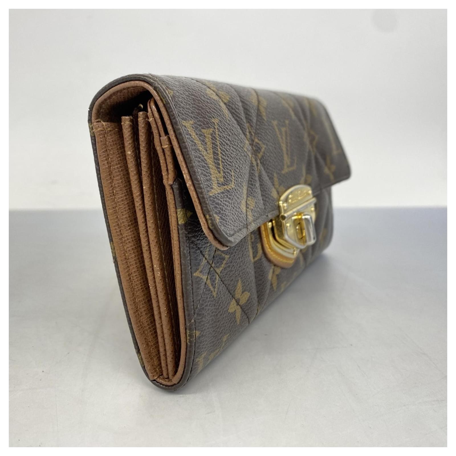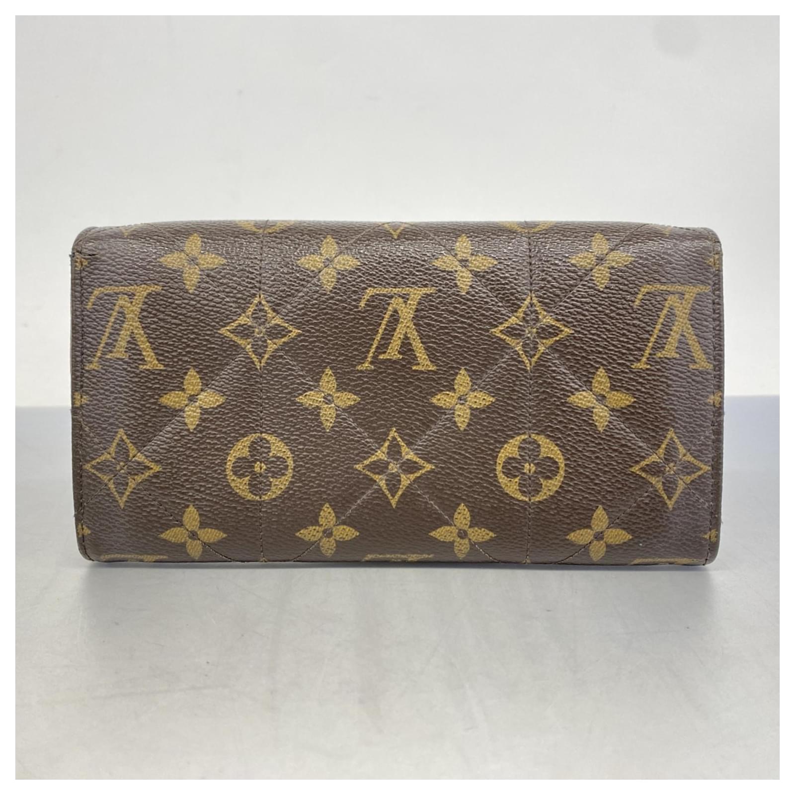 This Louis Vuitton long wallet, model Monogram Etoile Portefeuille Sarah M66556, is designed in a classic brown color and features a bi-fold style. It is categorized as used but remains in good condition, showing slight traces of usage, including minor scratches and dirt. The edges exhibit slight cracking. The wallet comes with a box and dust bag, and potential buyers are encouraged to review the images for a detailed view of its condition and included accessories.