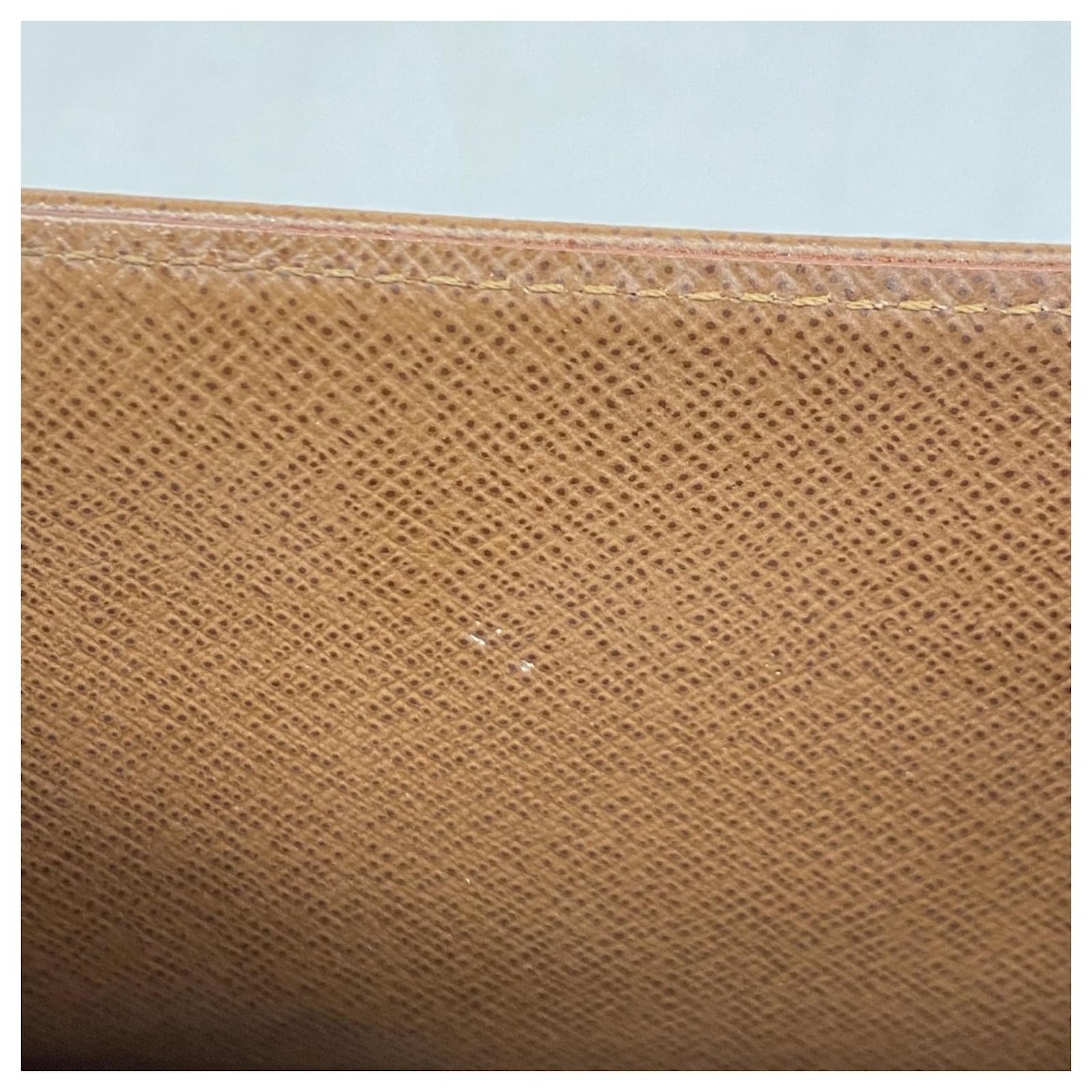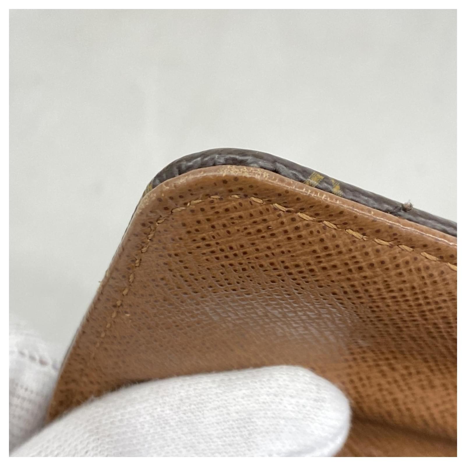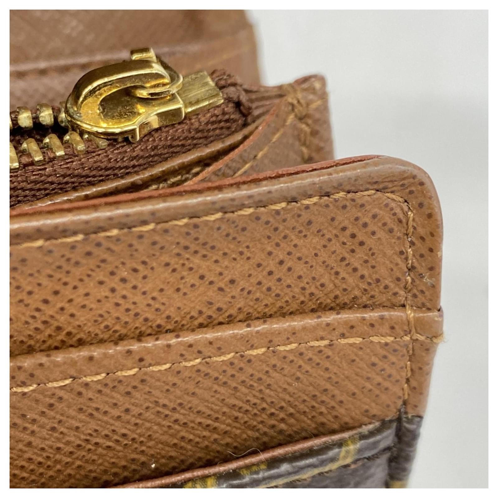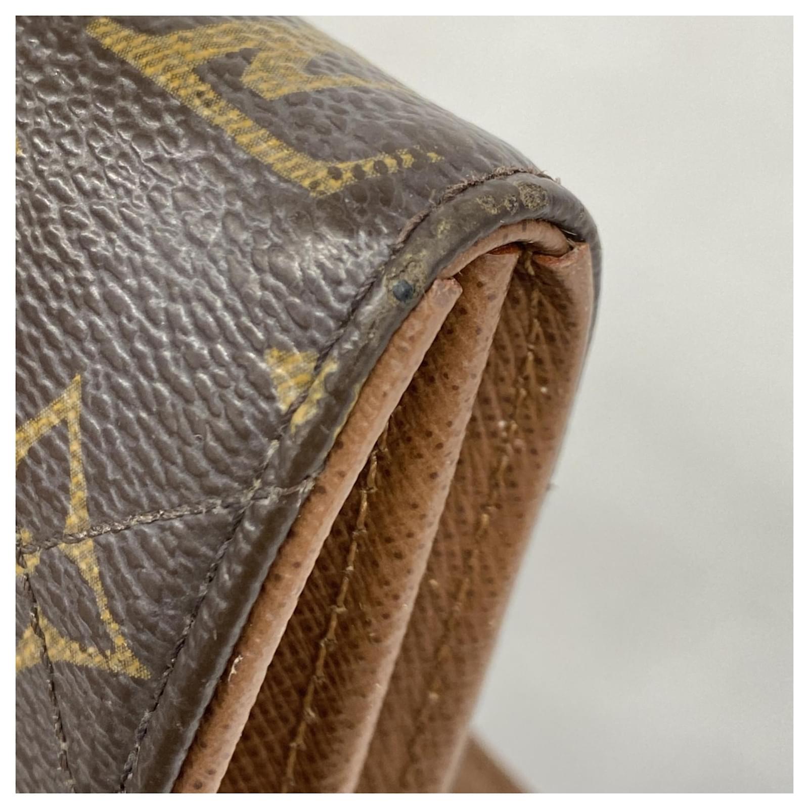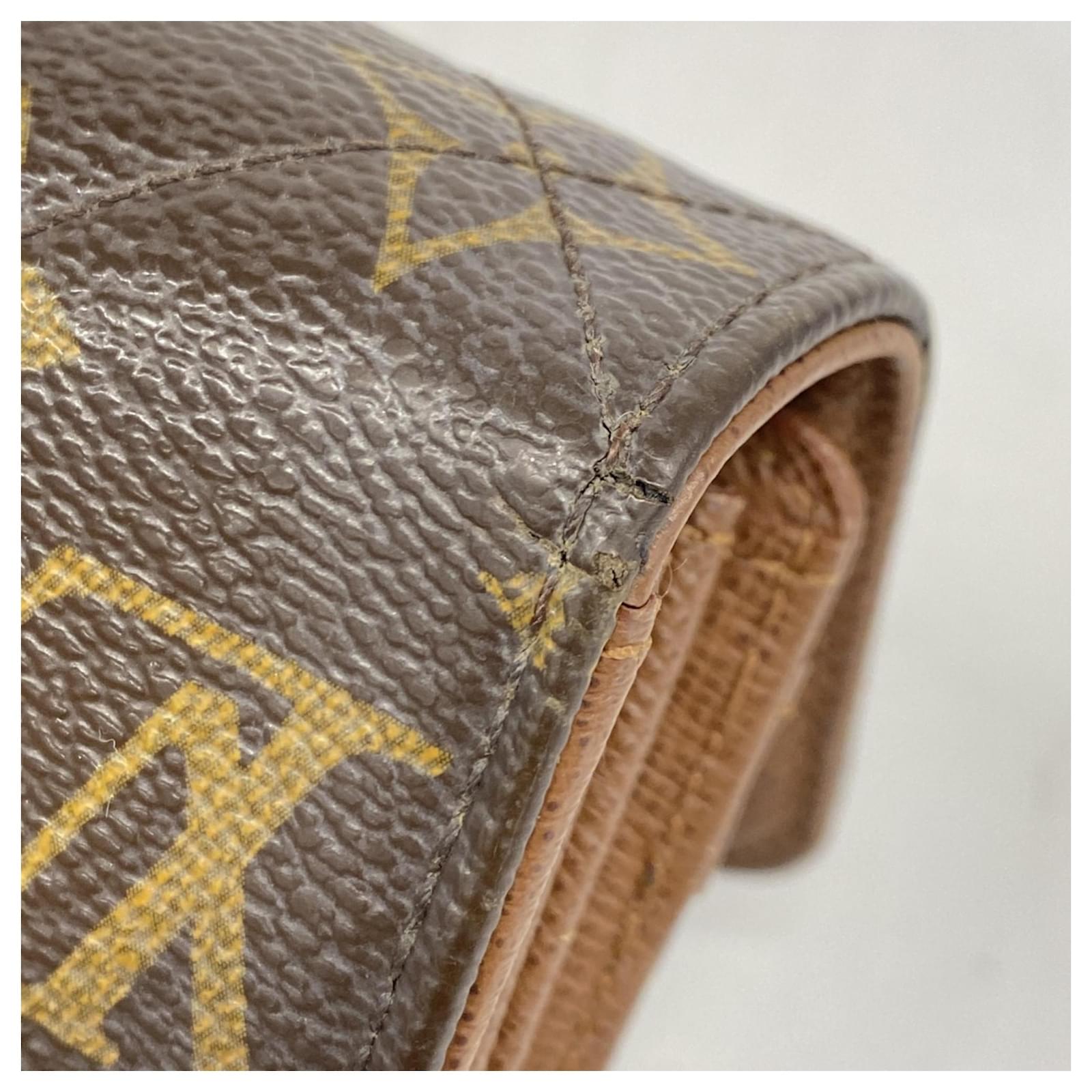 This Louis Vuitton long wallet, model Monogram Etoile Portefeuille Sarah M66556, is designed in a classic brown color and features a bi-fold style. It is categorized as used but remains in good condition, showing slight traces of usage, including minor scratches and dirt. The edges exhibit slight cracking. The wallet comes with a box and dust bag, and potential buyers are encouraged to review the images for a detailed view of its condition and included accessories.