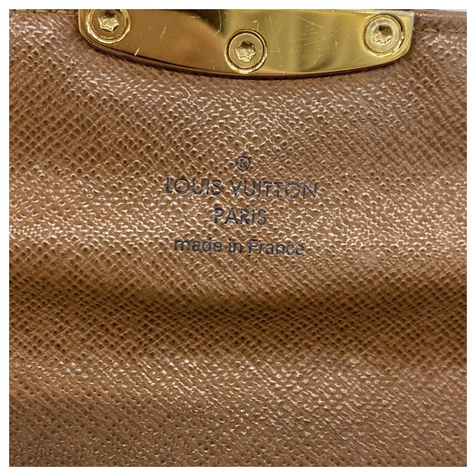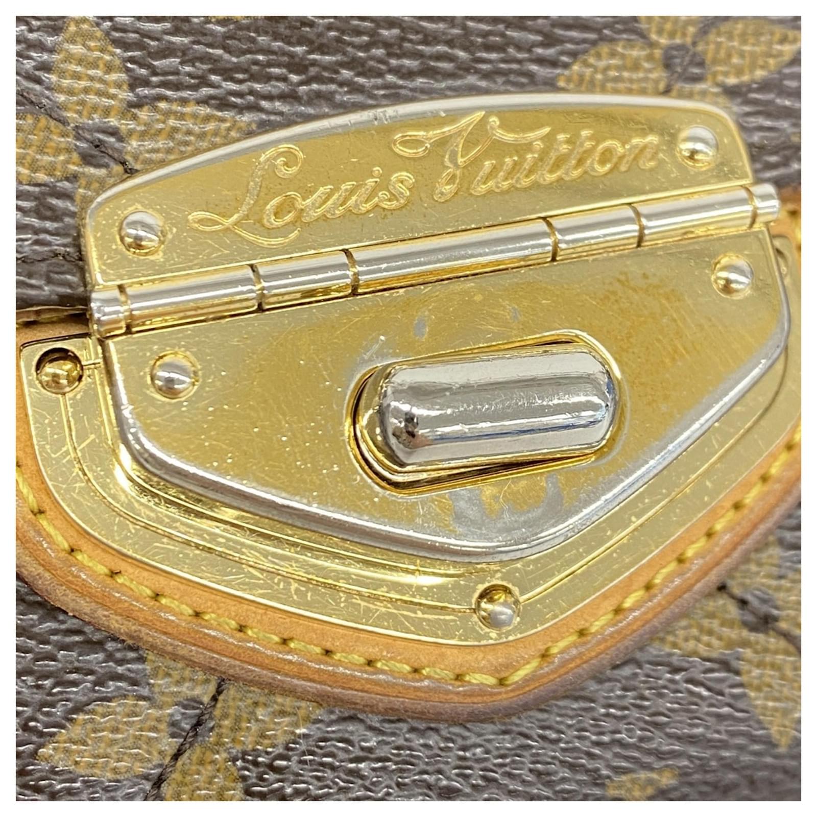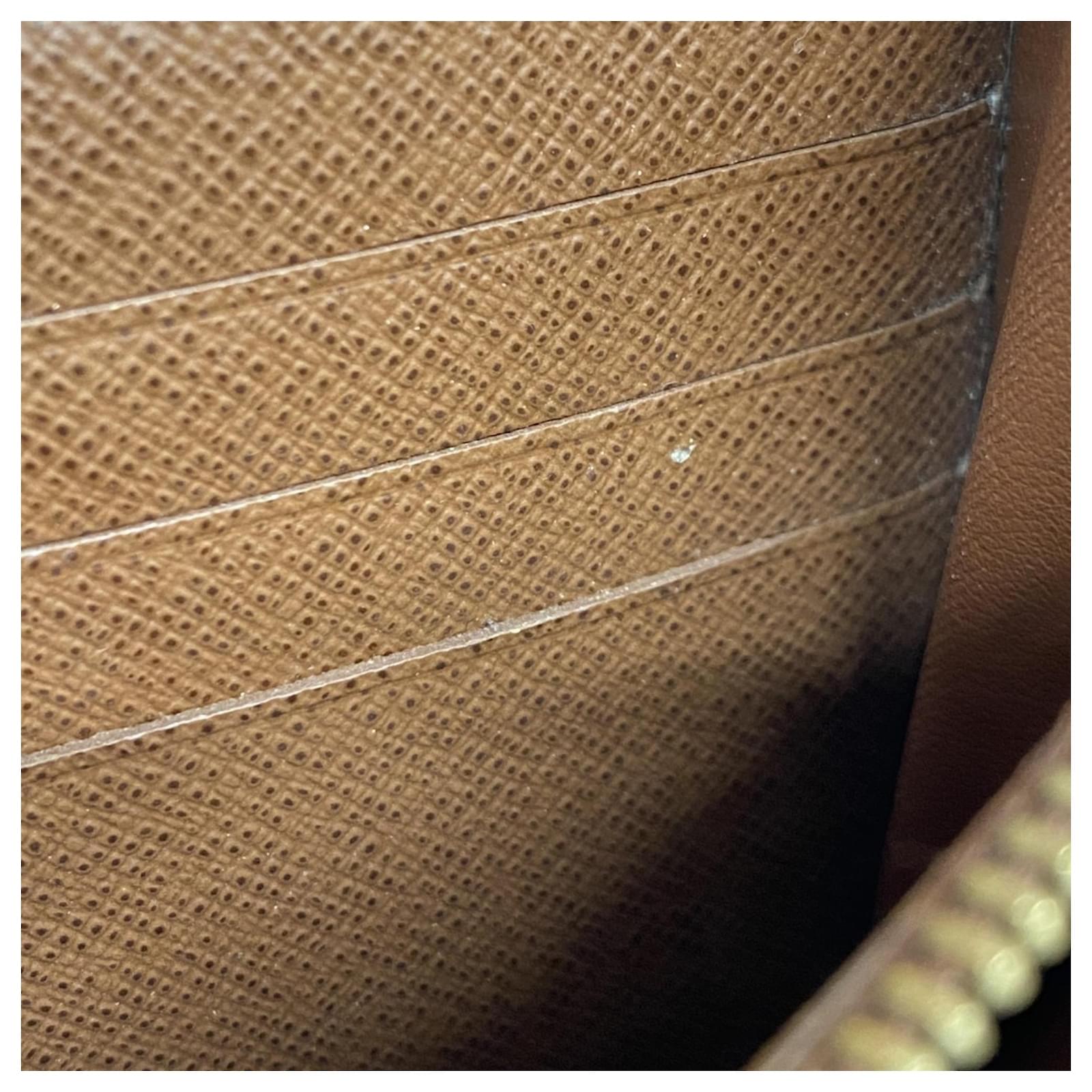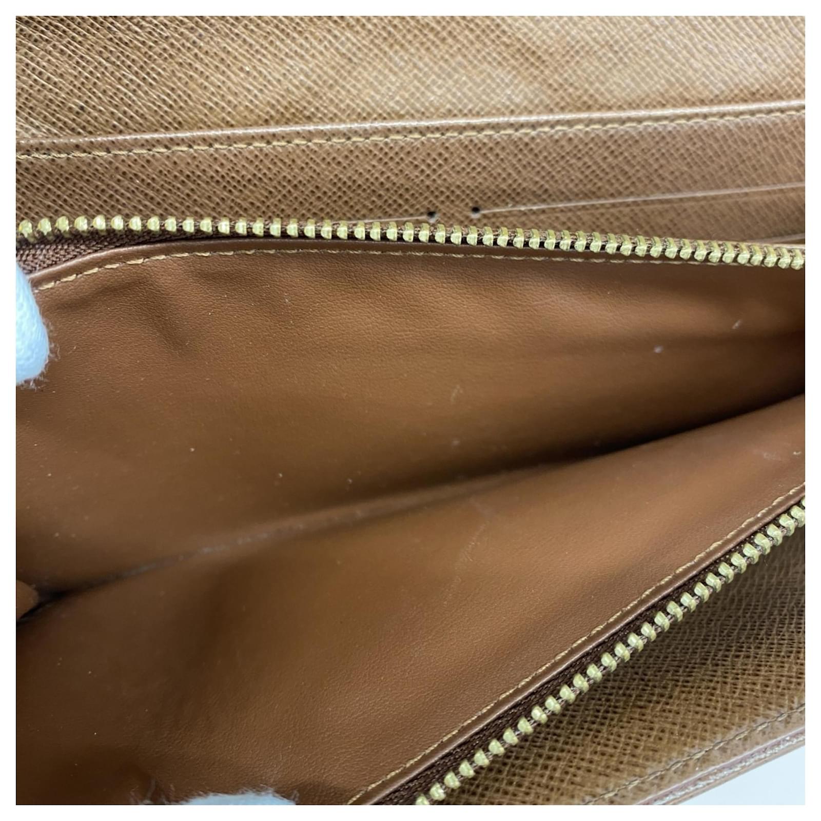 This Louis Vuitton long wallet, model Monogram Etoile Portefeuille Sarah M66556, is designed in a classic brown color and features a bi-fold style. It is categorized as used but remains in good condition, showing slight traces of usage, including minor scratches and dirt. The edges exhibit slight cracking. The wallet comes with a box and dust bag, and potential buyers are encouraged to review the images for a detailed view of its condition and included accessories.