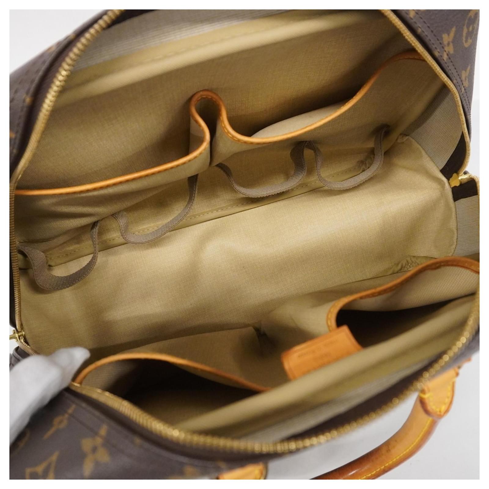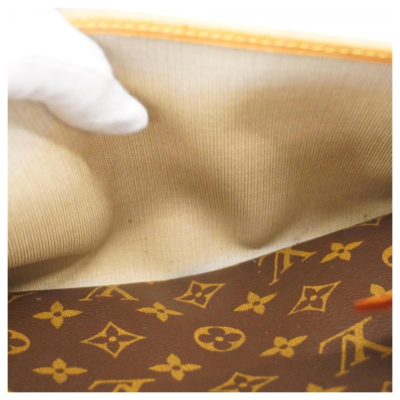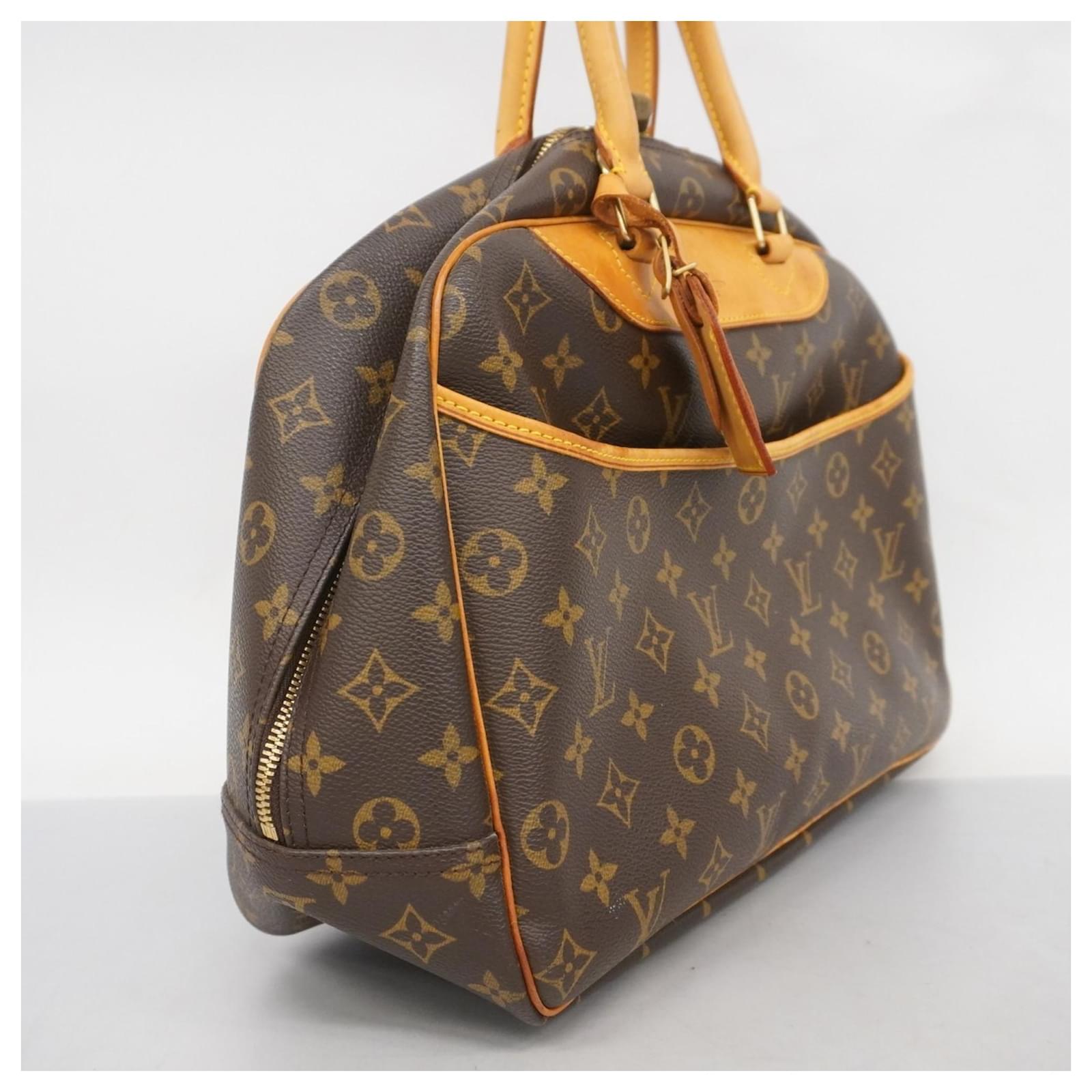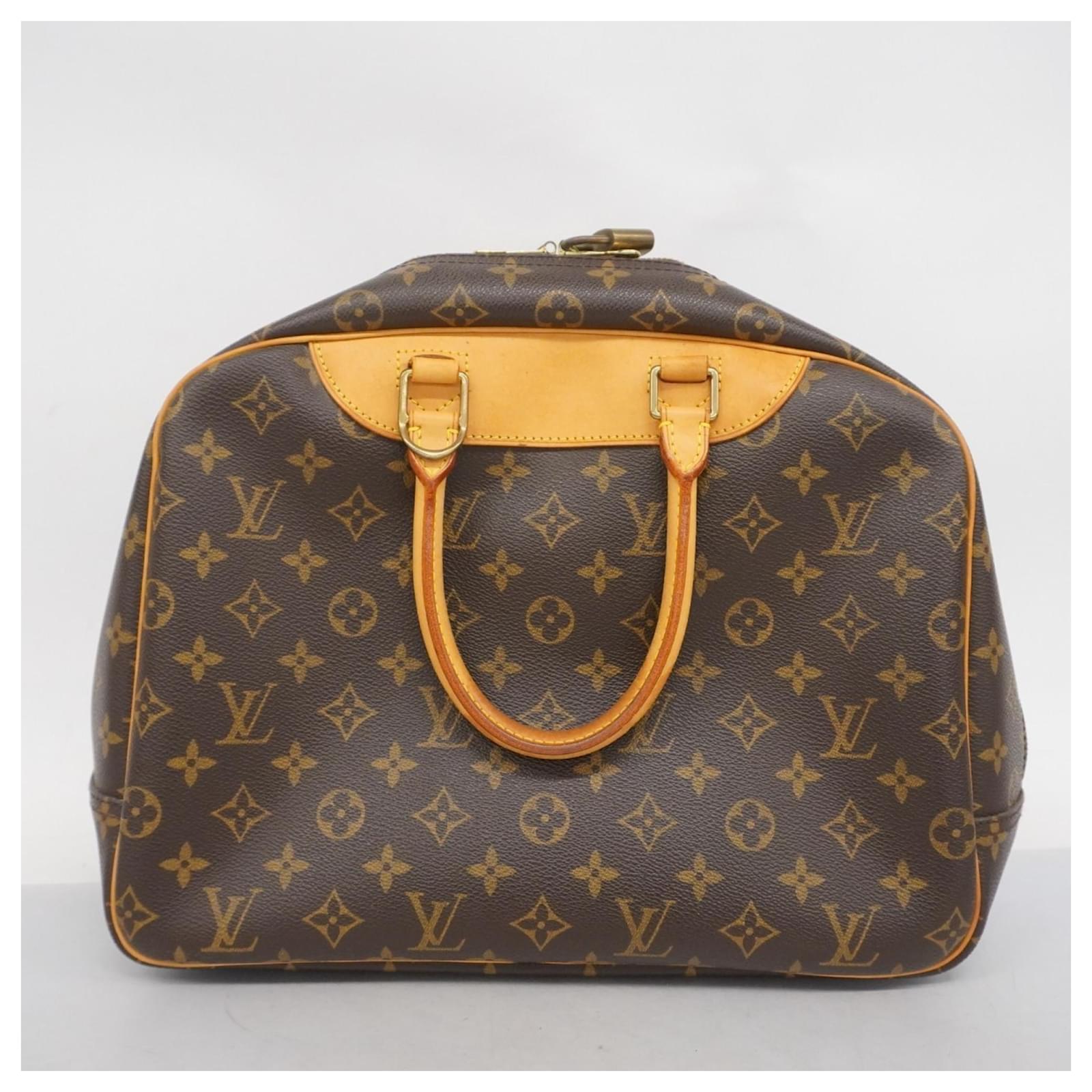 This Louis Vuitton handbag, model Monogram Deauville M47270, is designed for ladies and comes in a classic brown color. It is a used item in good condition, classified as Rank AB, indicating slight traces of usage, including minor scratches and dirt. The handbag features initials \”M.T\” inscribed on it. Included with the handbag are a name tag and a padlock. Potential buyers are encouraged to review the images for a detailed view of the item’s condition and included accessories.