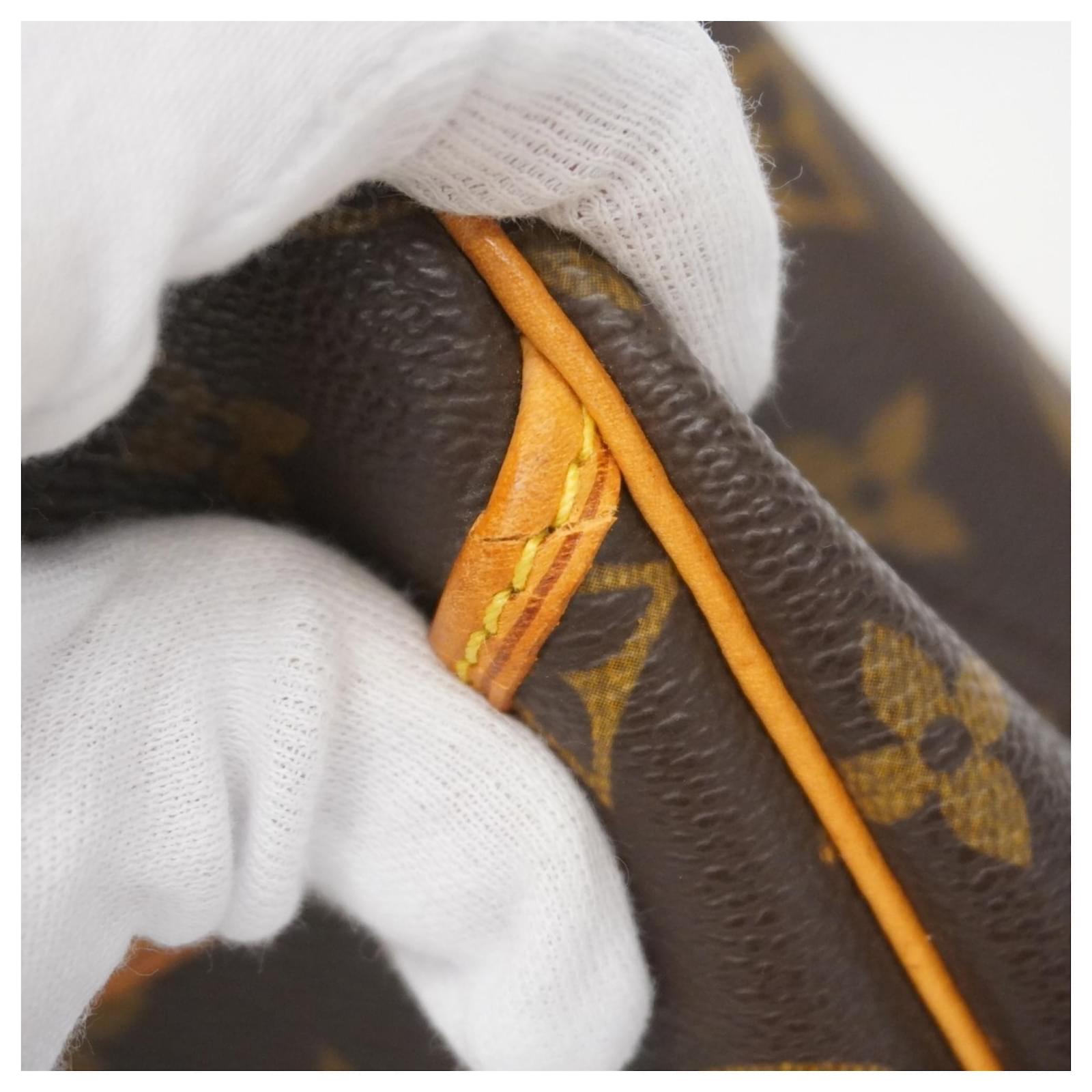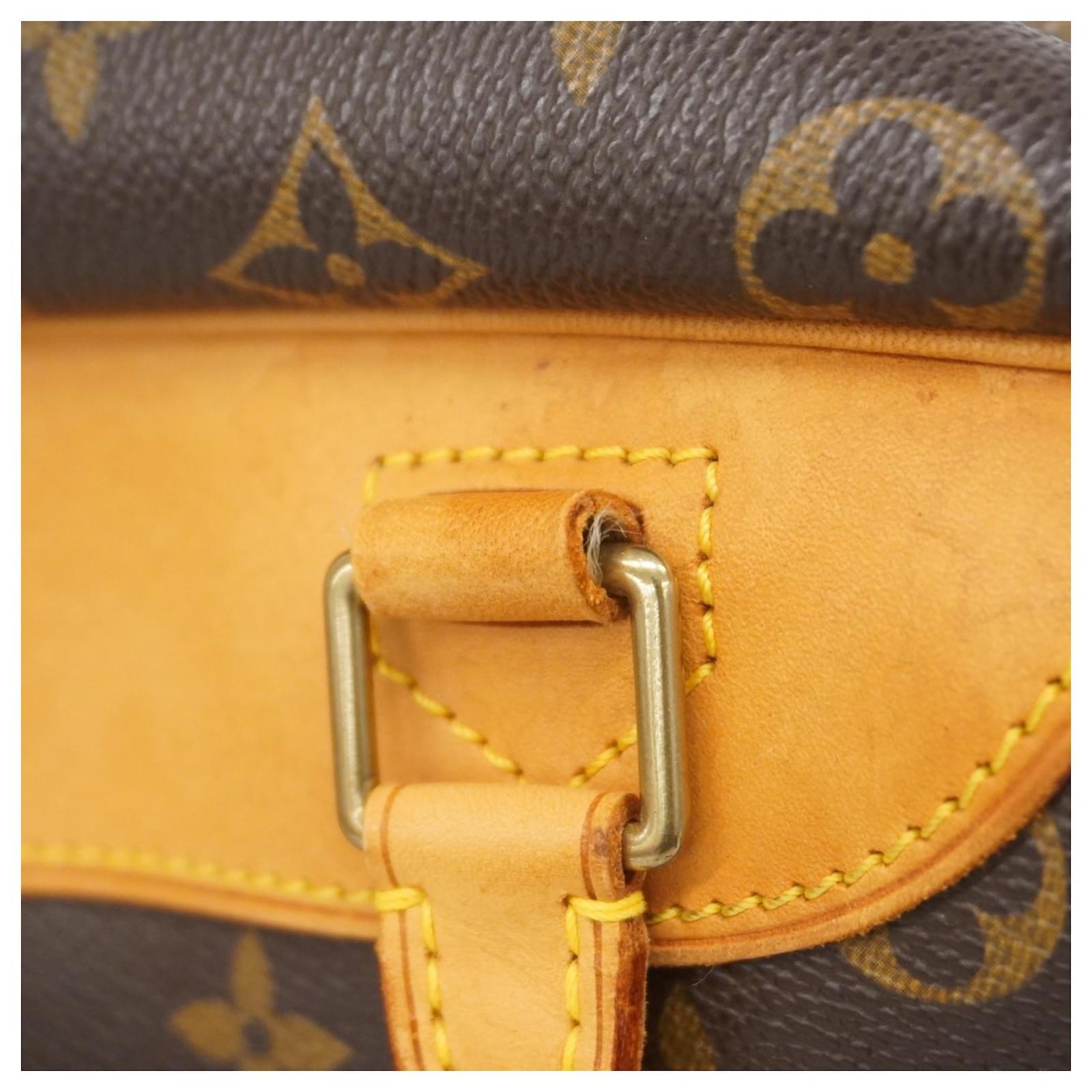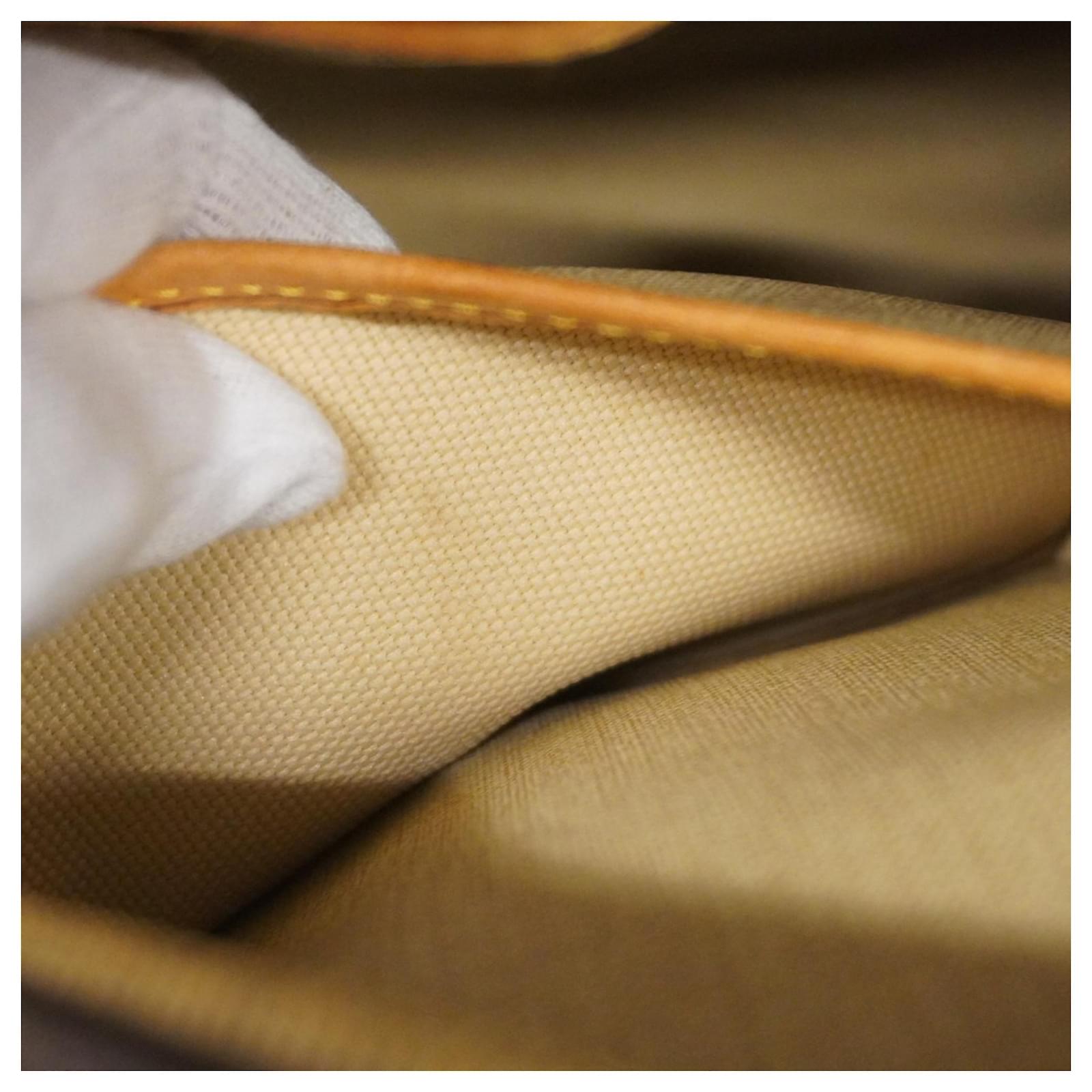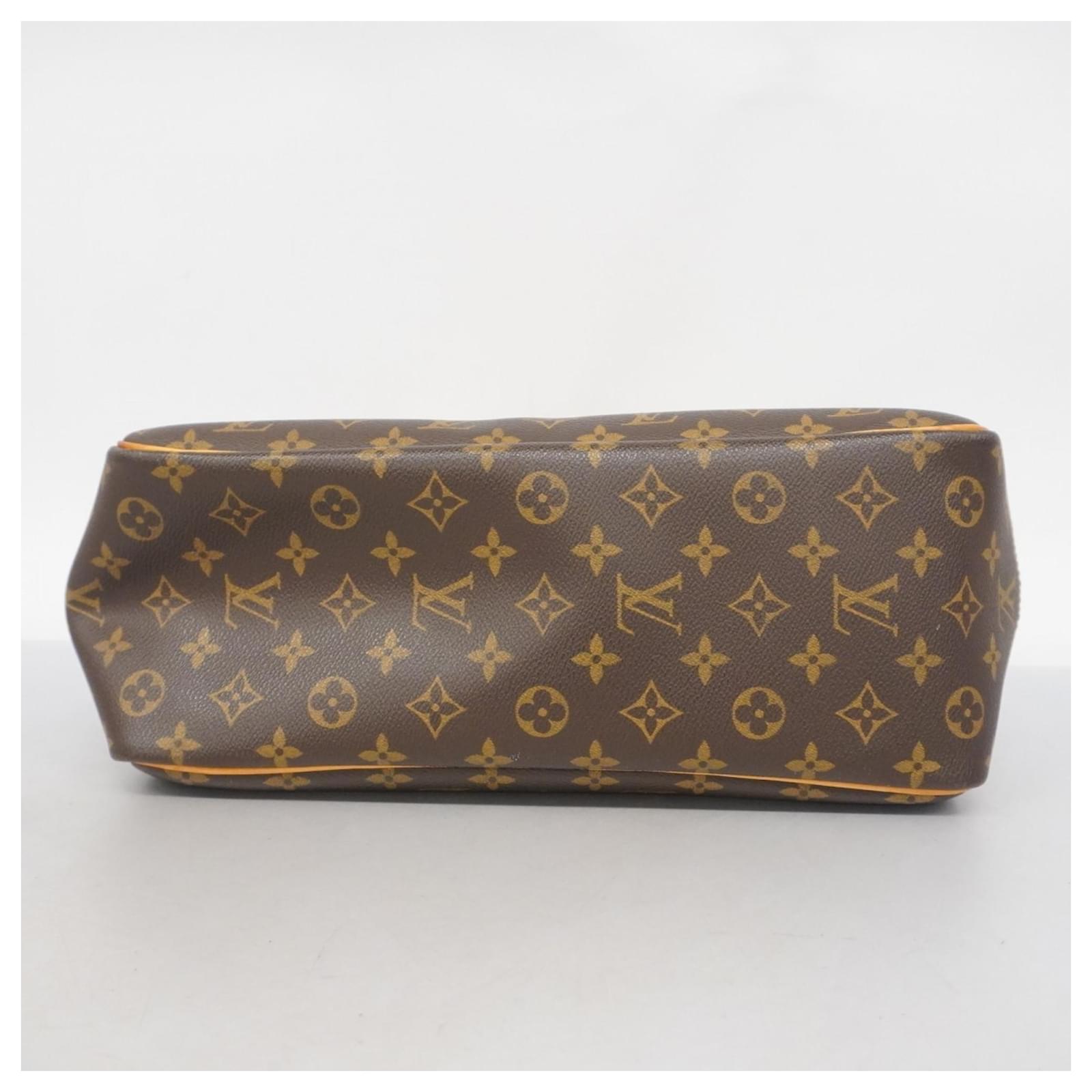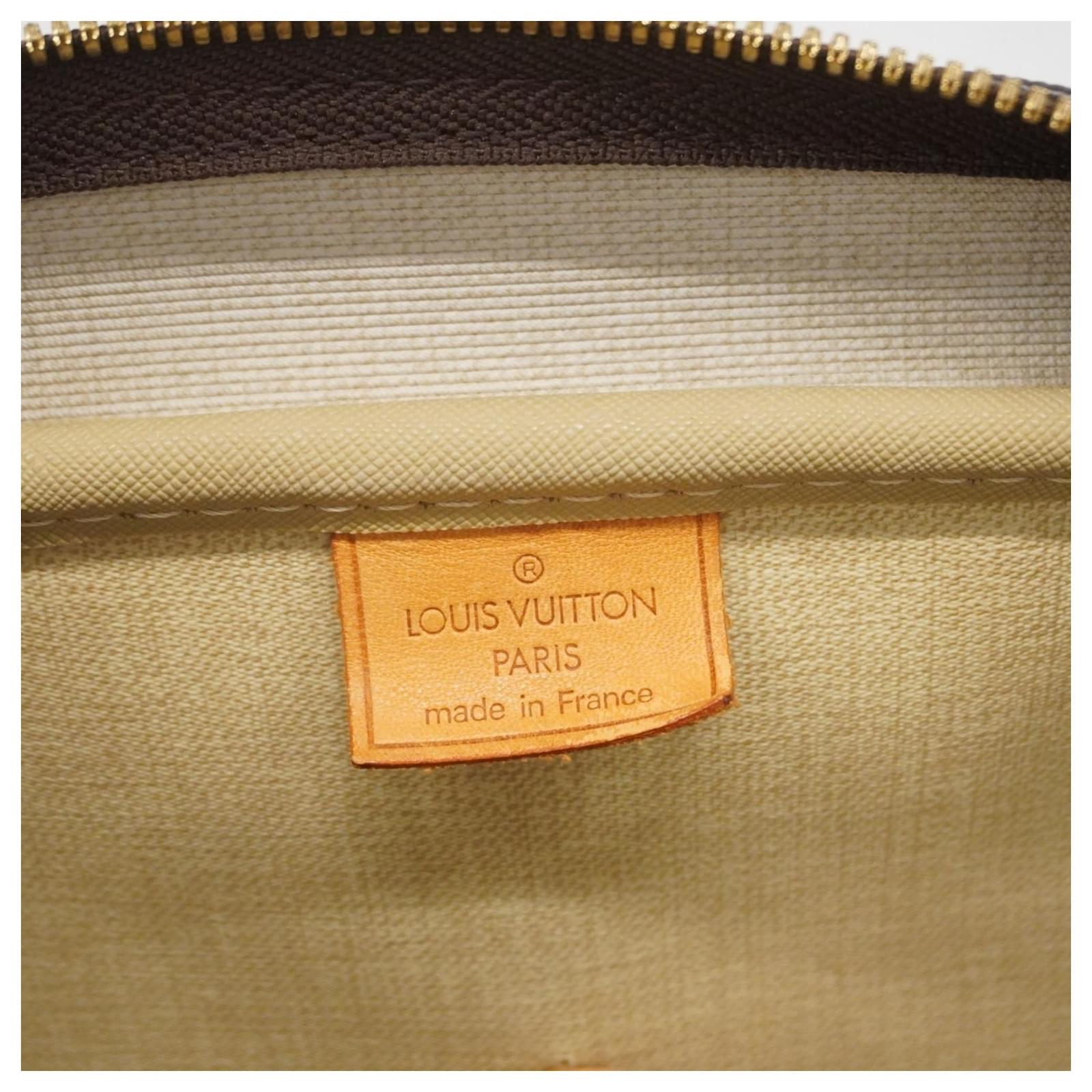 This Louis Vuitton handbag, model Monogram Deauville M47270, is designed for ladies and comes in a classic brown color. It is a used item in good condition, classified as Rank AB, indicating slight traces of usage, including minor scratches and dirt. The handbag features initials \”M.T\” inscribed on it. Included with the handbag are a name tag and a padlock. Potential buyers are encouraged to review the images for a detailed view of the item’s condition and included accessories.