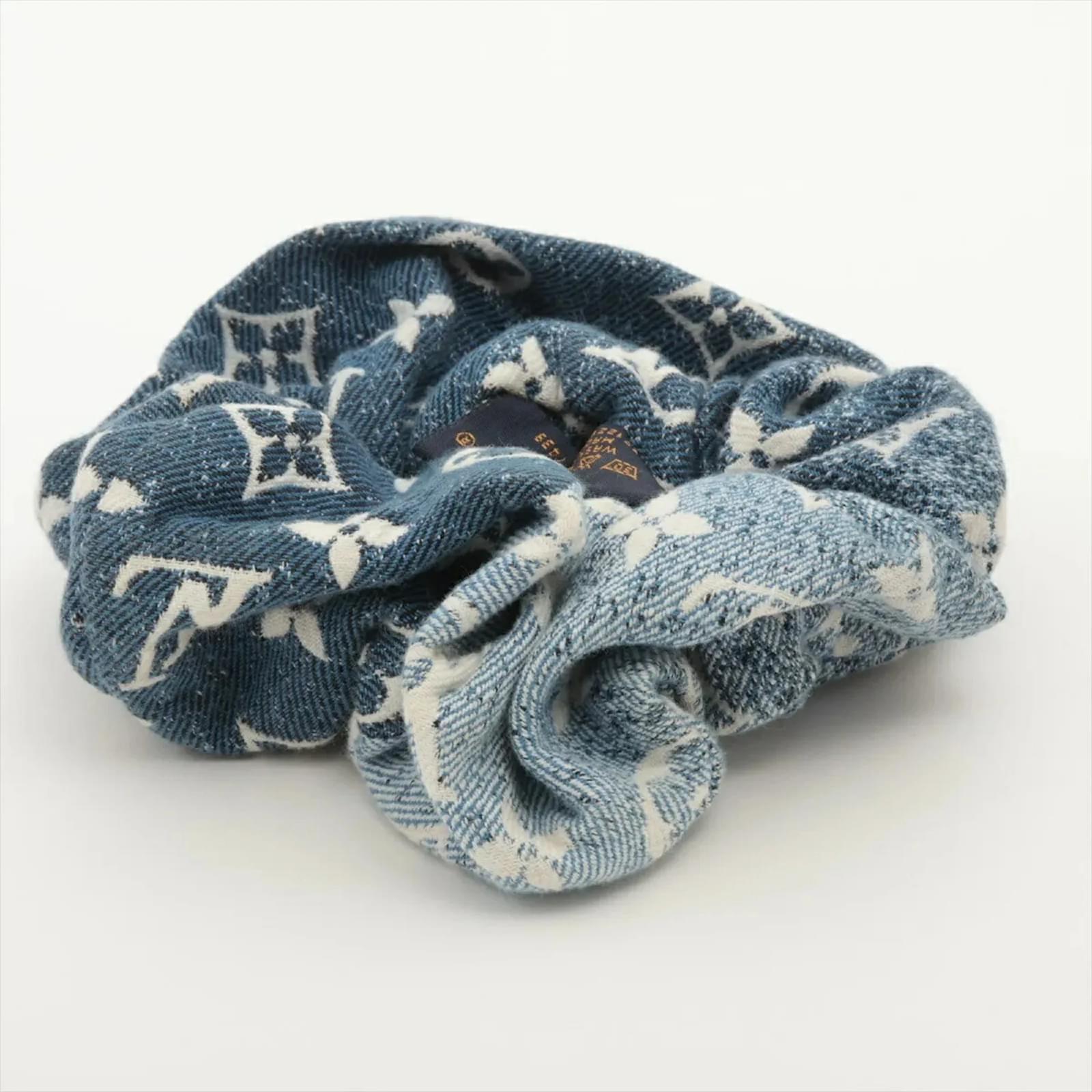 This Louis Vuitton scrunchie is crafted from a blend of cotton and monogram denim, featuring a stylish blue color. Measuring 4cm (1.57 inches) in size, it serves as a fashionable hair tie accessory for women. Made in Italy, this item is classified as used but remains in very good condition, with only insignificant traces of use, scratches, or dirt. Potential buyers are encouraged to review the provided images for a detailed view of the item’s condition.