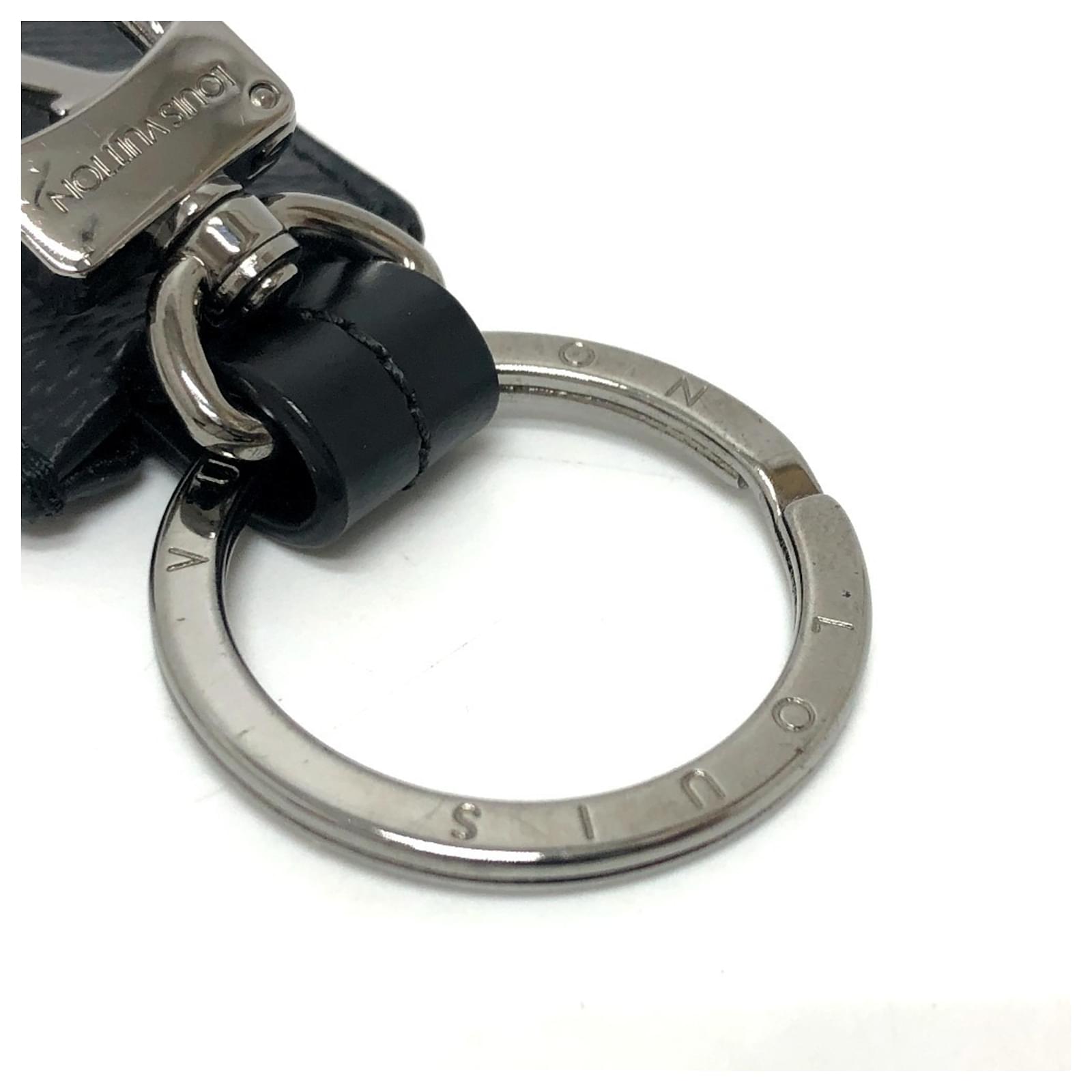This Louis Vuitton keyring, model M63620, features a sleek black design crafted from Monogram Eclipse canvas. It serves as a stylish bag charm, suitable for men’s accessories. The item is in used condition, rated as \”like new\” with hardly any traces of usage, and is classified as Rank SA, indicating it is a nice item or possibly refurbished. The overall condition shows insignificant traces of use, scratches, and dirt. Please refer to the images for a detailed view of the item’s condition and included accessories, as none are provided with the keyring.