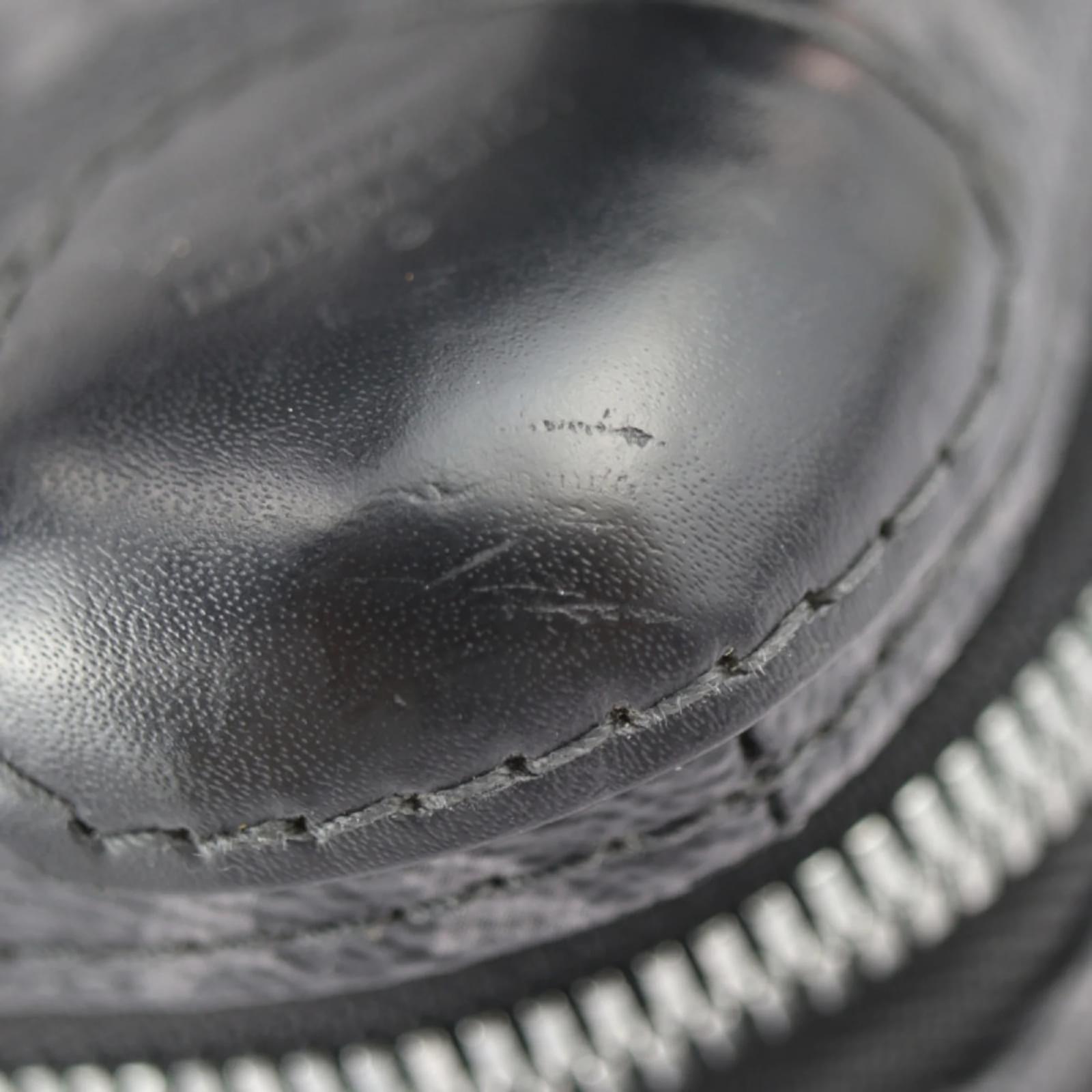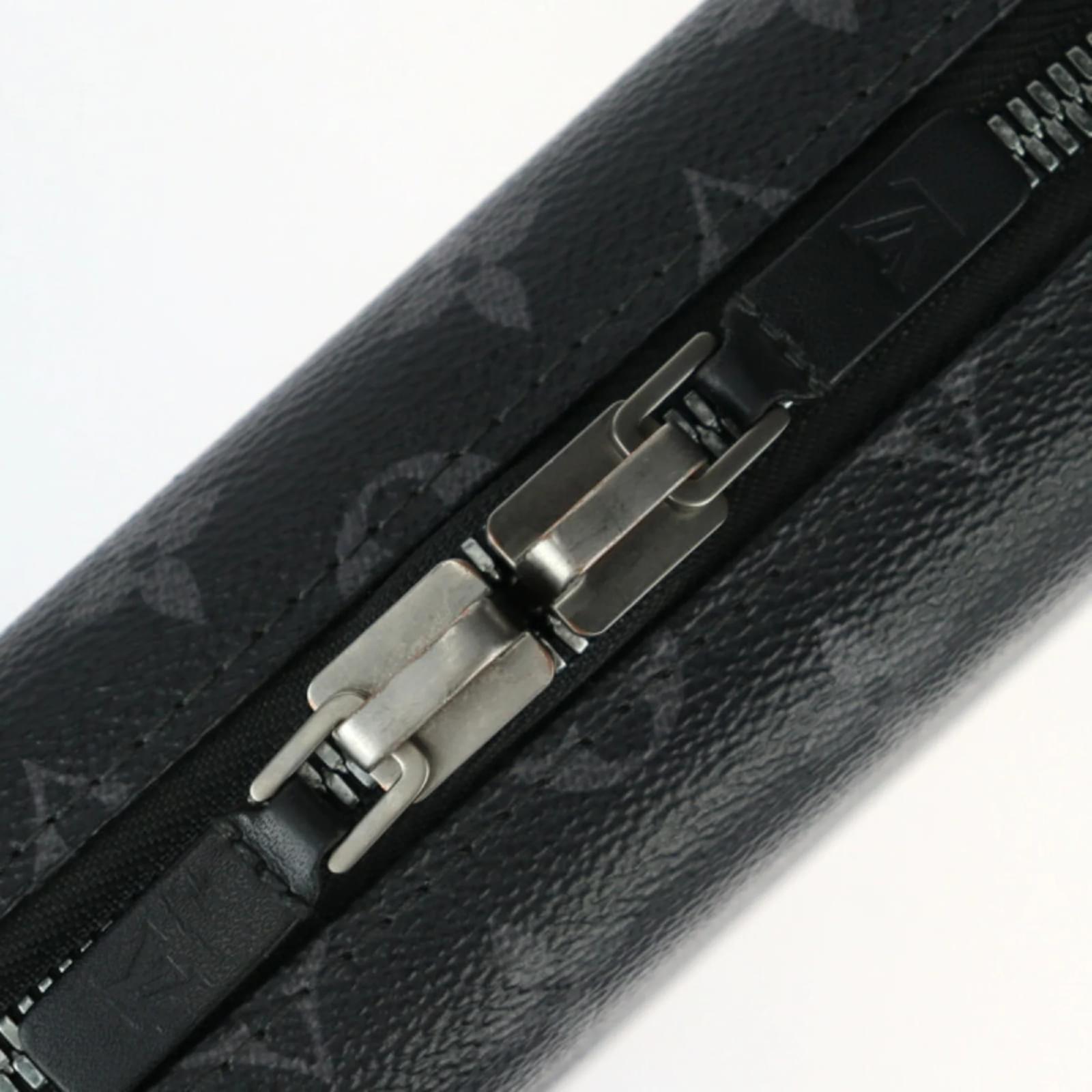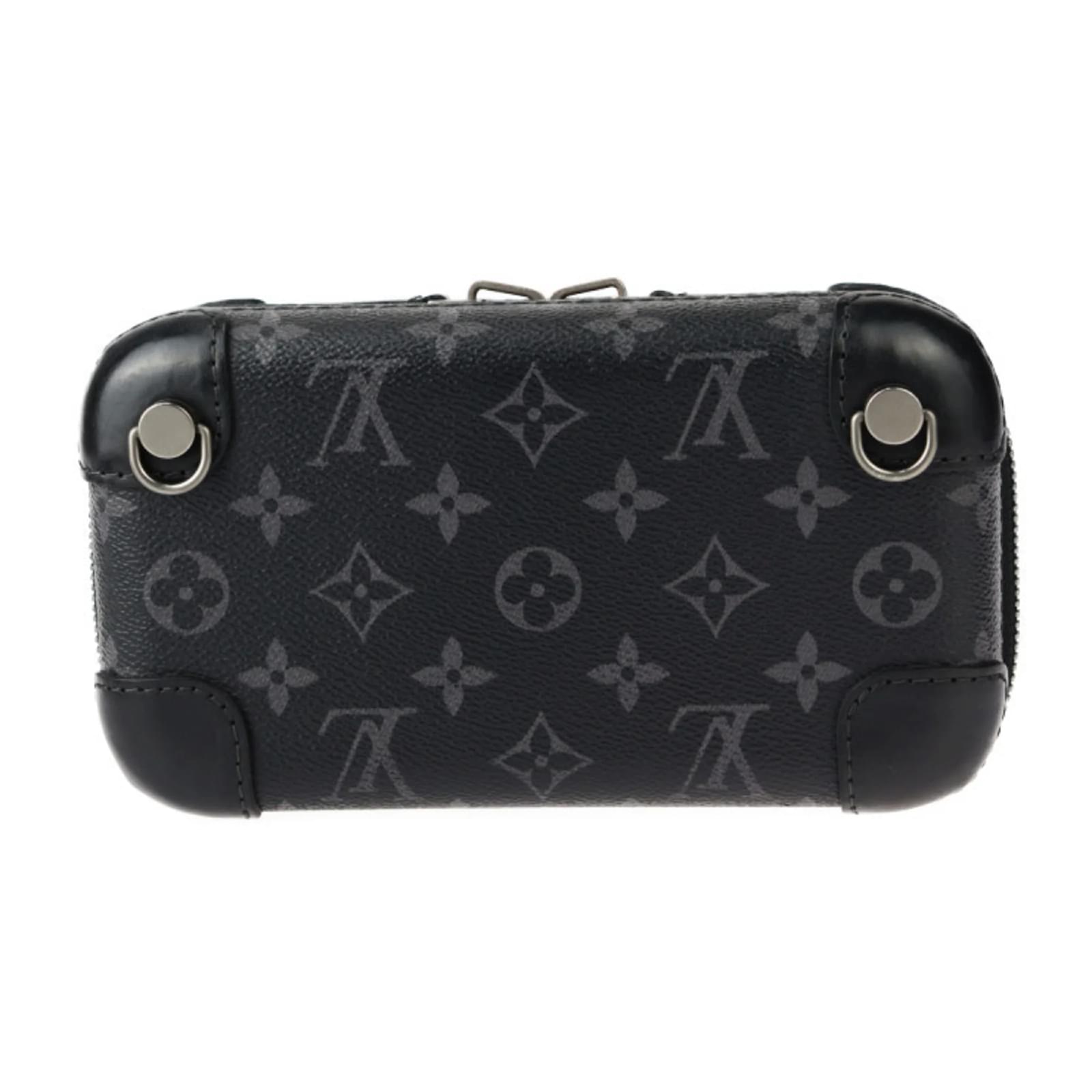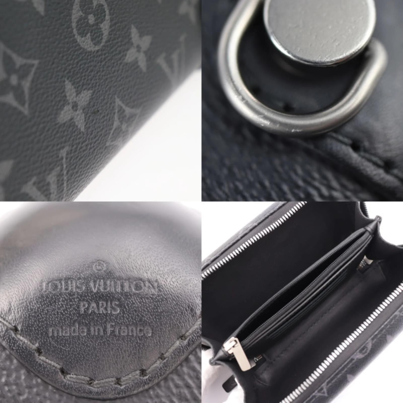 This Louis Vuitton Monogram Eclipse Shoulder Bag, also known as the Horizon Clutch, is crafted from a combination of PVC and leather in a sleek black and gray color scheme. The bag features silver hardware and measures 12cm in height, 21cm in width, and 7cm in depth, with a strap length of 128cm for versatile carrying options. \n\nOriginating from France, this item is classified as used but remains in good condition, showing slight traces of use, including minor scratches and dirt. It comes with a shoulder strap and is part of the Monogram Eclipse line. Potential buyers are encouraged to review the provided images for a detailed view of the item’s condition and included accessories. The bag also features an RFID serial number for authenticity.