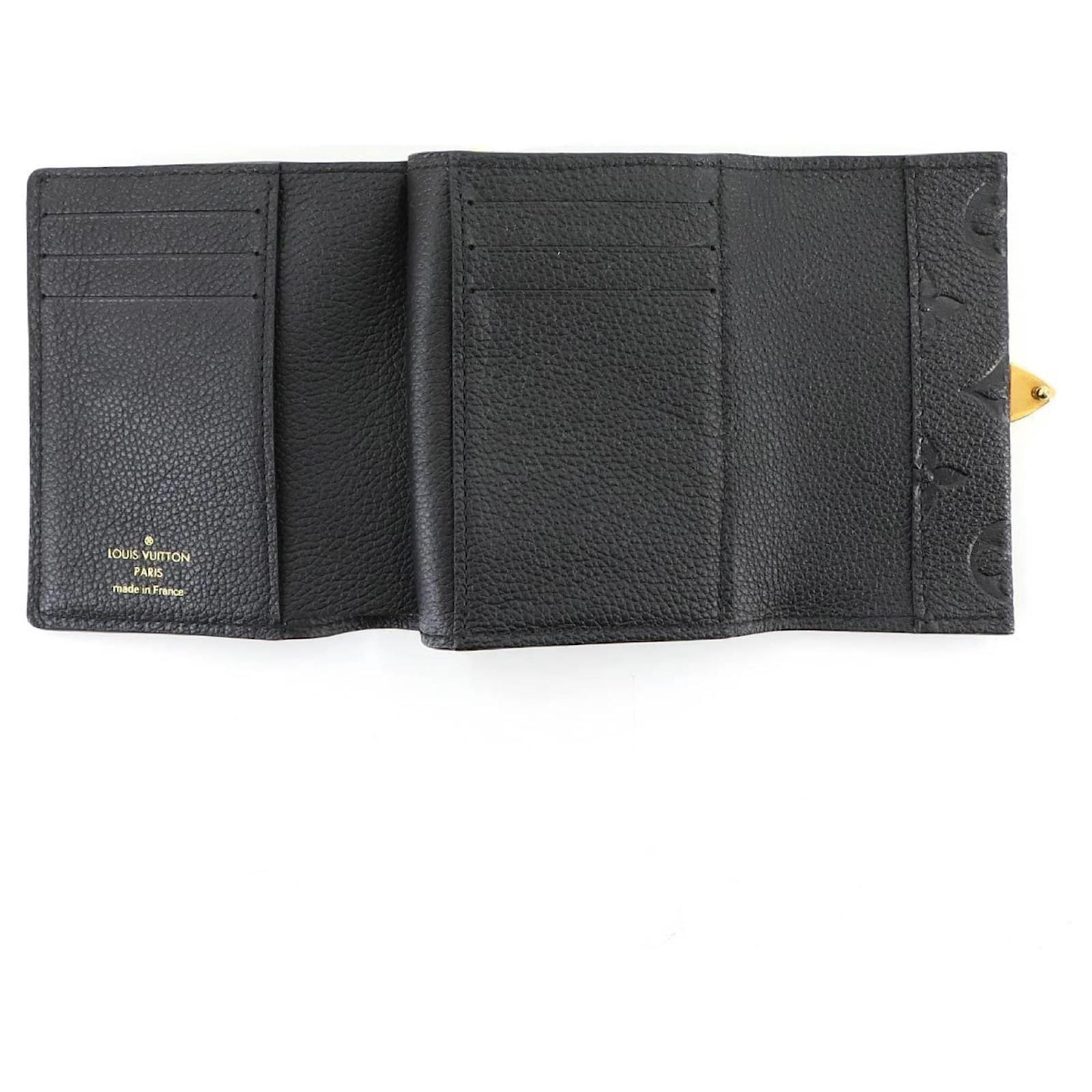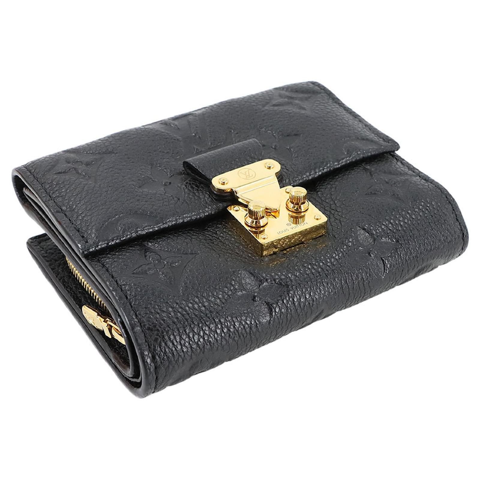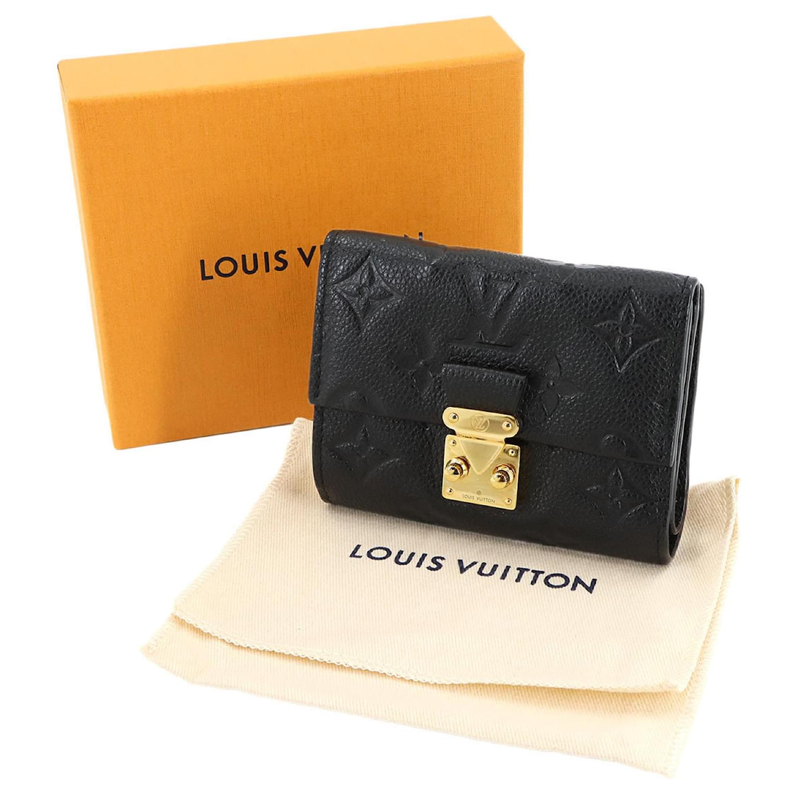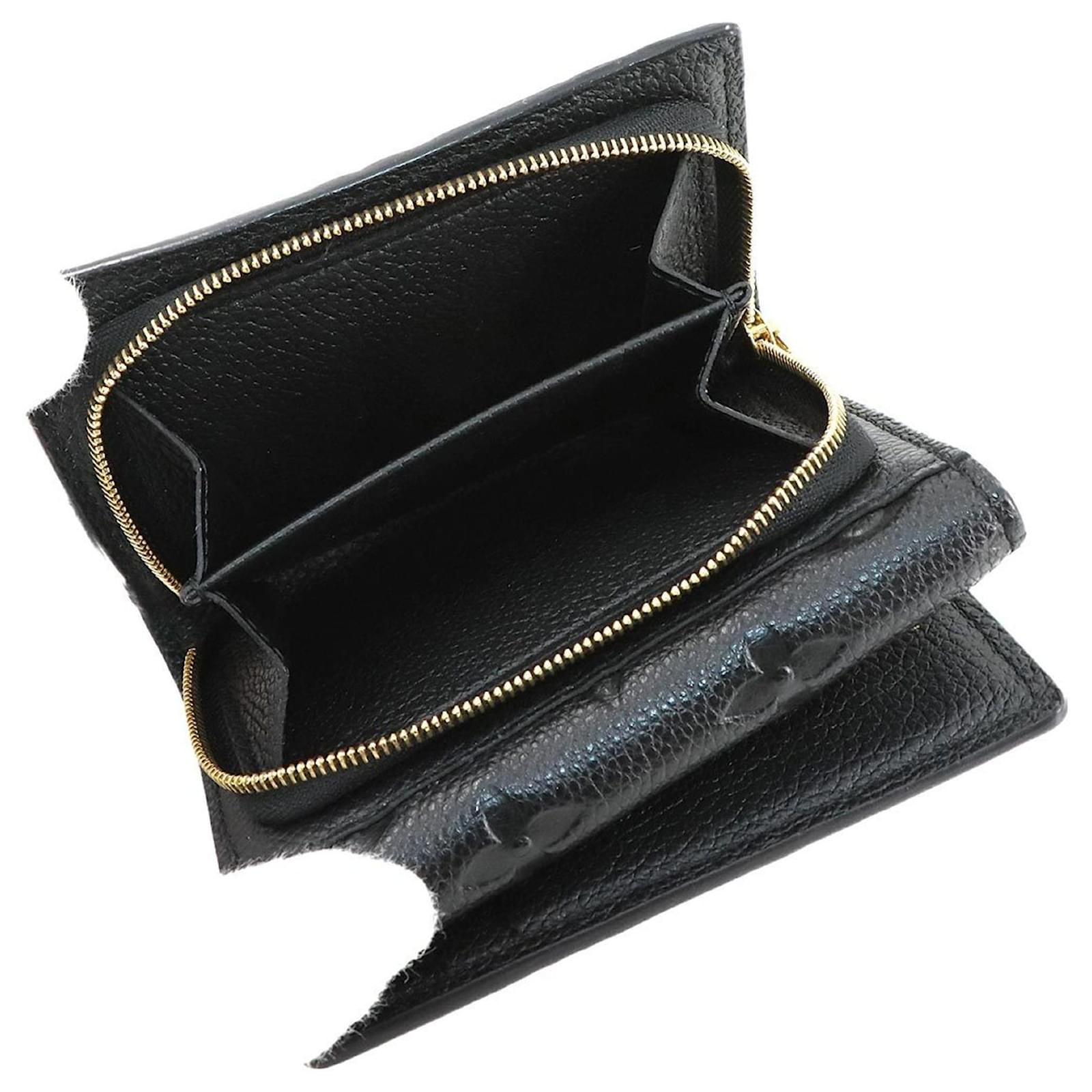 This Louis Vuitton tri-fold wallet, crafted from Monogram Empreinte leather in a classic Noir color, measures 9cm x 11cm x 2.5cm. It is designed for practicality and style, featuring RFID protection. The wallet is in used condition, rated as Rank S, indicating it is in mint condition with insignificant traces of use, including minimal wear on the card case. Included with the wallet are a box and a dust bag. For a complete understanding of its condition, potential buyers are encouraged to review the provided images.