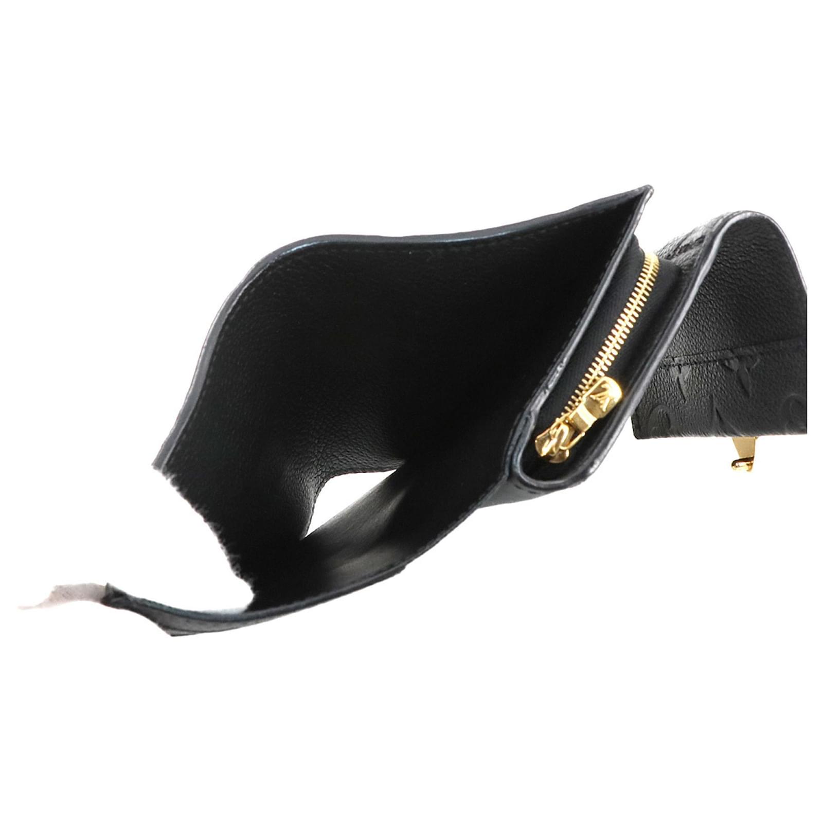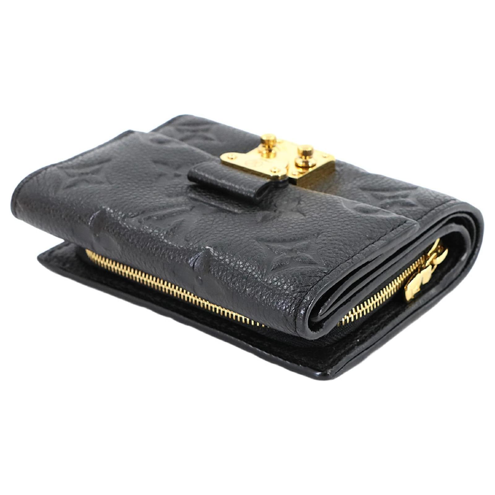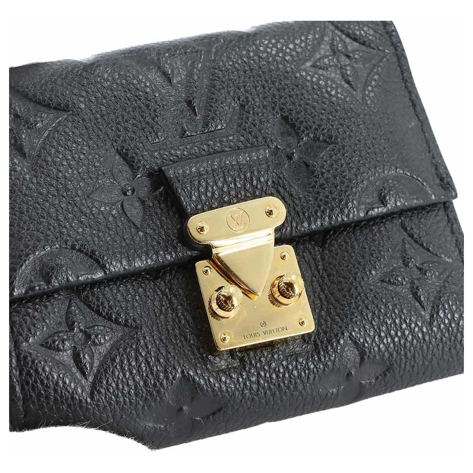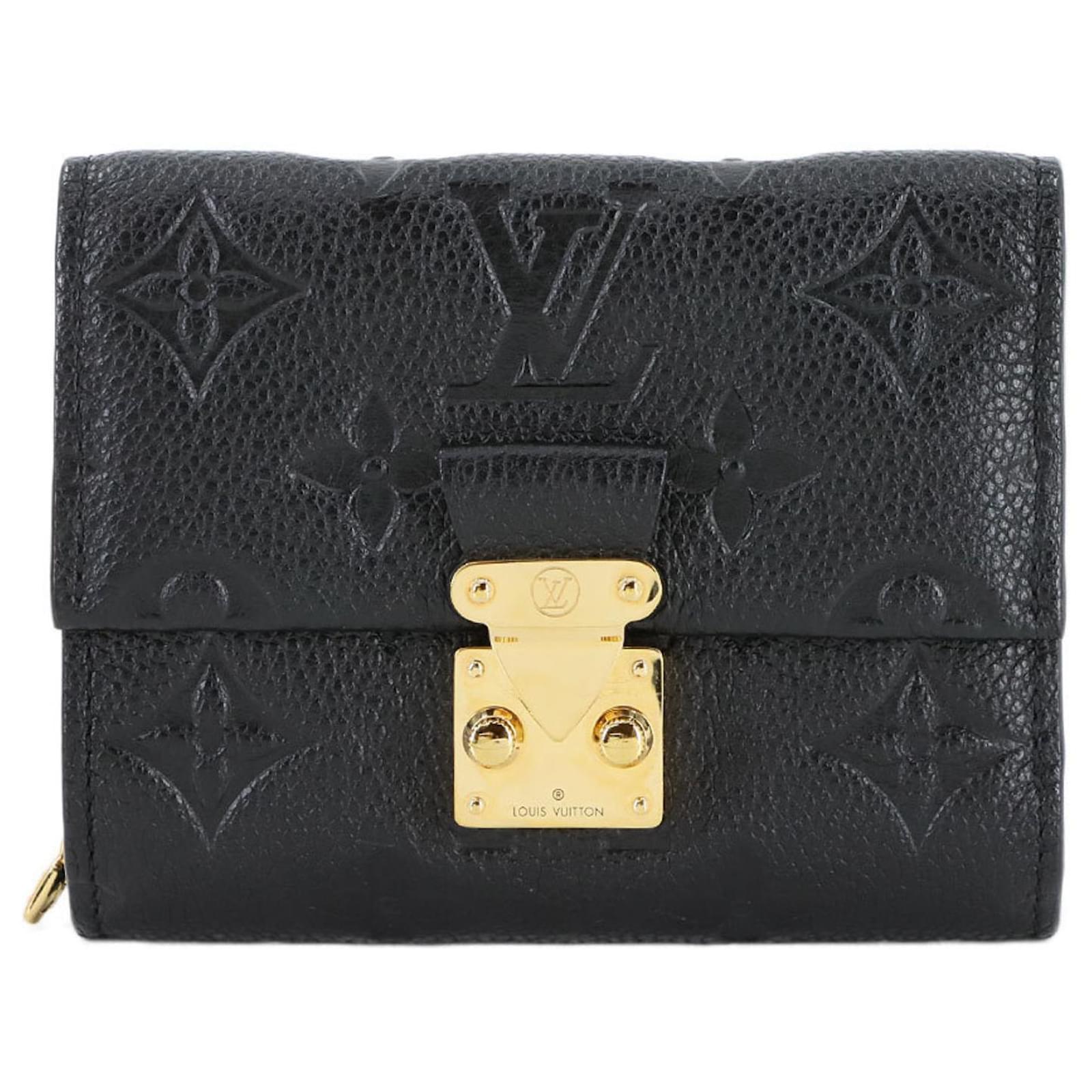 This Louis Vuitton tri-fold wallet, crafted from Monogram Empreinte leather in a classic Noir color, measures 9cm x 11cm x 2.5cm. It is designed for practicality and style, featuring RFID protection. The wallet is in used condition, rated as Rank S, indicating it is in mint condition with insignificant traces of use, including minimal wear on the card case. Included with the wallet are a box and a dust bag. For a complete understanding of its condition, potential buyers are encouraged to review the provided images.