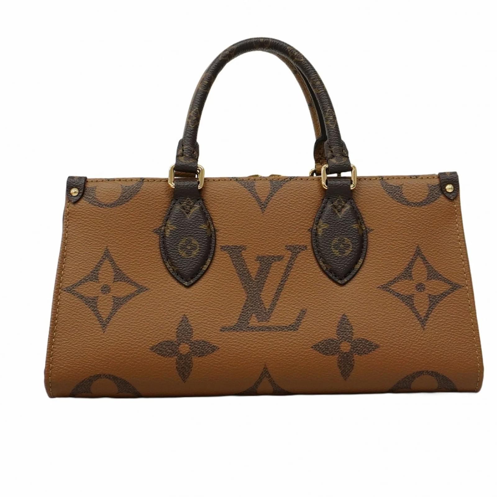 This Louis Vuitton handbag, model Monogram Giant Reverse On the Go EW (M46653), is designed in a classic brown color. It is categorized as a ladies’ handbag and is in very good used condition, with insignificant traces of use, scratches, and dirt. The seller ranks it as Rank A, indicating minimal wear. Included with the handbag are a box, dust bag, pouch, and shoulder strap. Potential buyers are encouraged to review the images for a detailed view of the item’s condition and included accessories.