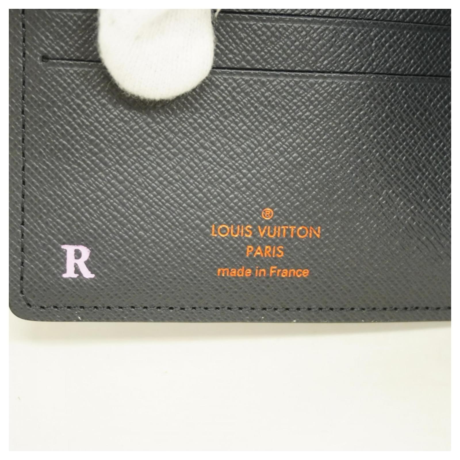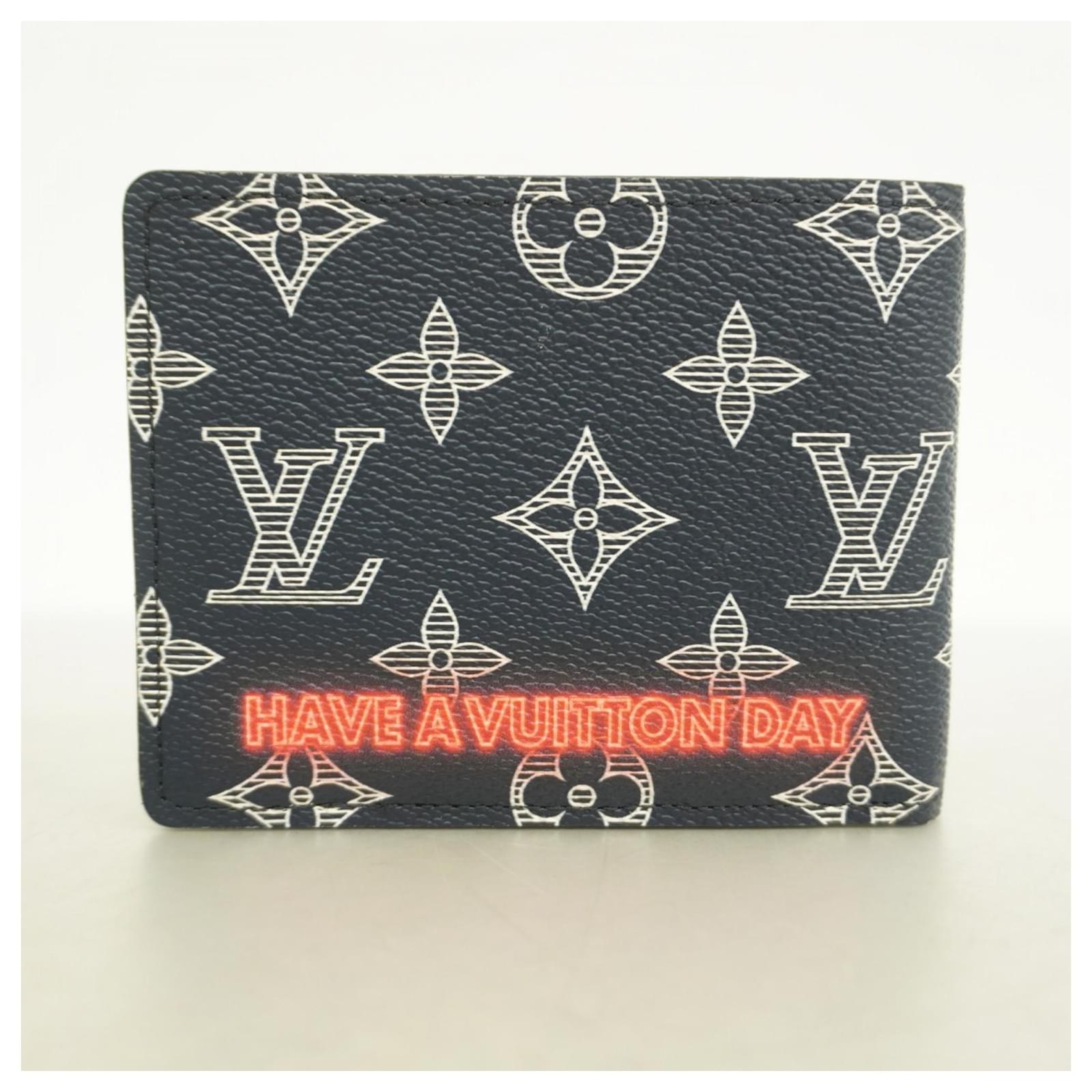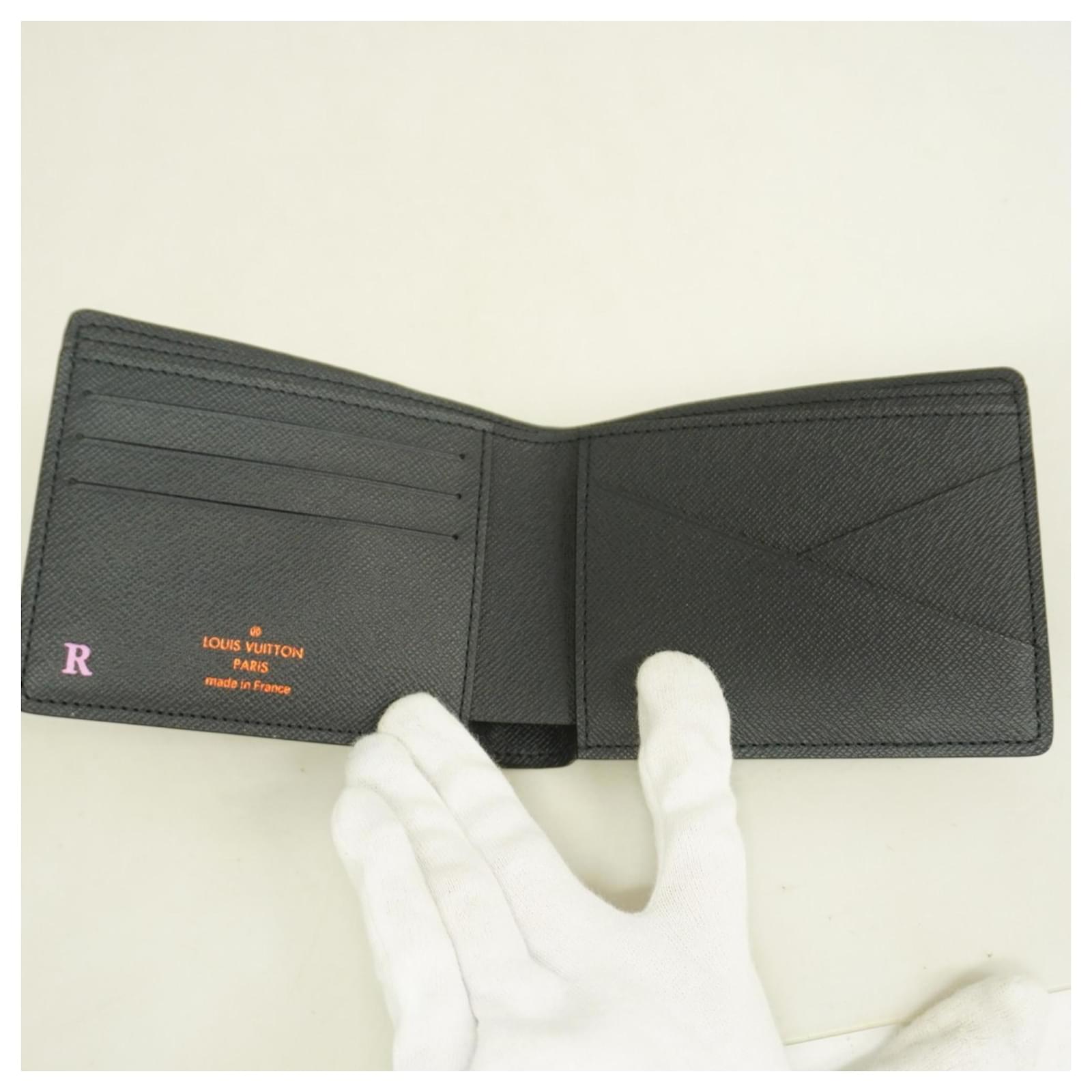 This Louis Vuitton bi-fold wallet, known as the Monogram Ink Upside Down Portefeuille Multiple M62891, features a navy and red color scheme. It is designed for men and is categorized as used but in very good condition, with minimal traces of use, including insignificant scratches and dirt. The wallet comes with a box and dust bag, and potential buyers are encouraged to review the images for a detailed view of its condition and included accessories.