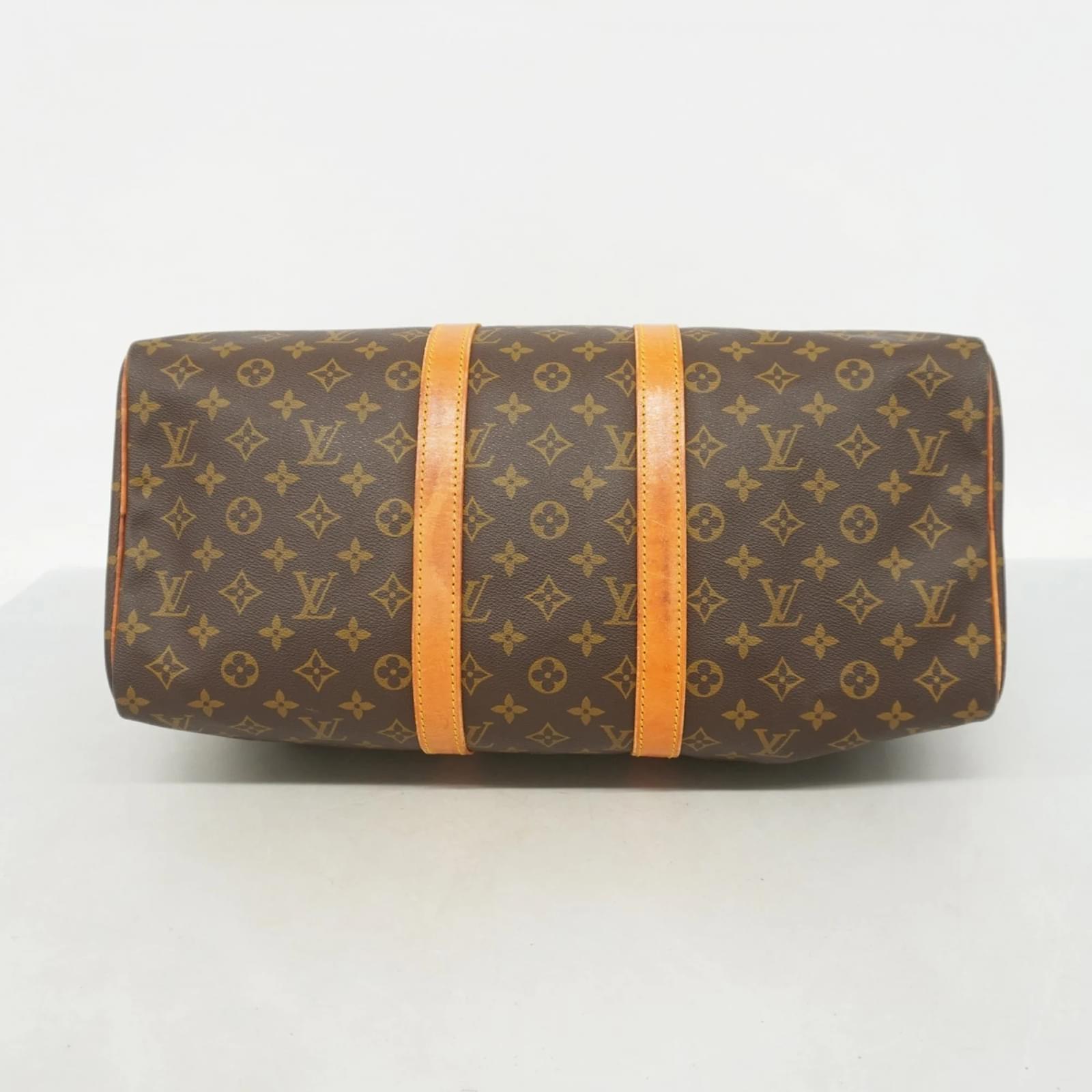 The Louis Vuitton Boston Bag Monogram Keepall 45, model M41428, is a versatile accessory suitable for both men and women. This bag features a classic brown color and is crafted from the iconic monogram canvas. \n\nIt is in used condition, classified as Rank AB, indicating that while there are traces of usage, including slight scratches and dirt, the bag remains in generally good shape. Potential buyers are encouraged to review the provided images to assess the exact condition. \n\nIncluded with the bag are a name tag, padlock, and handle holder, with images available for reference on these accessories.
