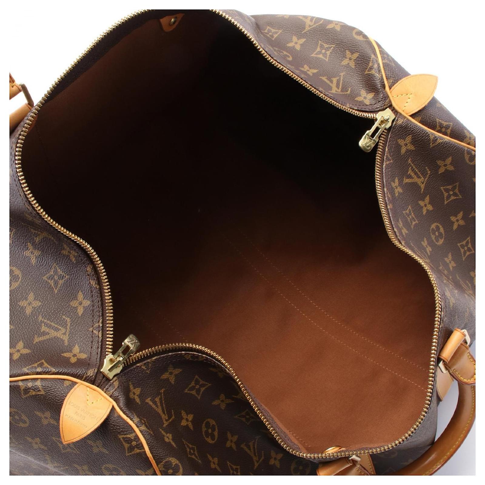 – General information -\nBrand : Louis VuittonItem name : Louis Vuitton Monogram Keepall 55 Boston Bag Brown M41424Model number : M41424 – Design -Type : Travel BagMaterial : CanvasColor : BrownGender : Male- Size -Size : Length : 56Depth : 25Height : 30Handle Drop : 34Item Material : Monogram PVC coated canvas × LeatherItem Series : KeepallItem Color : BrownClosure Type : Zipper- Inventory -Serial Number : SP0918SKU : 120210042075000A0025678981- Included Items -Accessories : null*Before purchasing, please refer to the images of the accessories included with the item.- Condition -Condition : Very Good ConditionRank : Used A Used condition with some scratches and stains.Condition Notice : Before purchasing, please refer to the images for the exact condition of the item. Measurments: width: 250 mm length: 560 mm height: 300 mm handle drop: 340 mm \n Product Id: 484272 \n