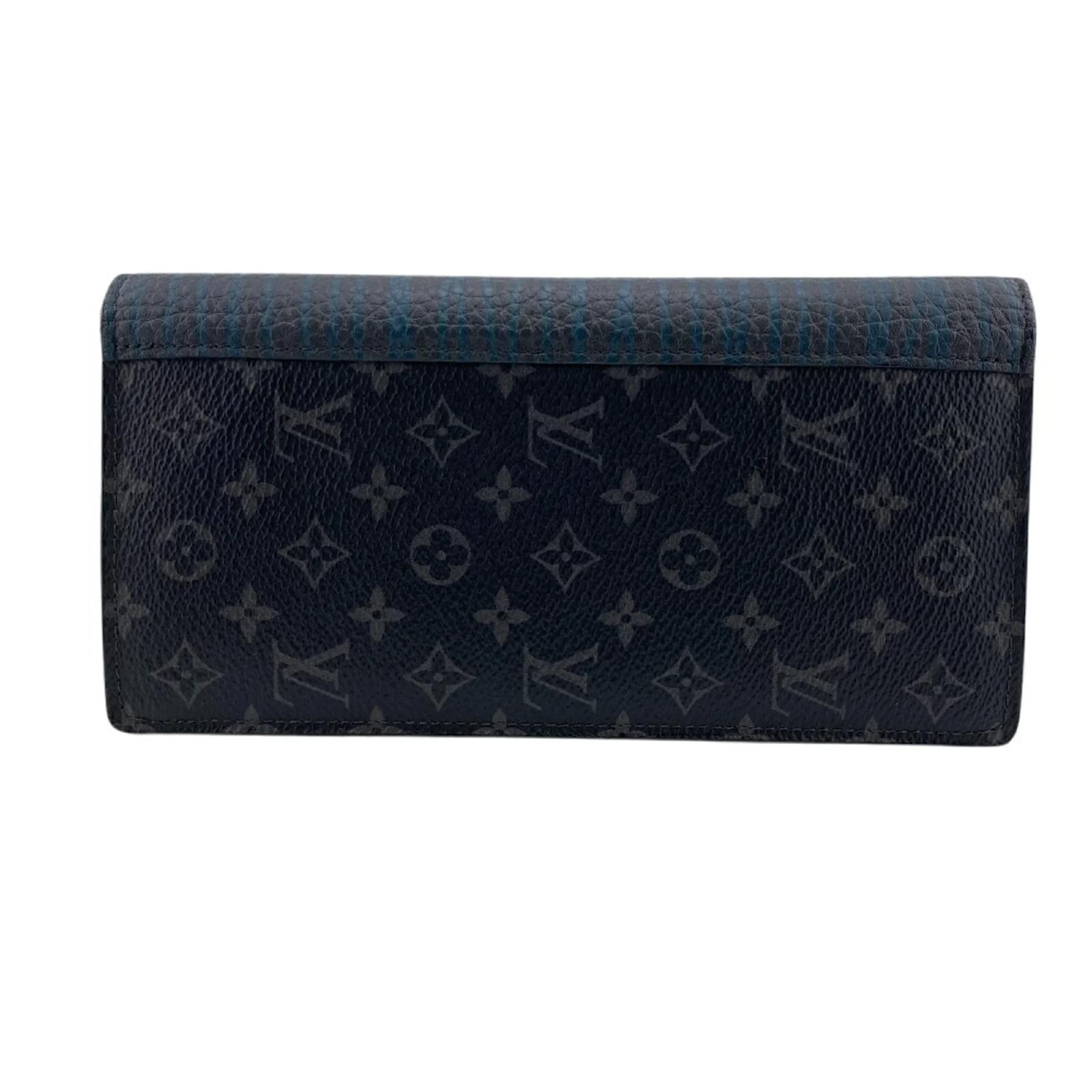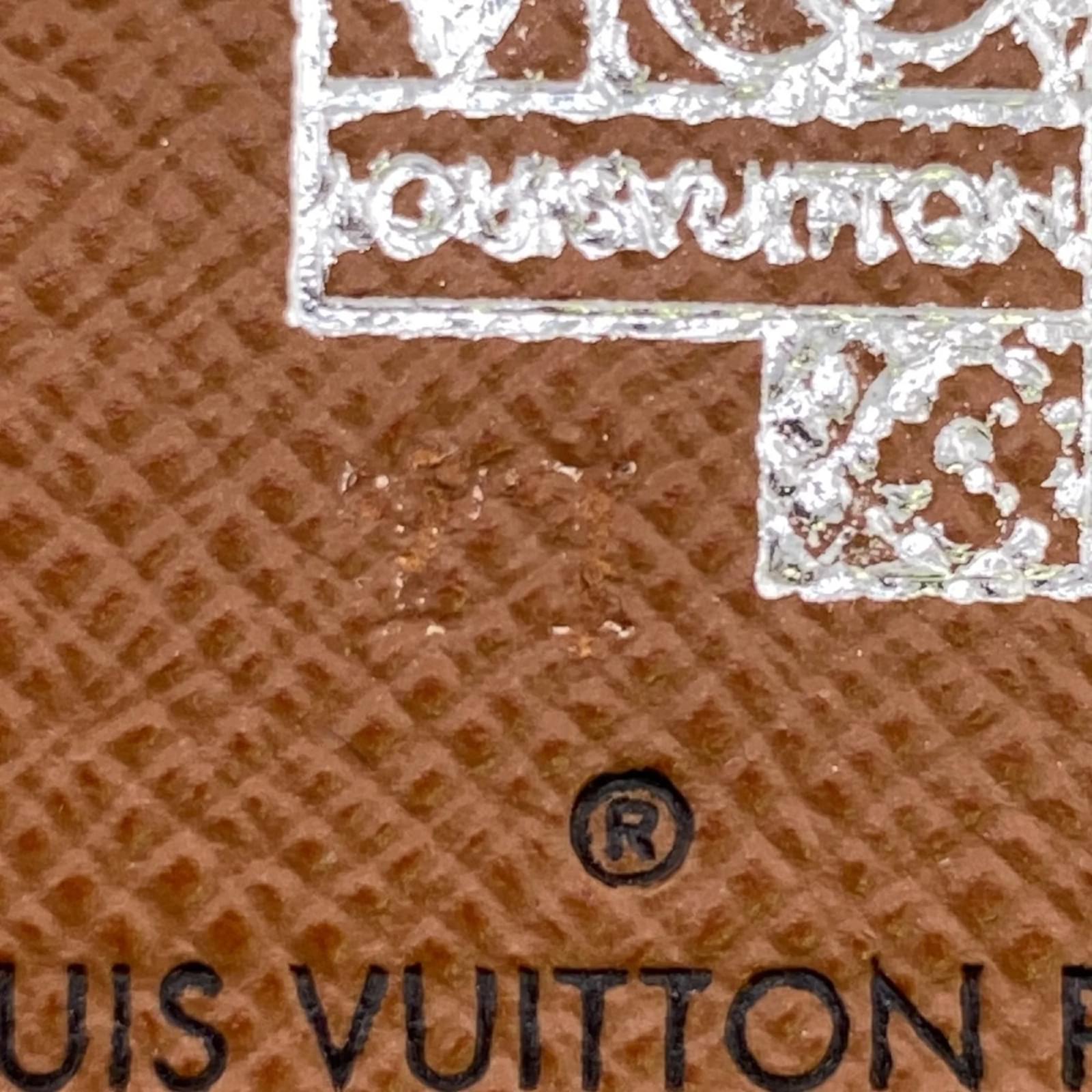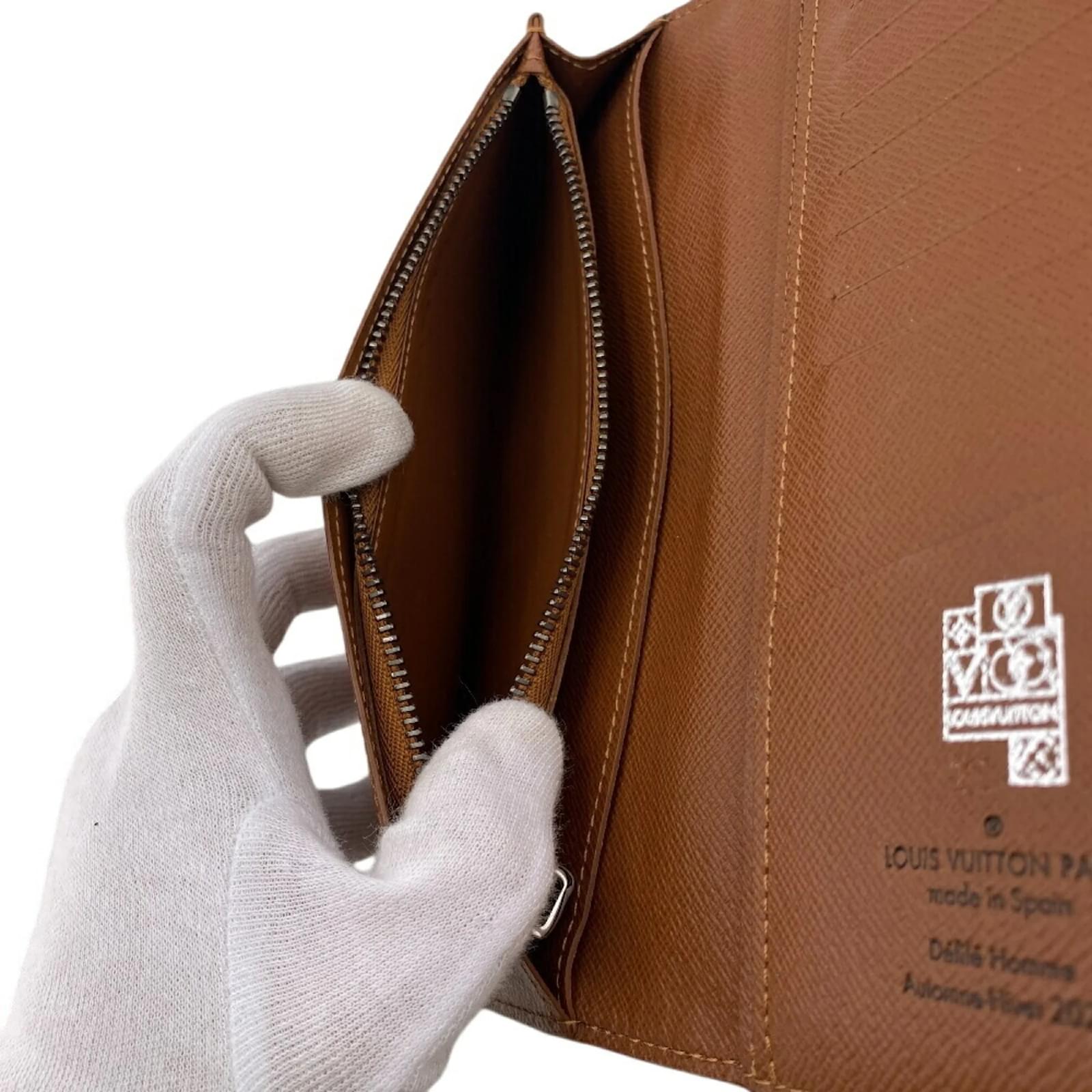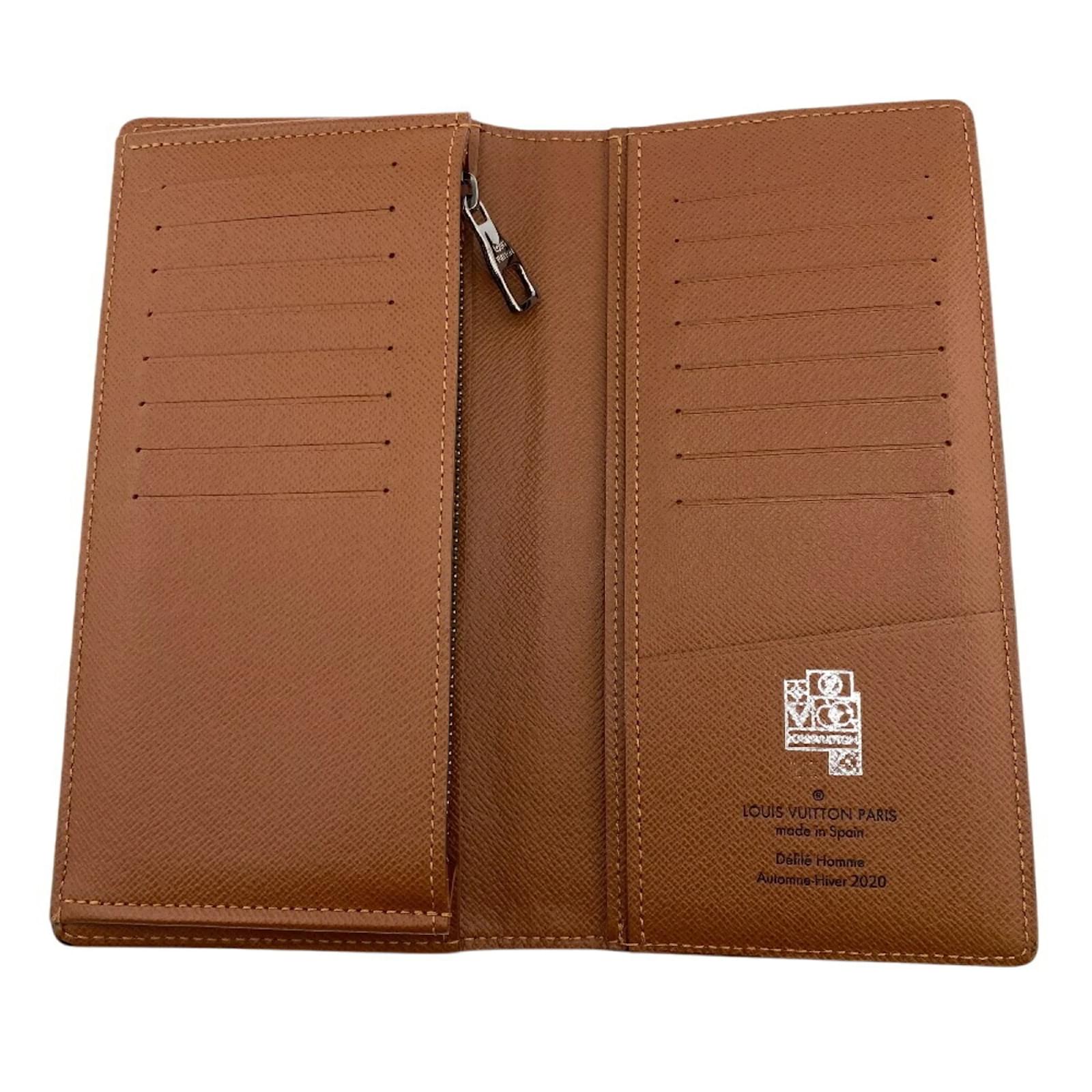 The Louis Vuitton Portefeuille Brother is a long bi-fold wallet crafted from Monogram material, featuring a flap closure. It comes in a classic black and monogram color scheme, measuring 19cm x 9.5cm (7.48” x 3.74”). This wallet includes multiple inner pockets such as a bill slot, coin purse, card slots, and an additional pocket for convenience. \n\nThis item is pre-owned and classified as used (good condition), with some visible traces of usage, including slight scratches and dirt. It is ranked as AB Used, indicating that while there are signs of wear, the wallet remains in generally good condition. The wallet is accompanied by a box and strap, and it originates from Spain. For a detailed view of its condition, potential buyers are encouraged to refer to the provided images.