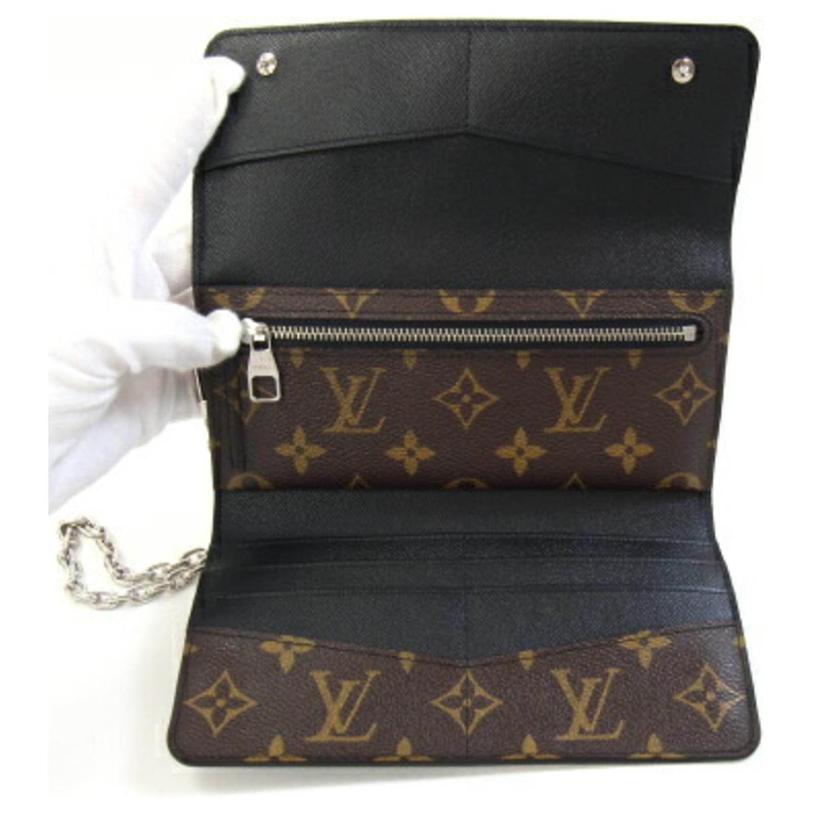 This Louis Vuitton tri-fold long wallet, model M60168, features a Monogram Macassar design and is crafted from high-quality materials. It includes a bill slot, a coin purse, eight card slots, and an additional pocket for convenience. The wallet measures 9.7 cm in height, 19 cm in width, and comes with a 40.5 cm chain for easy carrying. \n\nThe item is in used condition, rated as Rank S, indicating it is in mint condition with insignificant traces of use. It may have minor scuffs and hardware scratches, but overall, it presents well. The wallet comes with a box, dust bag, and wallet chain. For a complete understanding of its condition, potential buyers are encouraged to review the provided images. \n\nThis product is made in France and is part of the Monogram Macassar line by Louis Vuitton.