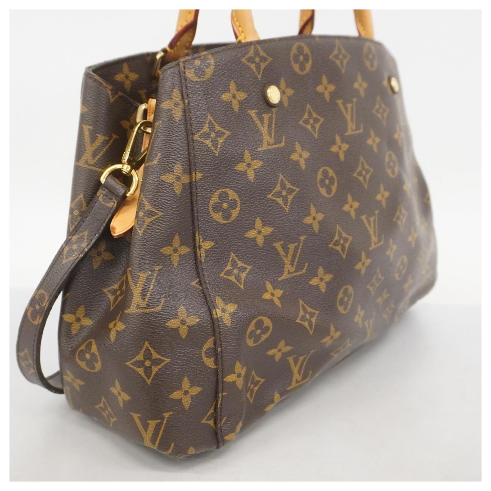 This Louis Vuitton handbag, model Monogram Montaigne MM M41056, is designed in a classic brown color. It is a women’s handbag that showcases the brand’s iconic monogram pattern. The item is used and classified in good condition, with slight traces of use, including minor scratches and dirt. The seller ranks it as Rank AB, indicating it has visible signs of wear but remains in generally good shape. Included with the handbag are a clochette, key, and shoulder strap. Potential buyers are encouraged to review the images for a detailed view of the item’s condition and included accessories.