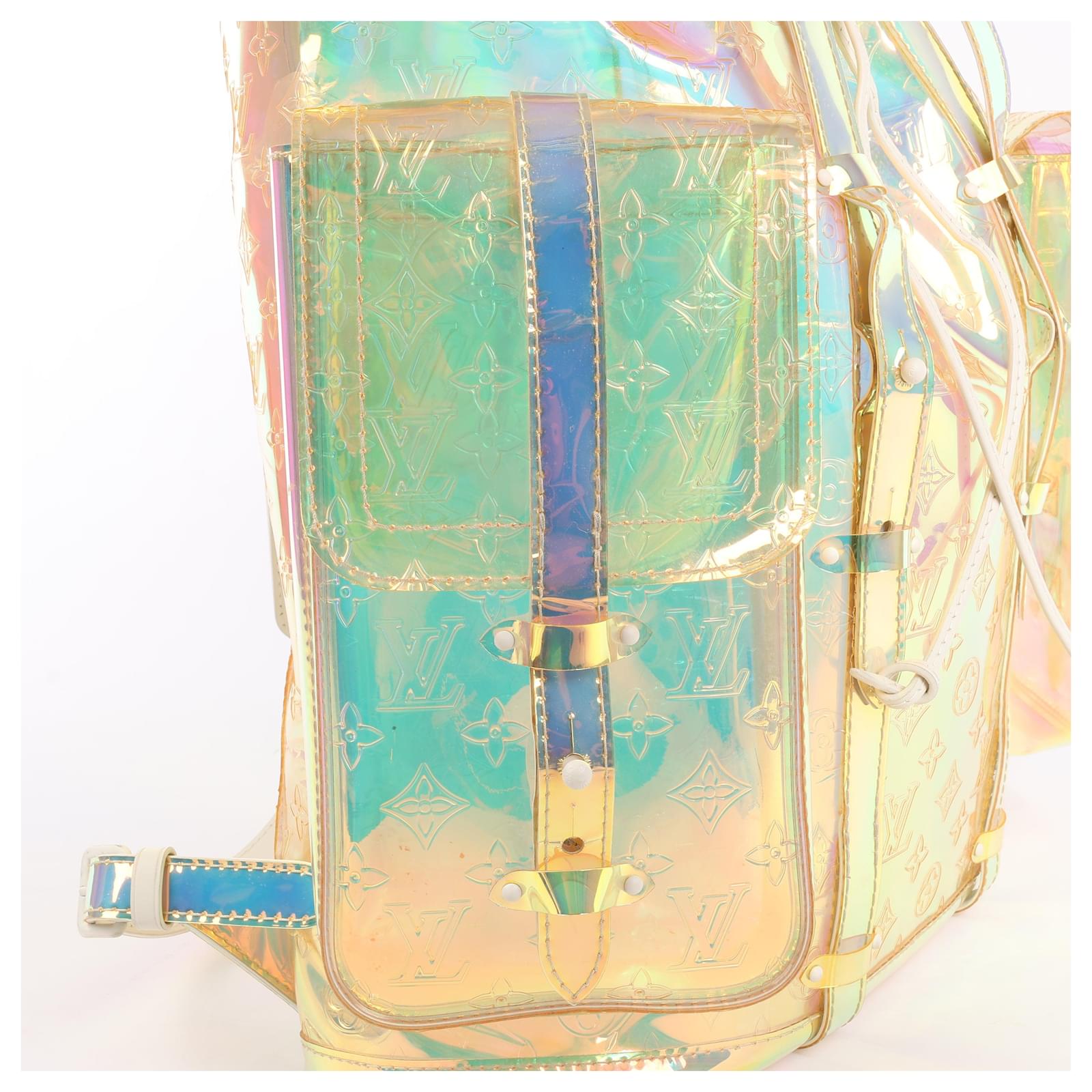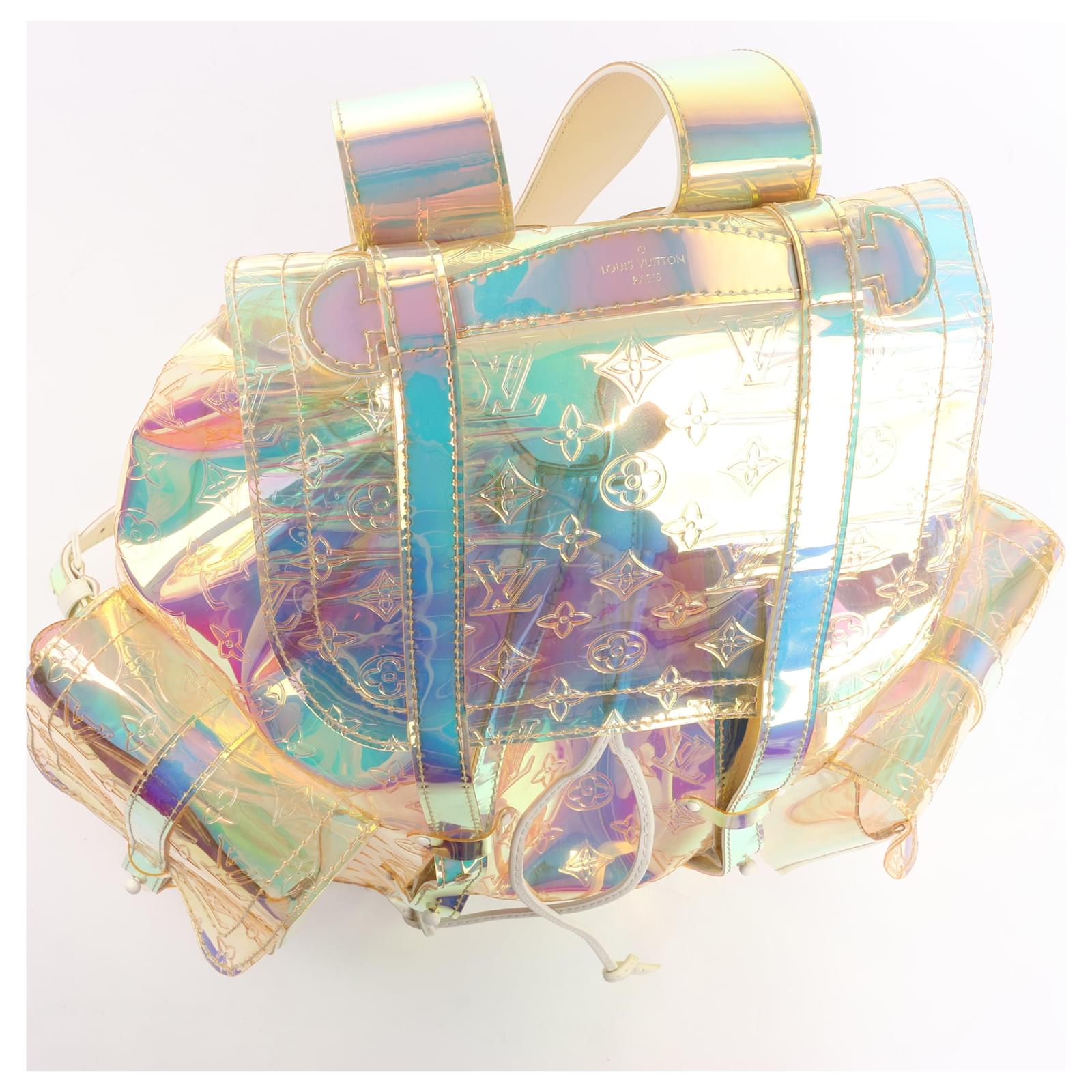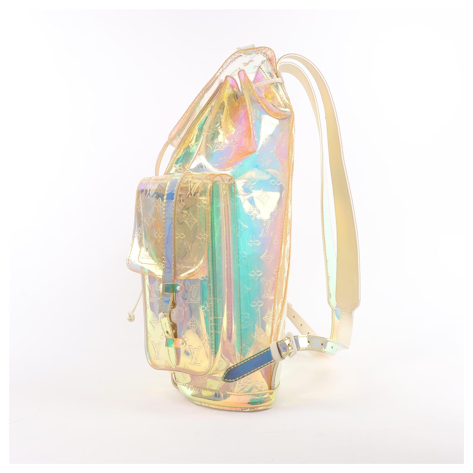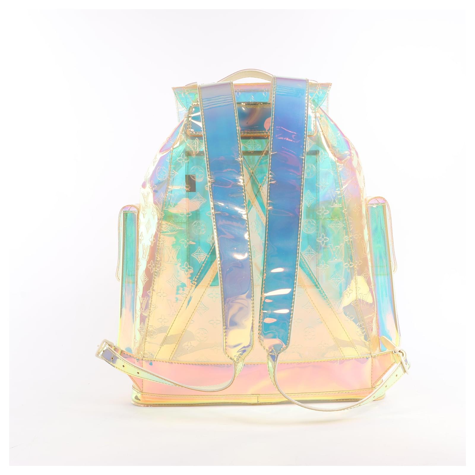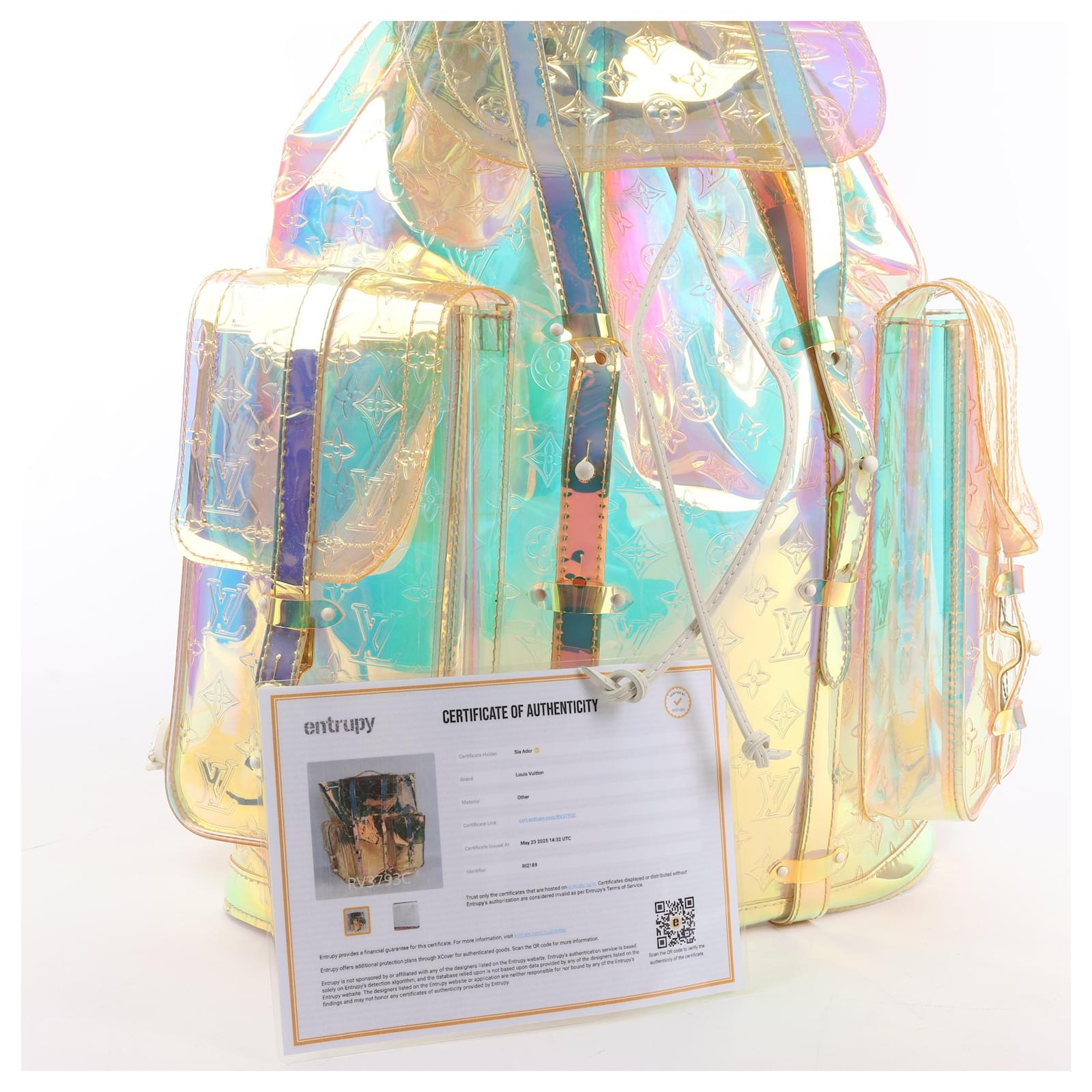 Louis Vuitton Monogram Prism Christopher GM Backpack in iridescent PVC with\niconic monogram embossing. A futuristic, statement-making design combining\nluxury and innovation with spacious, functional style. Model M44766.\nBrand: Louis Vuitton\nModel: Christopher\nSize: GM \nWidth: 39 cm\nHeight: 48.5 cm\nExterior Condition: Excellent\nInterior Condition: Excellent\nCondition Details: The exterior is beautiful in excellent condition except some\ndust, creases and scratches. The straps are clean and firm with light crease.\nThe hardware remains great condition. The interior in excellent condition. Date\ncode: RI2189, there was an RFID response.\nColour: Multicolor\nInterior Colour: Multicolor\nHardware Colour: White\nMaterial: Plastic\nComes With: Entrupy authentication certificate