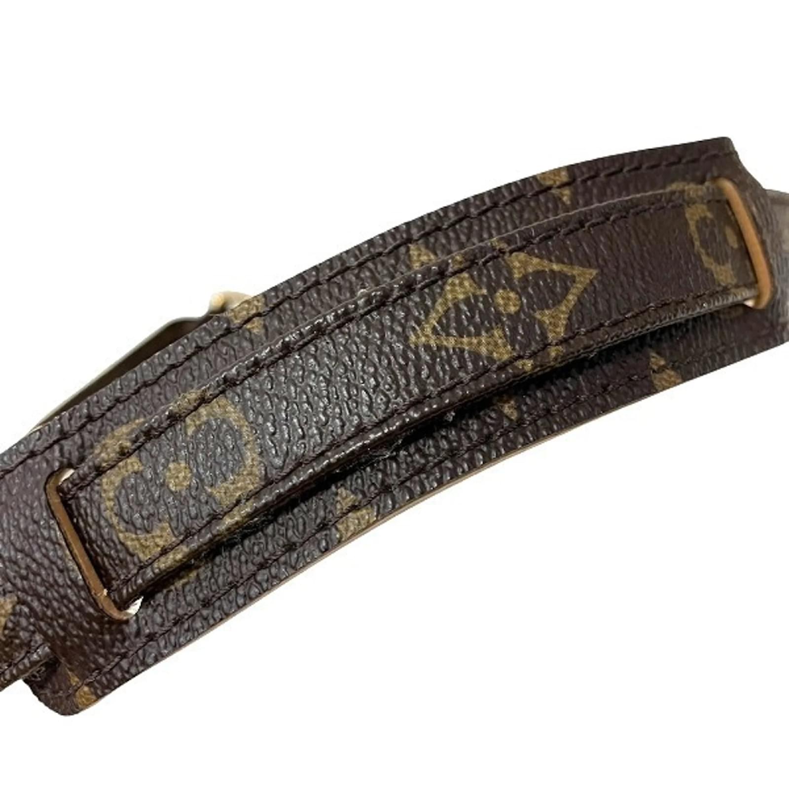 This Louis Vuitton Monogram shoulder strap is designed for both men and women, featuring a strap type in a classic brown color made from durable monogram material. The adjustable handle/strap length ranges from 92cm to 110cm (36.22” to 43.3”), allowing for versatile use. \n\nThe strap is categorized as used and is in acceptable condition, with traces of usage including slight loose threads and sun damage, as well as moderate metal discoloration. Potential buyers are advised to review the provided images for a clear understanding of the item’s condition. No additional accessories are included with this strap.