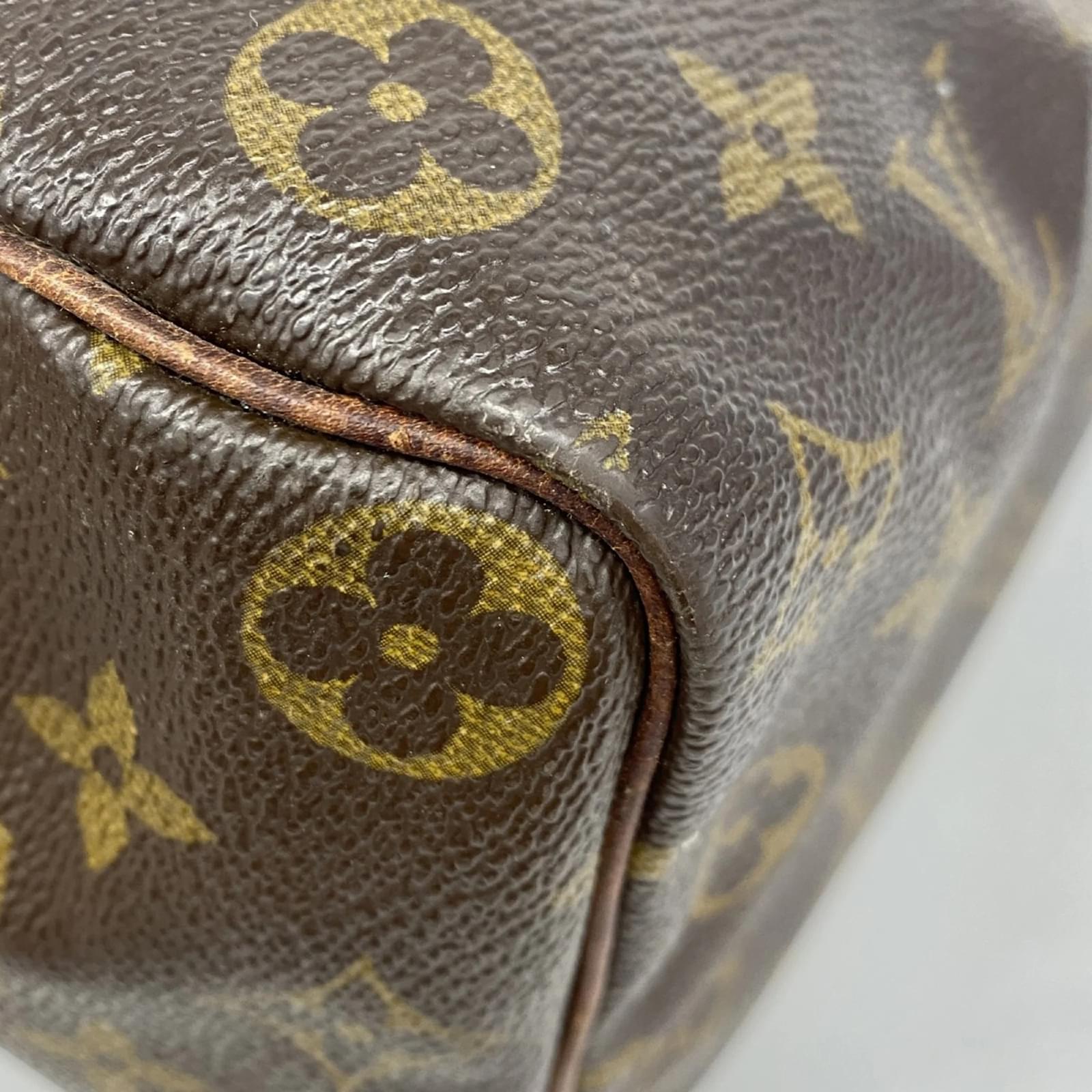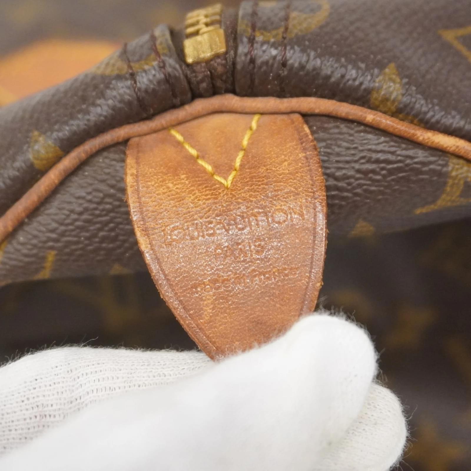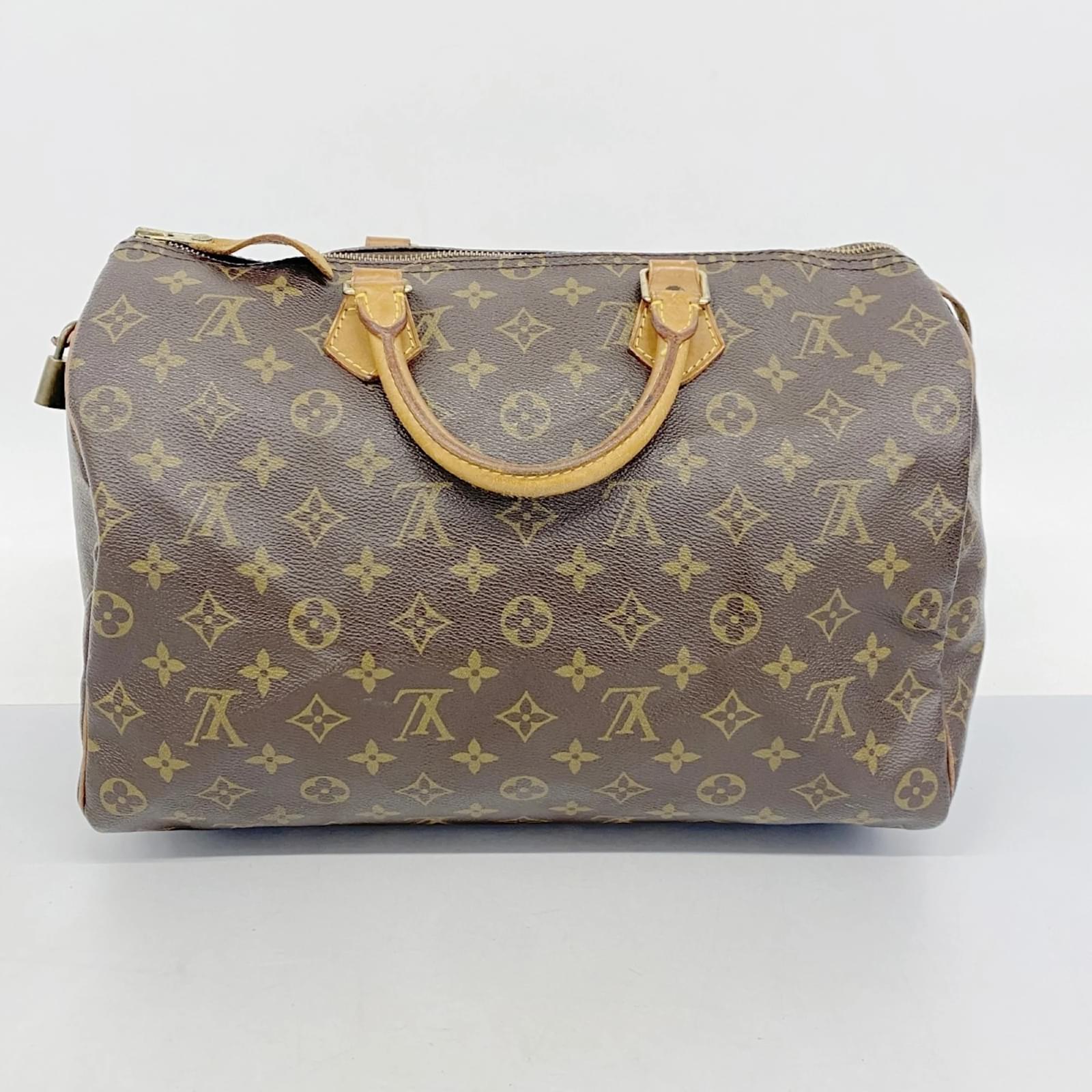 This Louis Vuitton handbag, model Monogram Speedy 35 (M41107), is designed for ladies and comes in a classic brown color. The bag is in used condition, classified as Rank AB, indicating it shows slight traces of usage, including minor scratches and dirt, but remains generally in good condition. \n\nIncluded with the handbag are a key and padlock, which are essential accessories for this model. Potential buyers are encouraged to review the images for a detailed view of the item’s condition and included accessories before making a purchase.