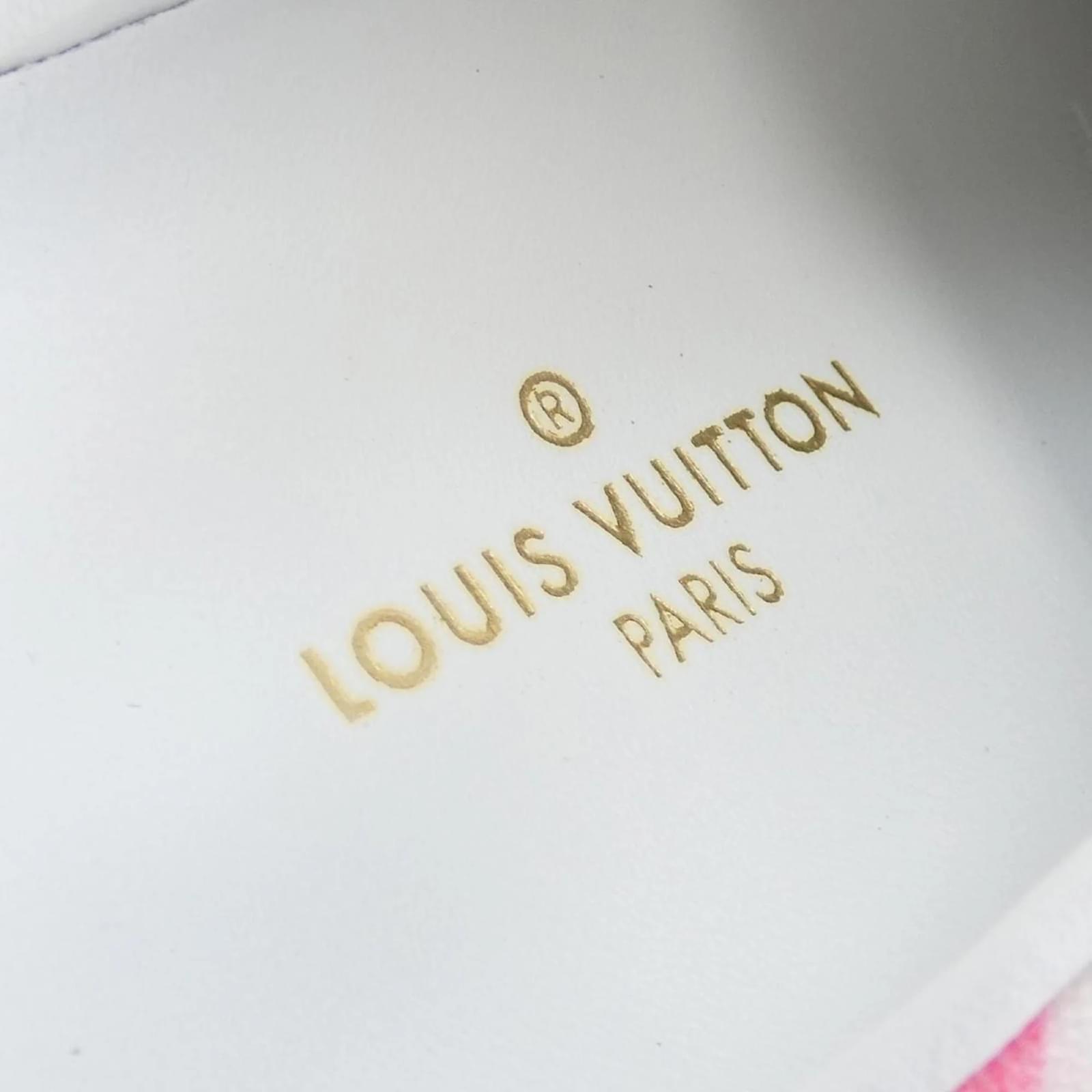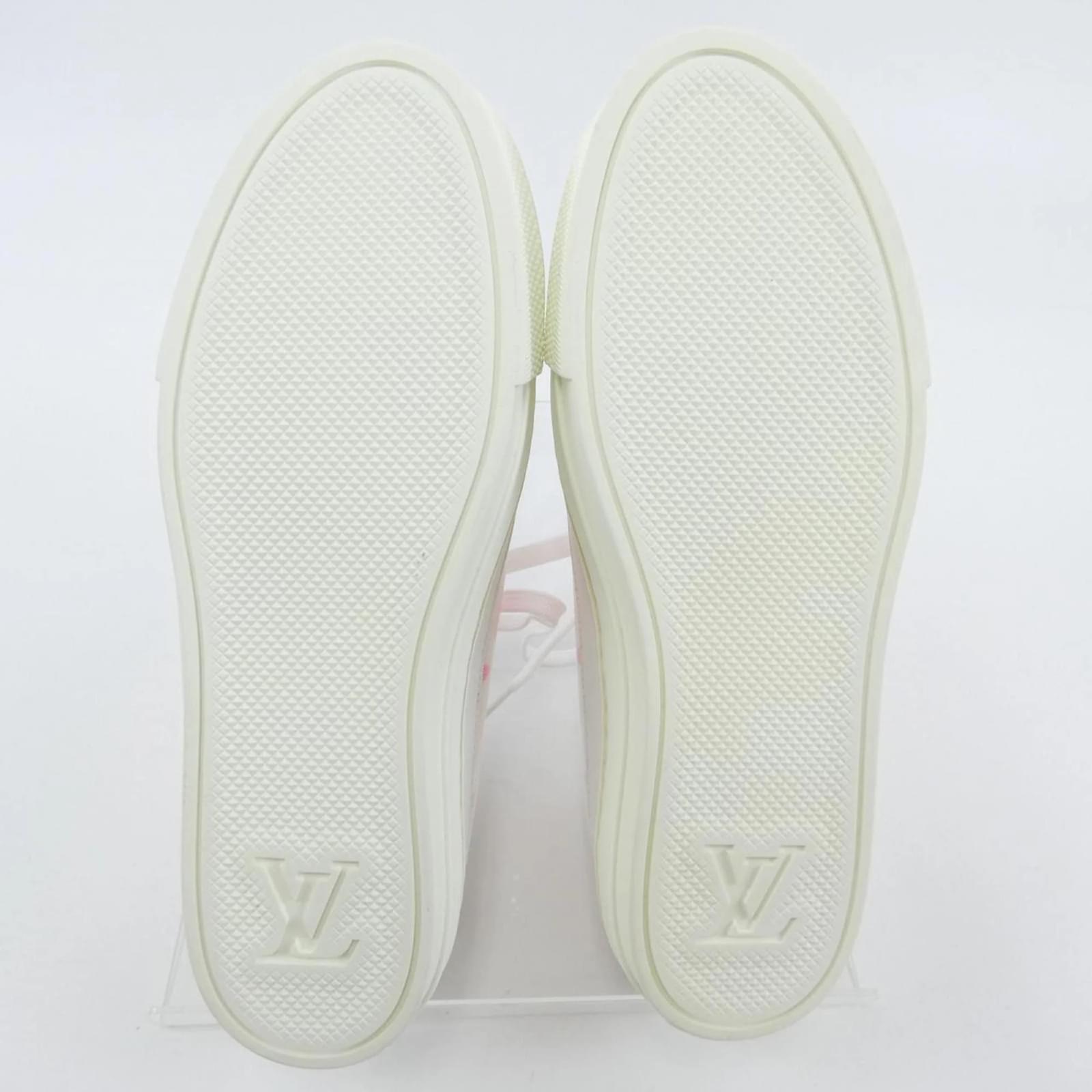 These Louis Vuitton sneakers feature a pink and white color scheme, offering a stylish yet casual look. The shoes are classified as used and are in acceptable condition, showing moderate traces of use, including scratches and dirt. It is advisable to review the provided images to assess the exact condition before purchasing. Accessories included with the sneakers should also be verified through the images.
