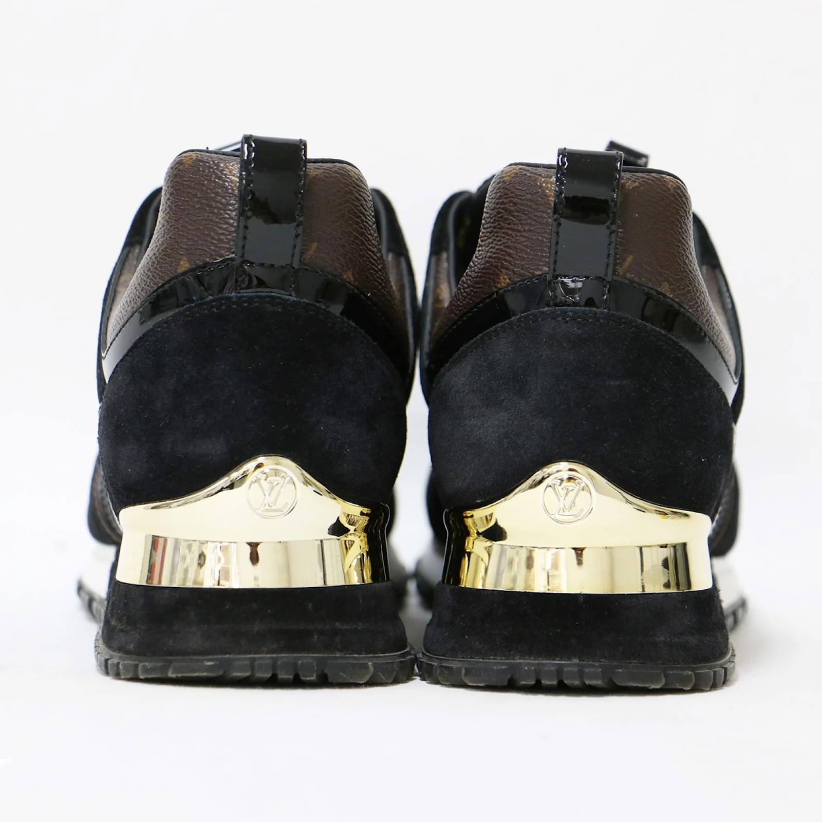 These Louis Vuitton sneakers feature a combination of black, brown, and gold colors, crafted from canvas and suede leather with a rubber sole. Designed for women, they are a low-cut style with a lace-up closure. The sneakers are available in size 34 1/2 (22.0 cm) and are made in Italy. \n\nThe condition of the sneakers is classified as used (good), with slight traces of usage, scratches, and dirt. It is recommended to review the provided images for a detailed view of the item’s condition. No additional accessories are included with the purchase.