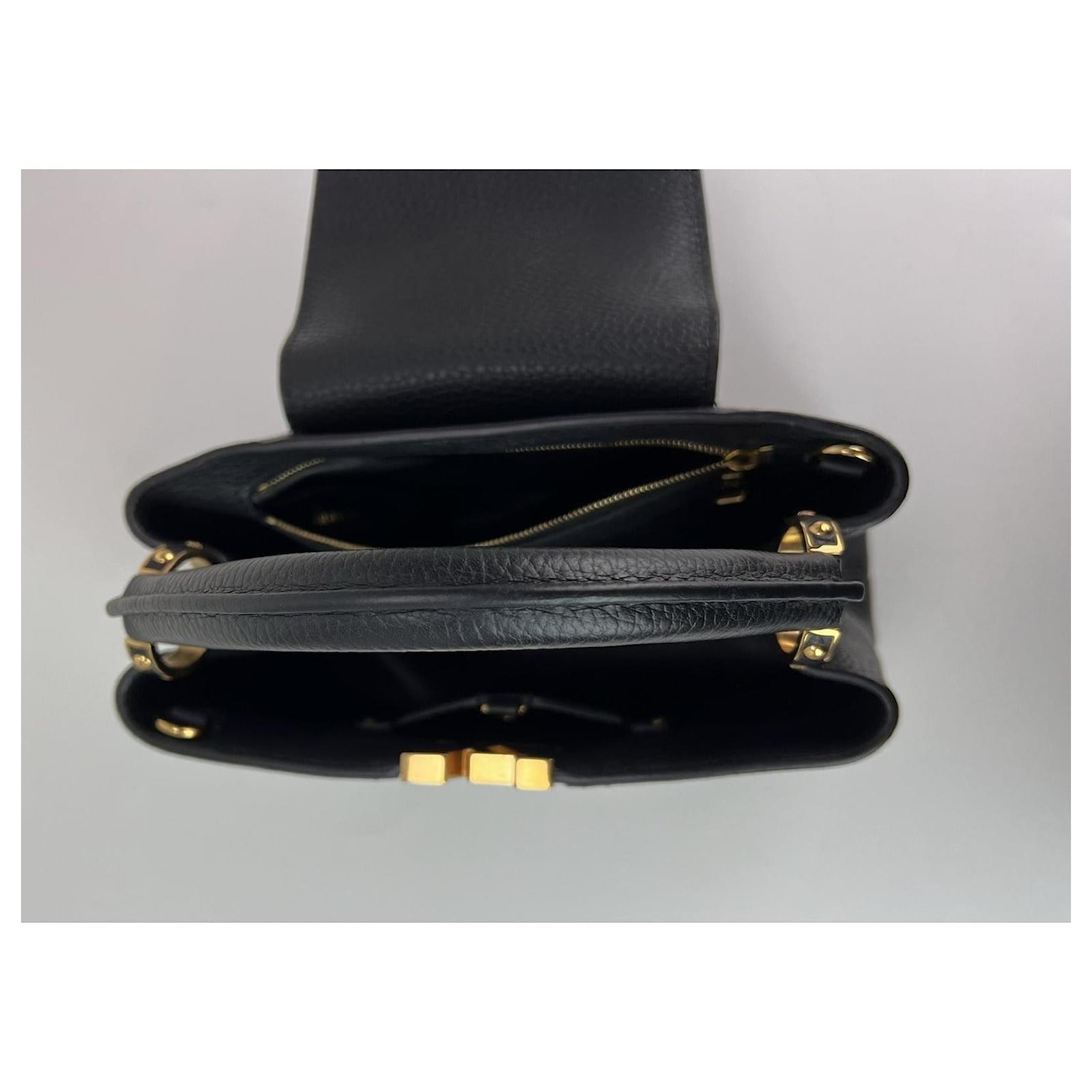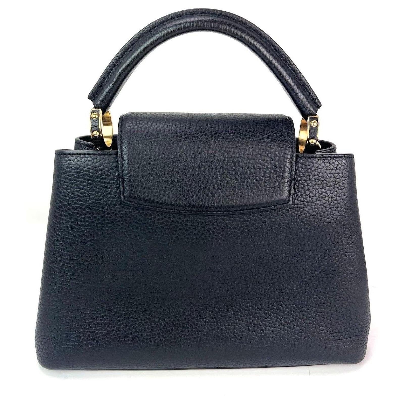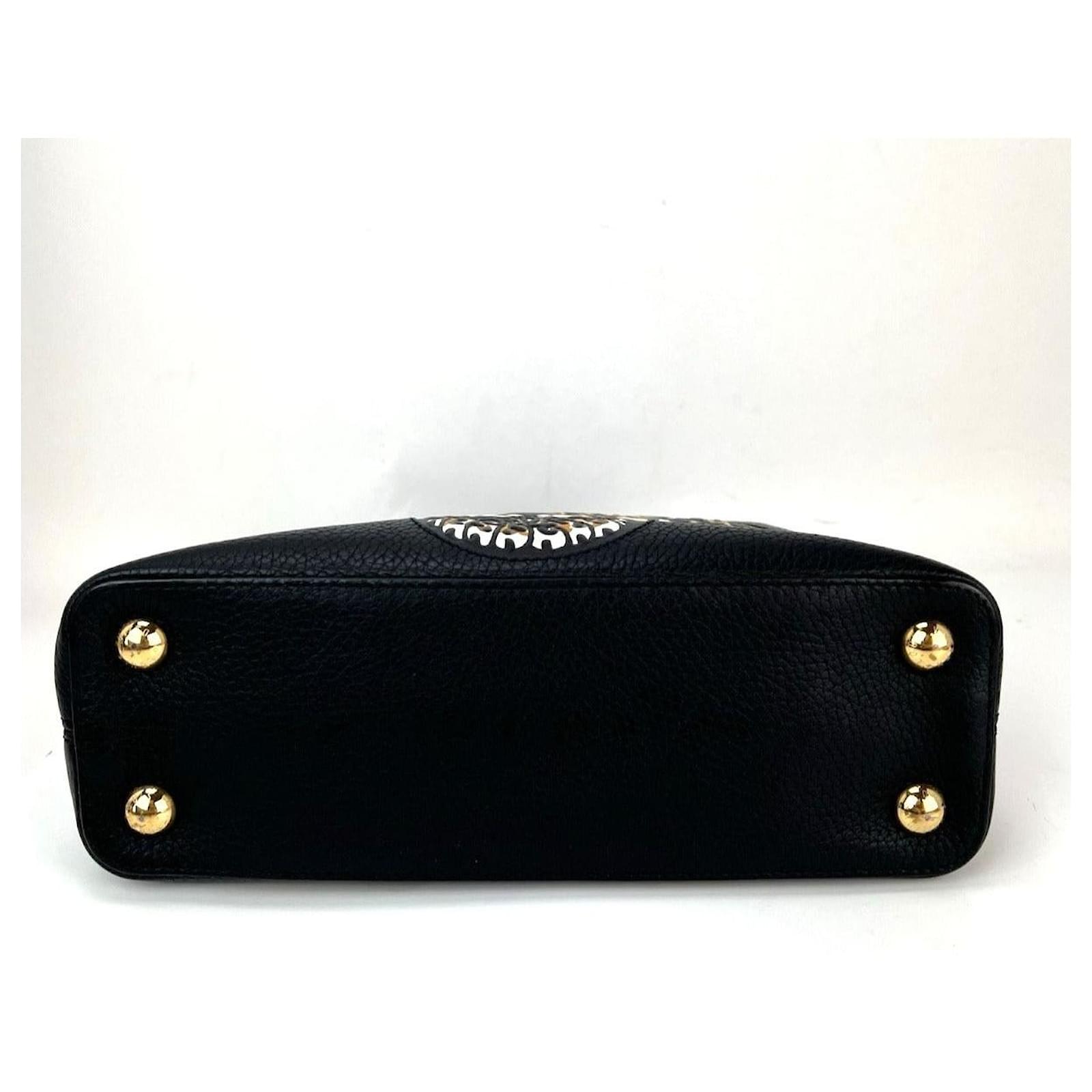 Pre-Owned 100% AuthenticLouis Vuitton Taurillon Capucines Trapped Leopard BB Black Shoulder BagRATING: A/B…Very Good, well maintained,shows minor signs of wearMATERIAL: taurillon leatherSTRAP: LV Black Leather adjustable removable strap 44” to 48”, has a tiny bend near endDROP: 21” to 23”HANDLE: double leather DROP: 3”COLOR: black, white, brown, tan, greenCLOSURE: push leather tab in loopEXTERIOR: on top of flap has 2 small scuff marks from putting in behind hardwareODOR: noHARDWARE: golden, some scratchesINTERIOR: black leather, few tiny tiny indents on botomDATE CODE: TR0138MEASUREMENTS: H 8” x L 10.6” x W 3.7”INCLUDED: *LV dust bag*LV Black Leather adjustable removable strap 44” to 48”Please see all pictures to determine finalcondition, pictures are of actual item ! SHIPPING: will ship same day or next day SKU A1347 0725 Measurments: width: 93 mm length: 269 mm height: 203 mm strap length: 1117.6 mm handle drop: 76.2 mm \n Product Id: 524233 \n