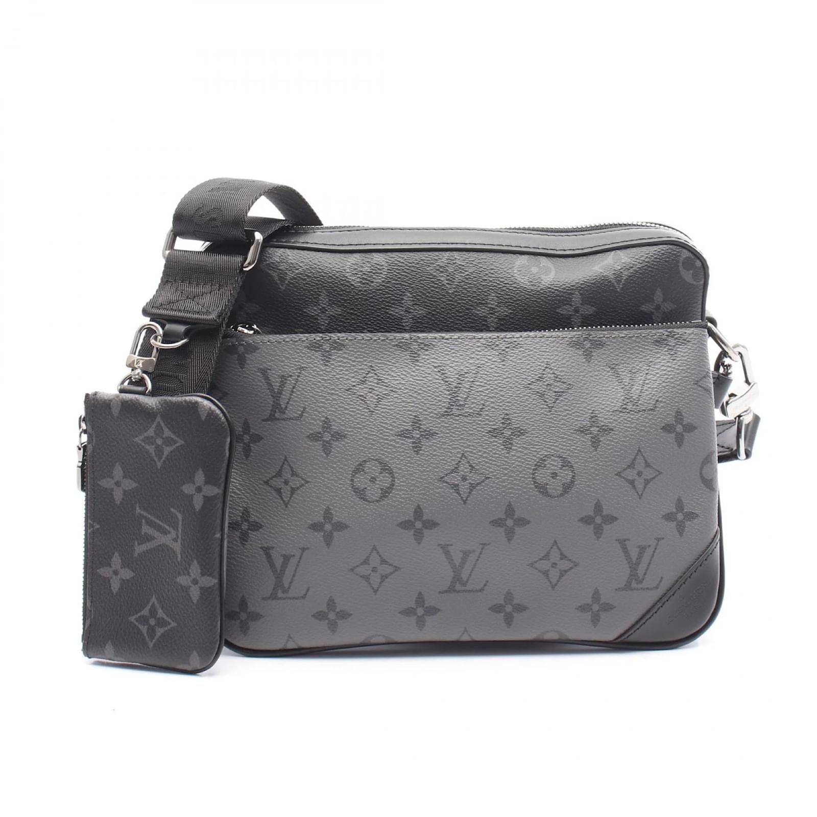 The Louis Vuitton Trio Monogram Eclipse Shoulder Bag is a stylish accessory designed for practicality and elegance. Crafted from Monogram Eclipse coated canvas, this bag features a color palette of black and gray, making it versatile for various outfits. \n\nWith dimensions of 18cm in height, 24.5cm in width, and 5cm in depth, it offers ample space for essentials. The adjustable strap ranges from 93cm to 137cm, allowing for comfortable wear as a shoulder bag. \n\nThis item is pre-owned and classified as being in good condition, with some traces of usage, including slight scratches and dirt. It is important to review the provided images for a clear understanding of its condition. The bag does not come with any additional accessories. \n\nThe model code for this item is M69443, and it is a product of the renowned brand Louis Vuitton.