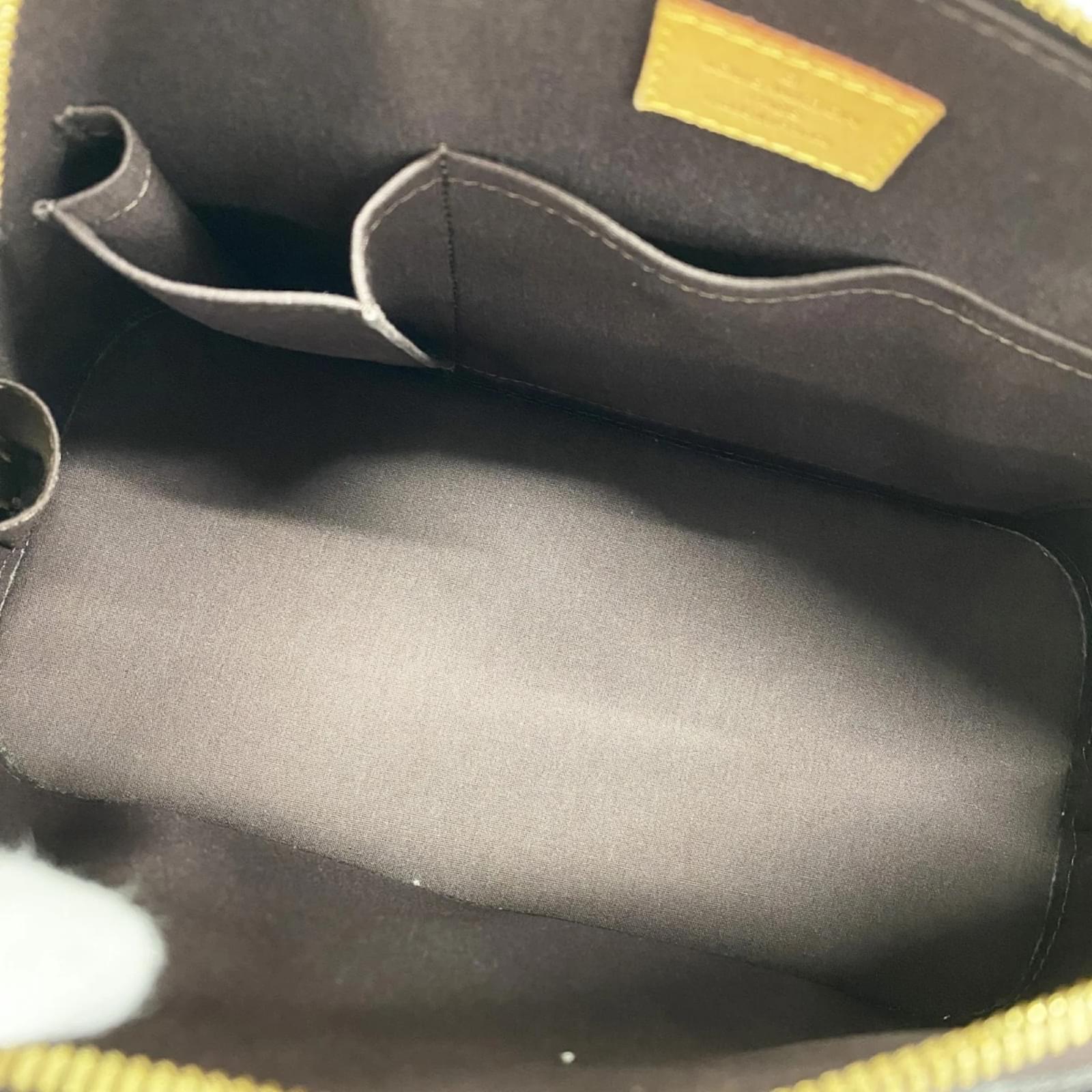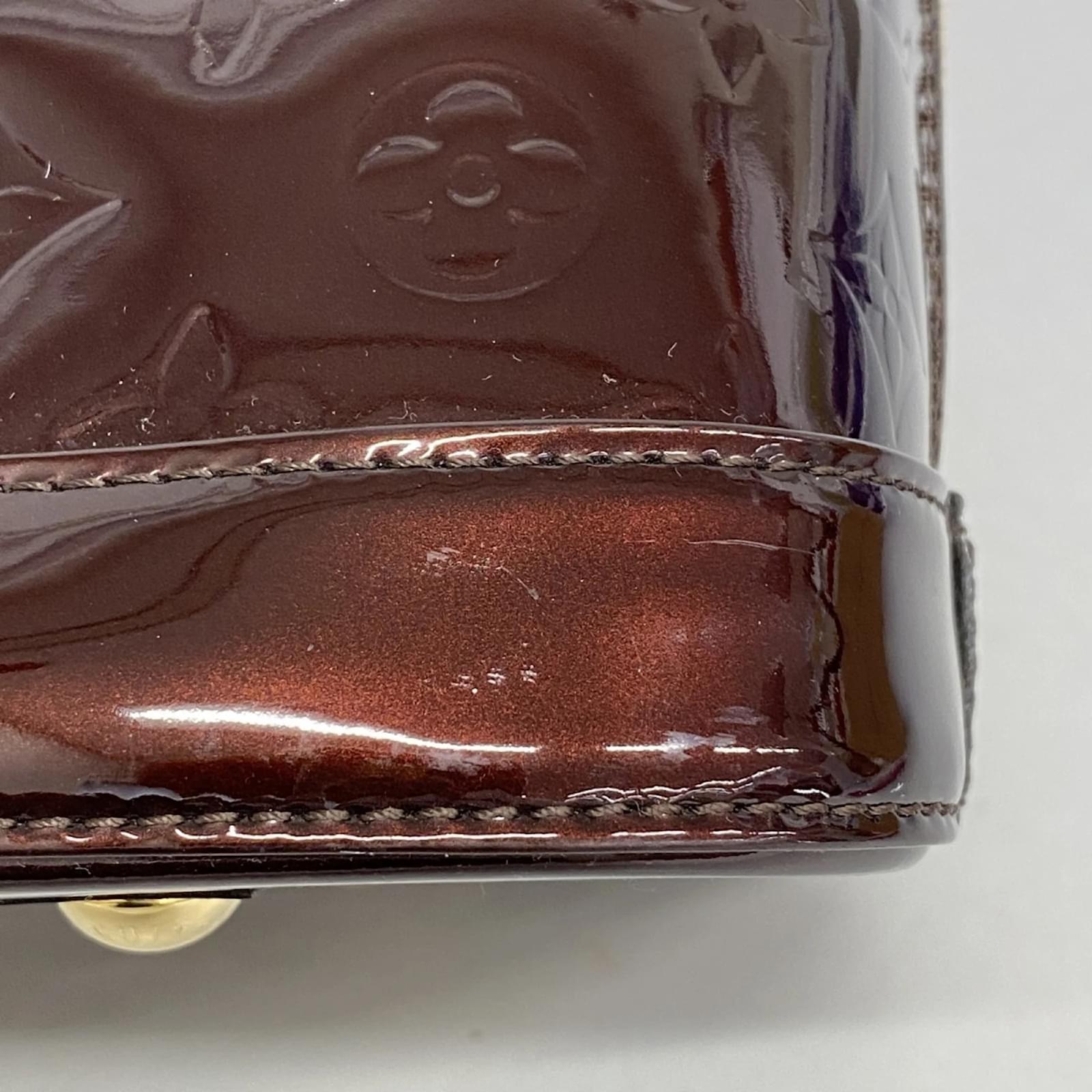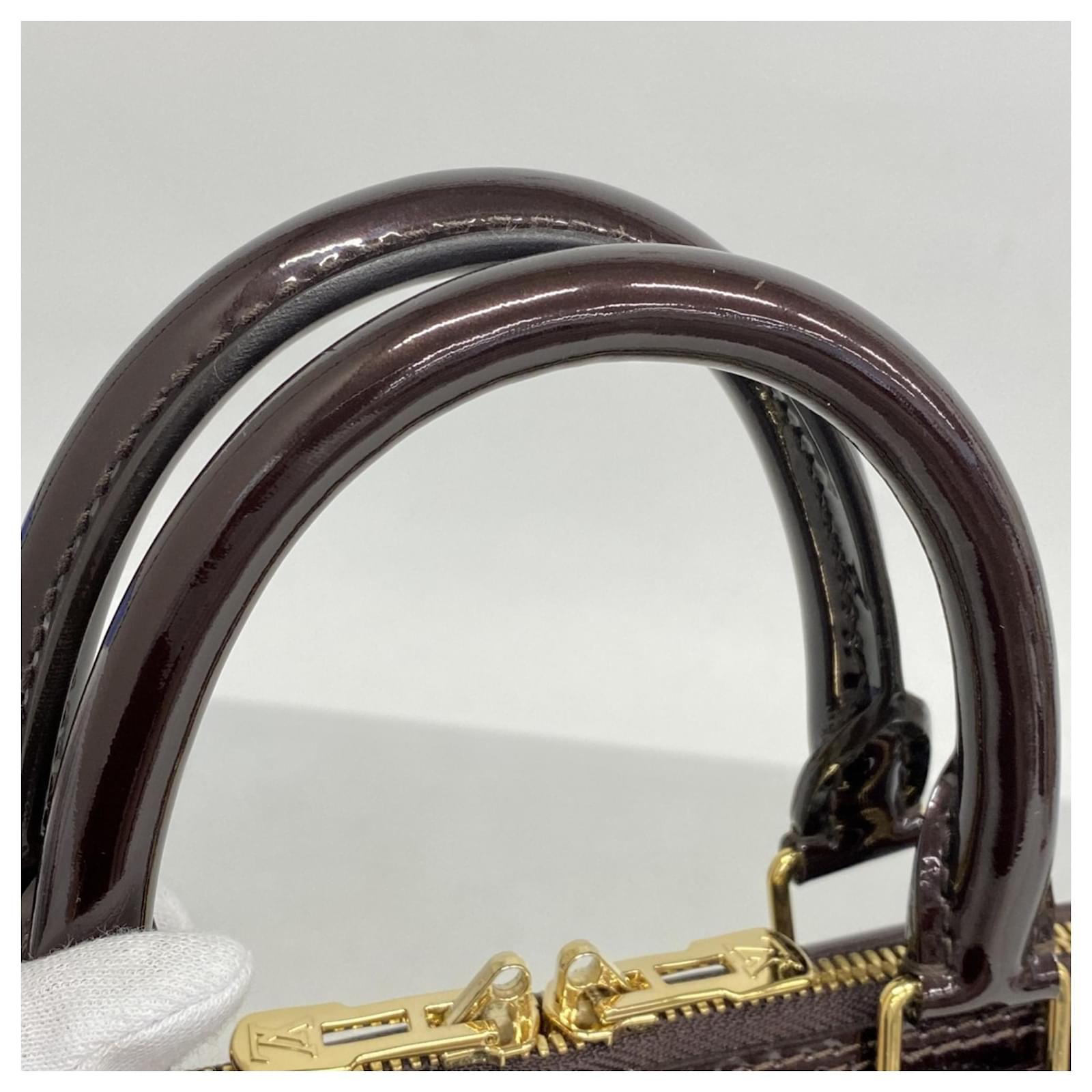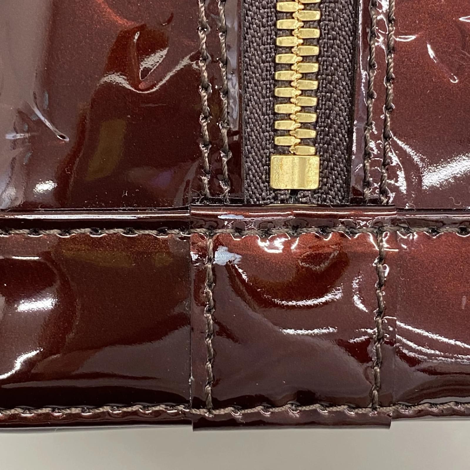 This Louis Vuitton handbag, model Vernis Alma PM M91691, is presented in a striking Rouge Fauvist color. It is designed for ladies and is categorized as a used item in good condition, with some traces of usage, including slight scratches and dirt. The handbag comes with a clochette, dust bag, key, and padlock. Potential buyers are encouraged to review the images for a detailed view of the item’s condition and included accessories. A subtle scent of perfume is noted.