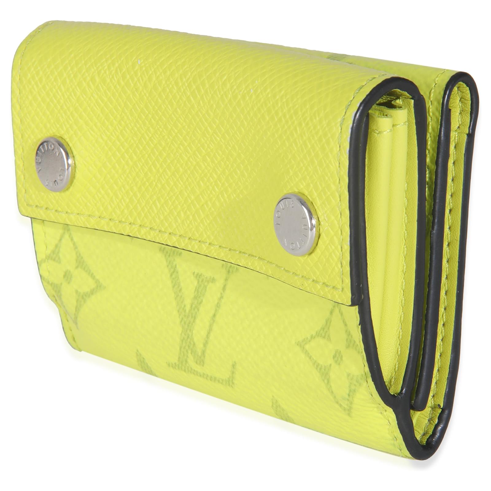 Listing Title: Louis Vuitton Yellow Tiagrama Discovery Compact Wallet\nSKU: Z145359\nCondition: Pre-owned \nHandbag Condition: Good\nCondition Comments: Item is in good condition with apparent signs of wear. Marks along back. Scuffs and marks along interior. Dents along hardware.\nBrand: Louis Vuitton\nModel: Discovery Compact Wallet\nHandbag Silhouette: Wallet\nOccasions: Evening;Everyday;Fall/Winter;Seasonal;Spring/Summer;Travel;Weekend;Work\nSize (Generic): Small\nYear Manufactured: 2019\nFeatures Interior: Three Card Slots. Two Slip Pockets.\nInterior Material: Leather\nInterior Color (Generic): Yellow\nHandbag Closure Type: Snap\nHandbag Accessories: Box;Dustbag\nHardware Color: Silver-Tone\nExterior Color (Generic): Yellow\nExterior Material (Generic): Coated Canvas;Leather\nLength: 3.90 in\nHeight: 2.80 in\nDepth: 1.20 in