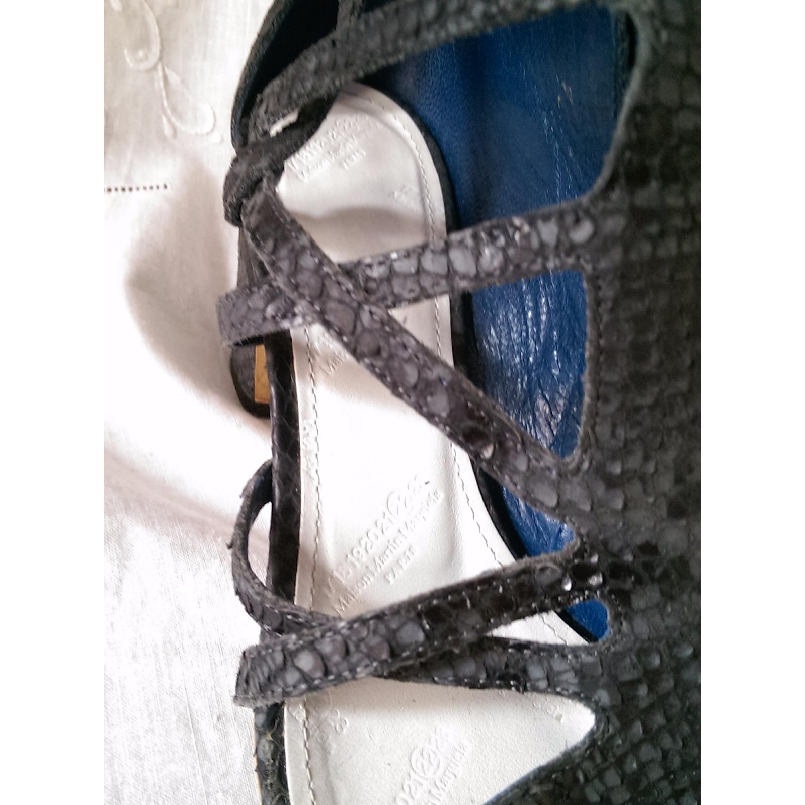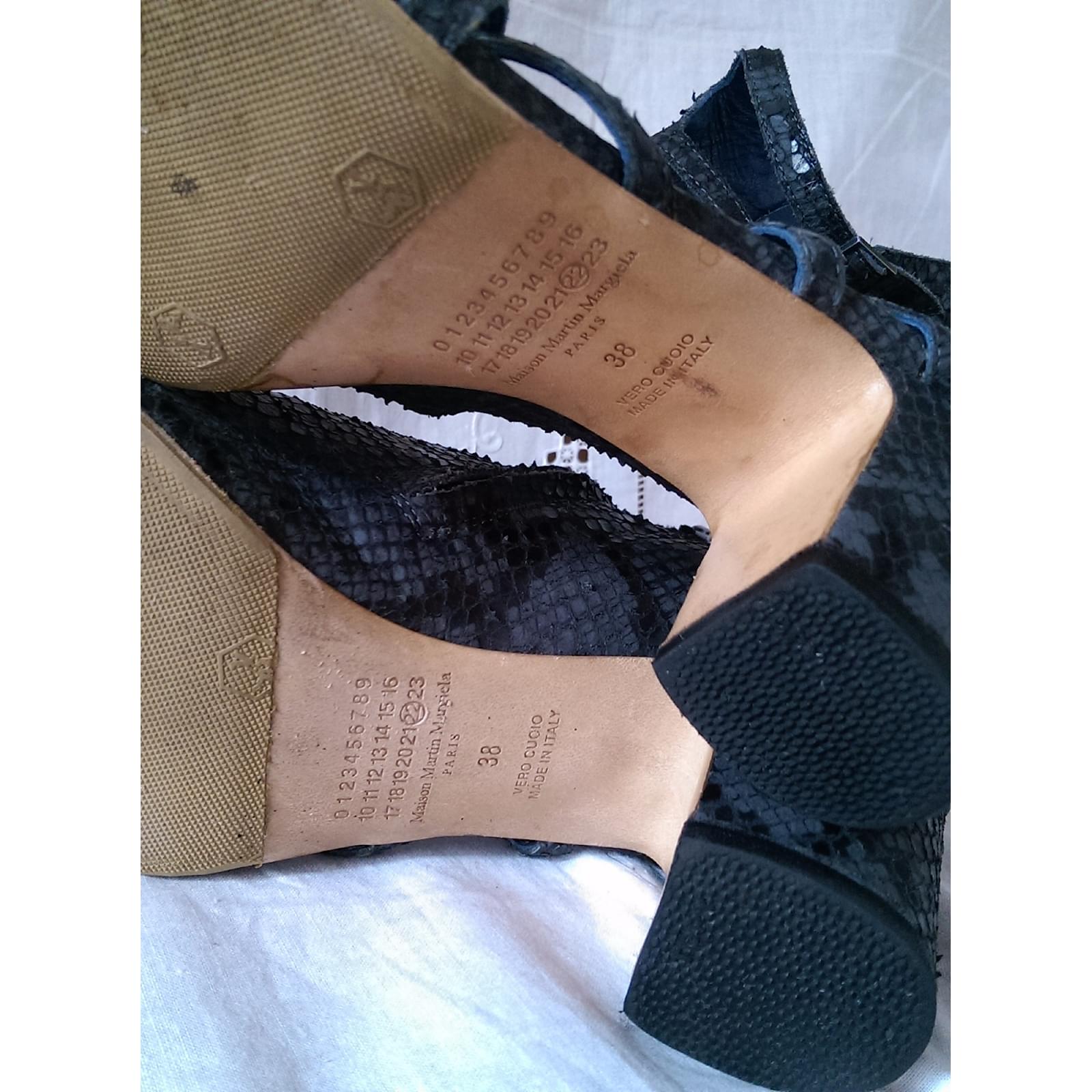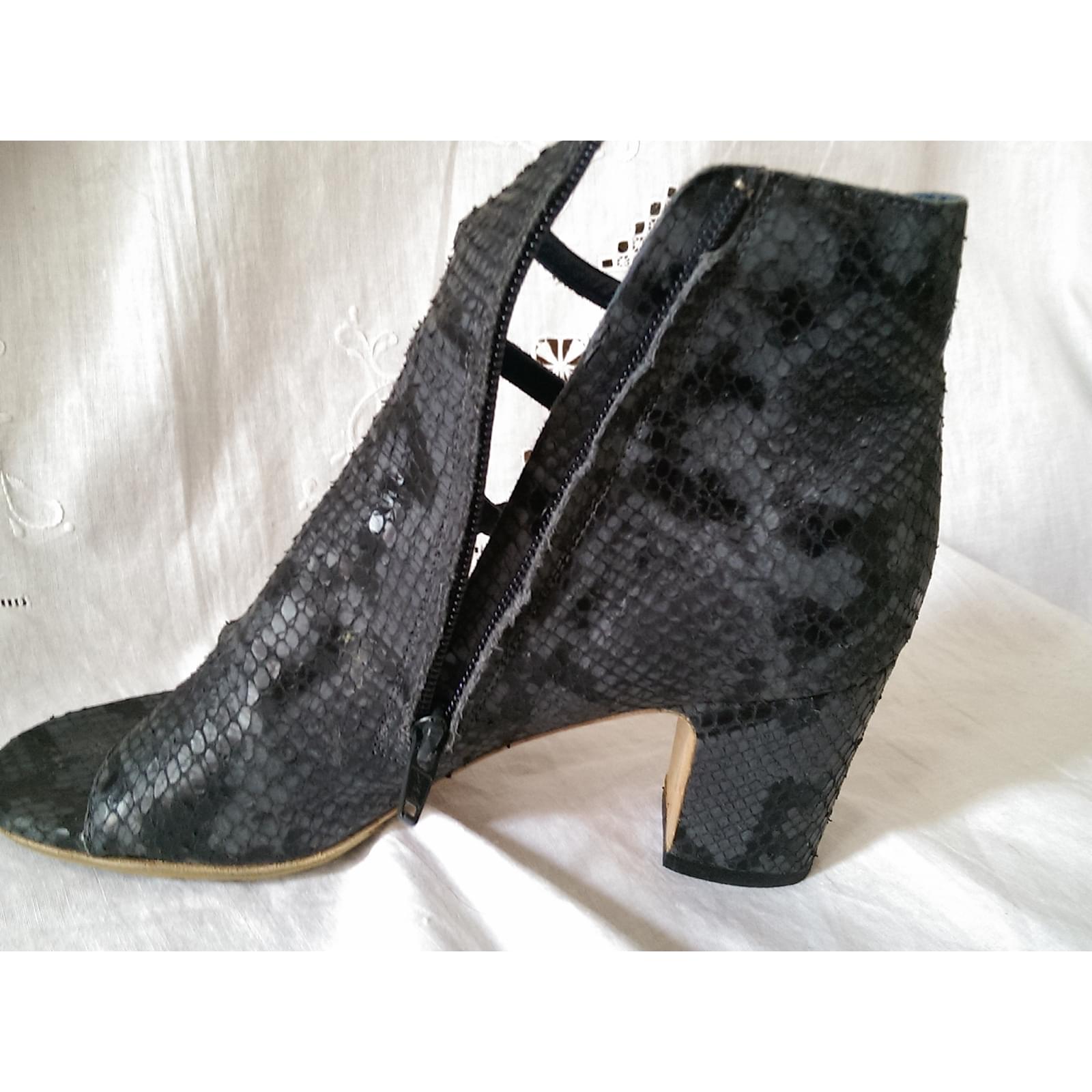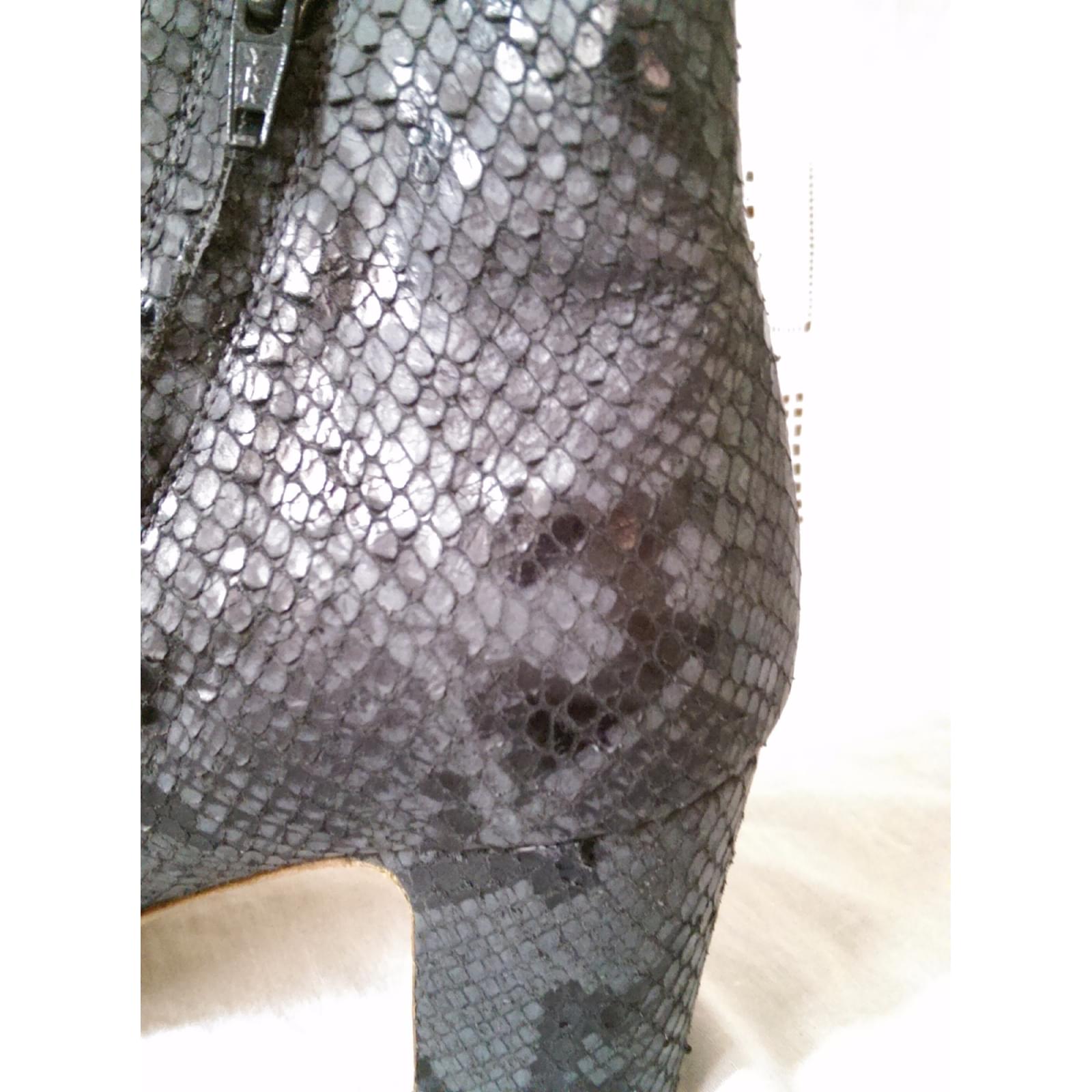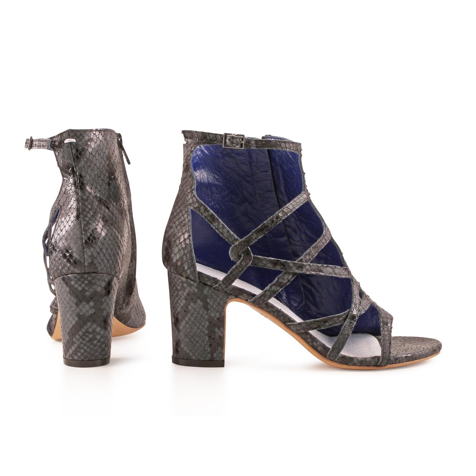 Sandals asymmetric shape in phyton of anthracite gray color, zipper. square heel of 7 cm.