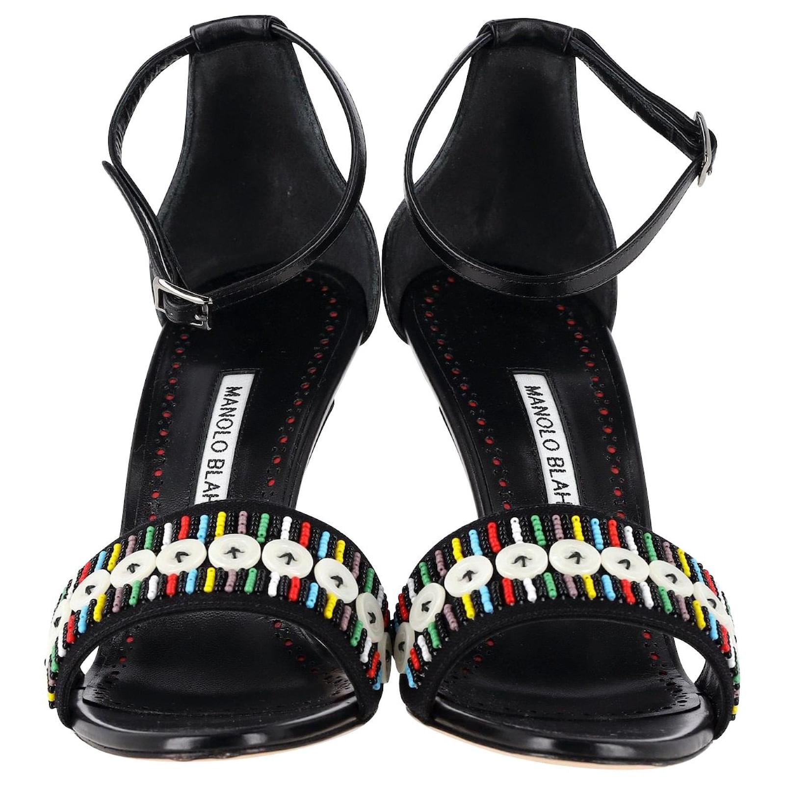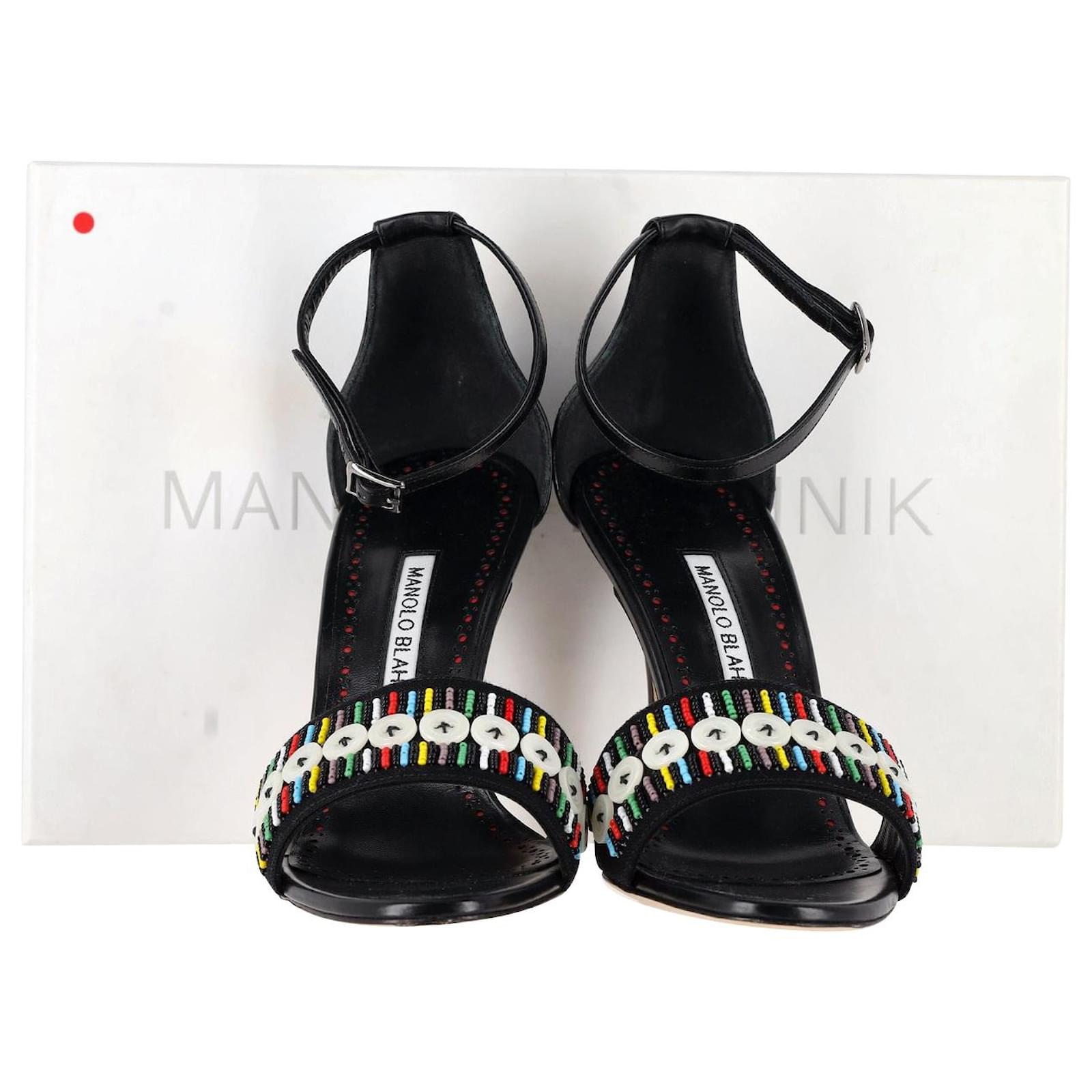 Embrace glamour with the Manolo Blahnik Beaded Open-Toe Sandals. These sandals are adorned with intricate beaded and button details, creating a chic look. The open-toe design adds a contemporary touch, while the high heels elongate the legs for a flattering silhouette. \nManolo Blahnik Beaded Open-Toe Sandals in Black Leather\nCondition: Excellent with box\nsign of wear: Minor mark on the soles\nMaterial: leather\ncolor: Black\nSize: it39 / US9 / Uk6\nSKU: 340059 \n Product ID: 340059 \n
