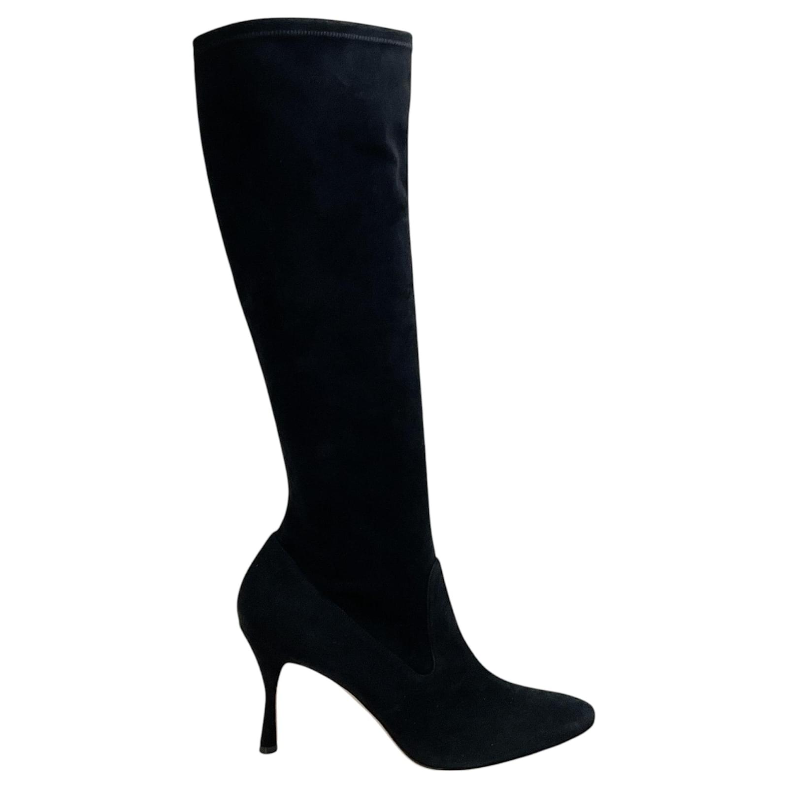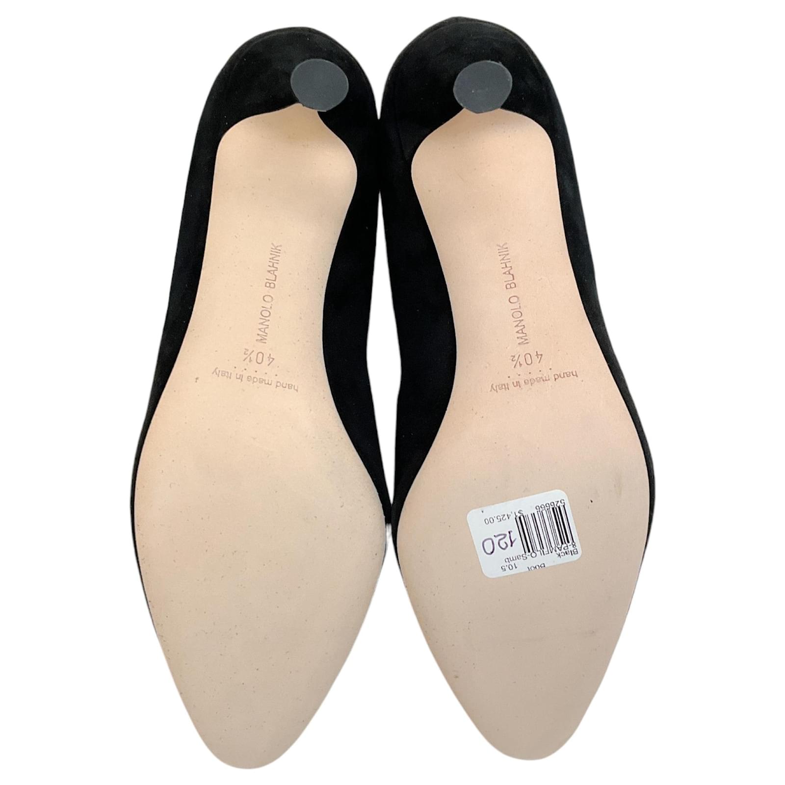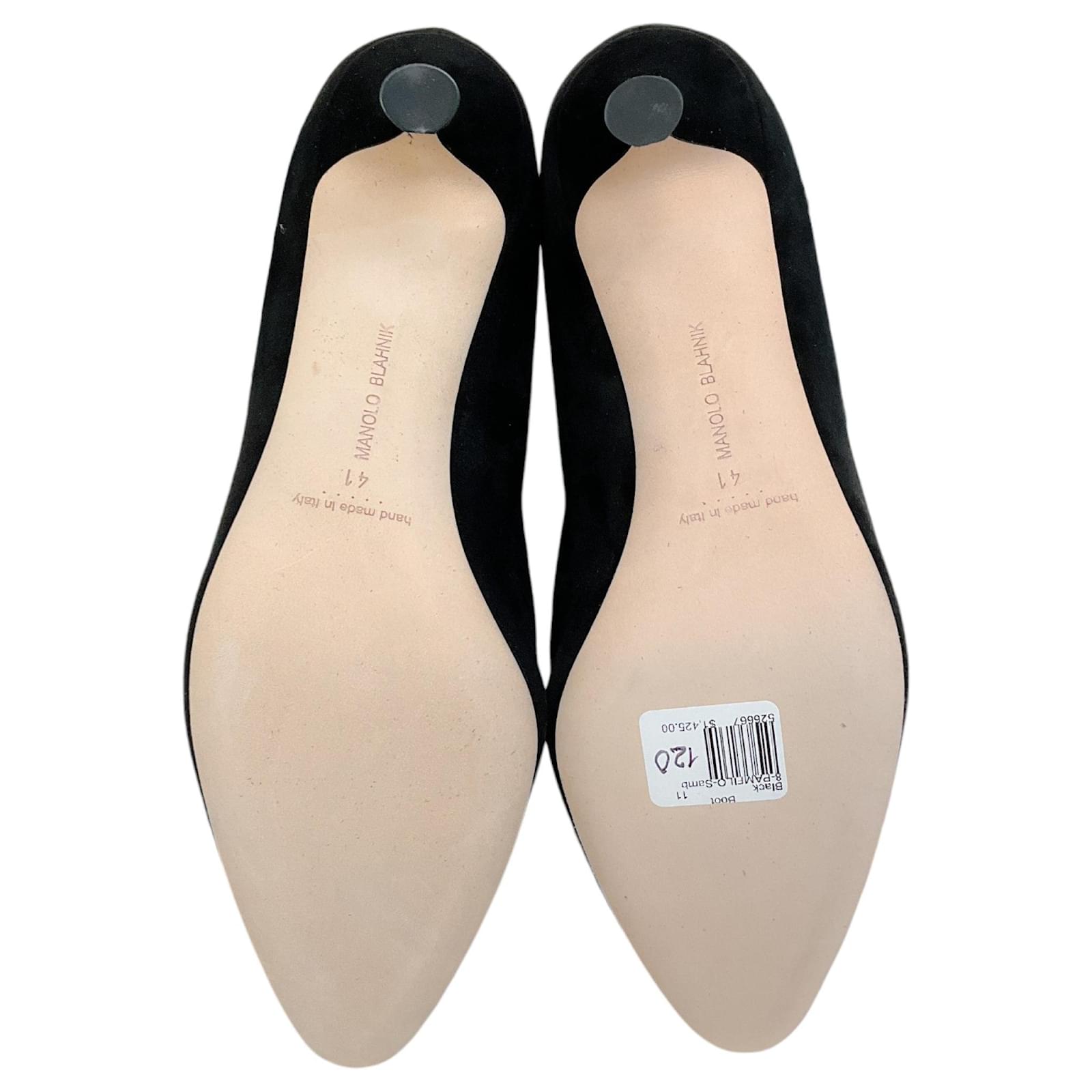 Manolo Blahnik Black Suede Pamfilo 90 Boots\nCondition: Never worn with tag\nAs with all suede items these are delicate and may have a slight discoloration (due to the nap in the fabric) and minor indentations (due to the soft supple material)\nMaterial: Suede\nIncludes: Box dust bag\nCountry of origin: Italy\n*Please note as with most designer shoes they may run small\nHeel height: 3.5\”\nSole: Leather\nColor: Black\nUS 10 / EU 40\nUS 10.5 / EU 40.5\nUS 11 / EU 41\nCategory: Shoes\nSubcategory: Boots\nSub Sub Category: Others\n100654-256 F525MA\n100654-257 F525MA\n100654-258 F525MA\n** Photos are of the actual item **\n** Roundabout Couture Certified Authentic **