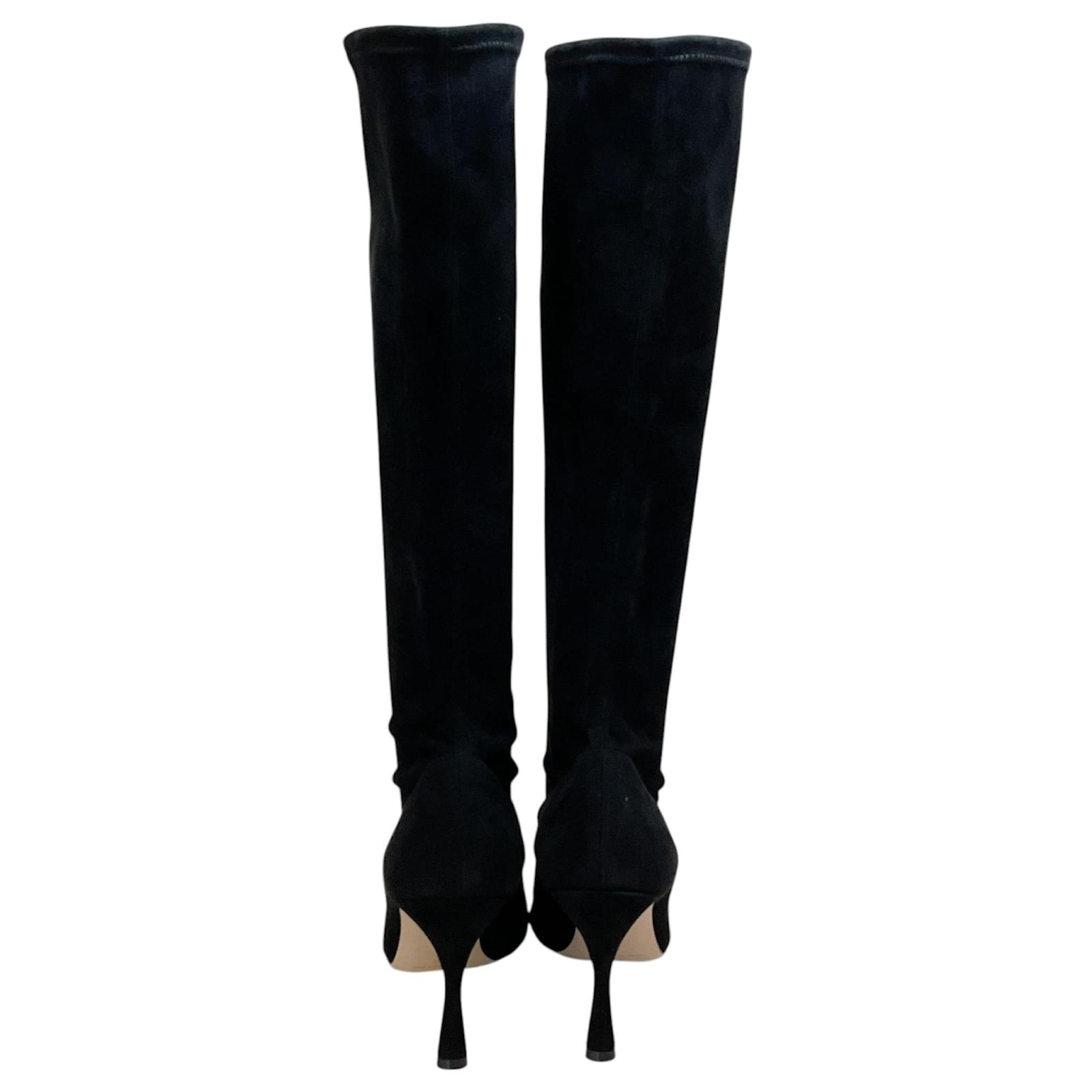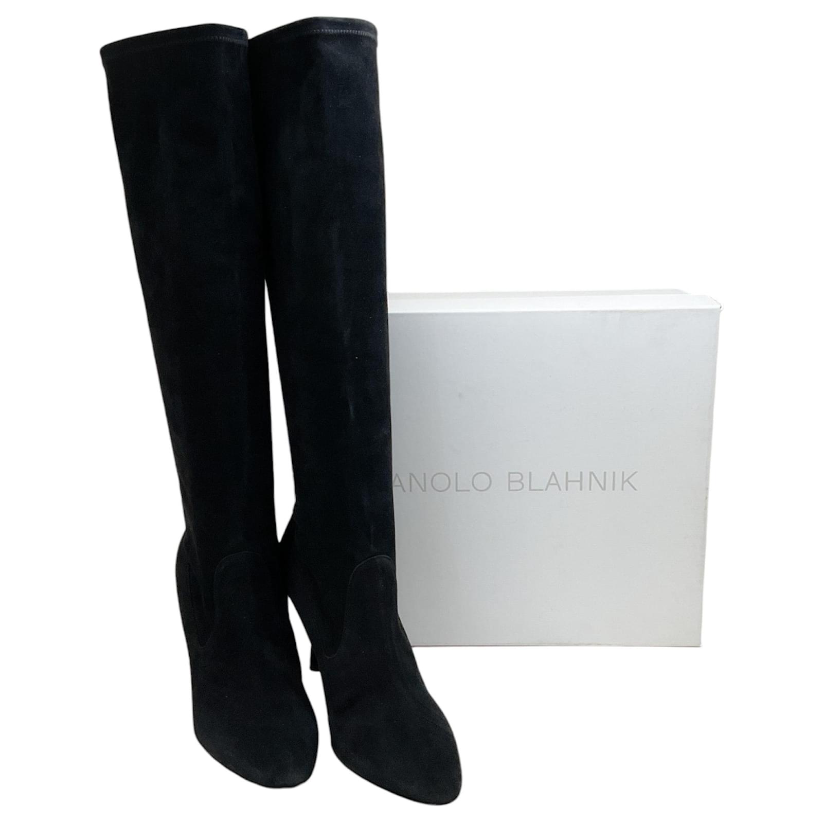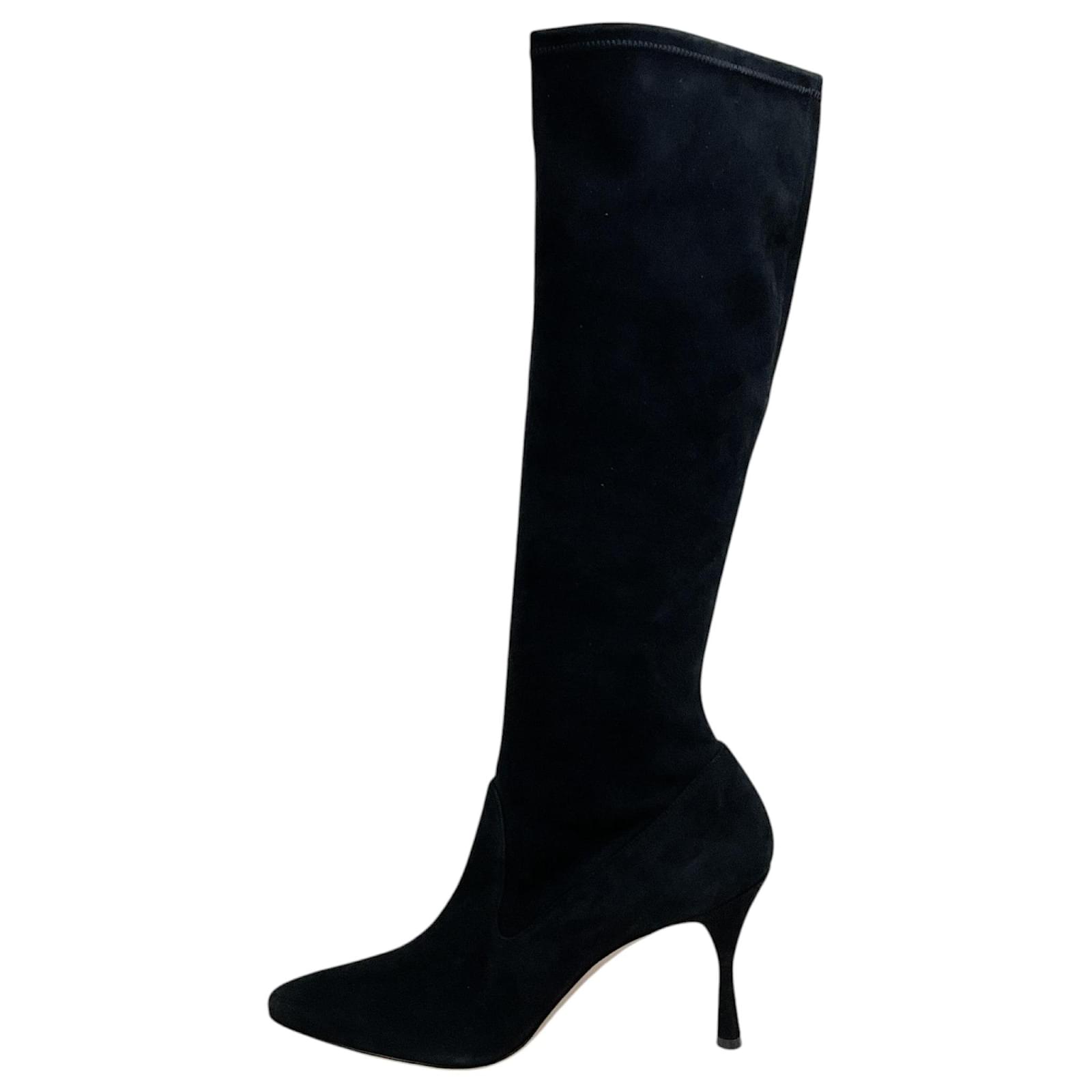 Manolo Blahnik Black Suede Pamfilo 90 Boots\nCondition: Never worn with tag\nAs with all suede items these are delicate and may have a slight discoloration (due to the nap in the fabric) and minor indentations (due to the soft supple material)\nMaterial: Suede\nIncludes: Box dust bag\nCountry of origin: Italy\n*Please note as with most designer shoes they may run small\nHeel height: 3.5\”\nSole: Leather\nColor: Black\nUS 10 / EU 40\nUS 10.5 / EU 40.5\nUS 11 / EU 41\nCategory: Shoes\nSubcategory: Boots\nSub Sub Category: Others\n100654-256 F525MA\n100654-257 F525MA\n100654-258 F525MA\n** Photos are of the actual item **\n** Roundabout Couture Certified Authentic **