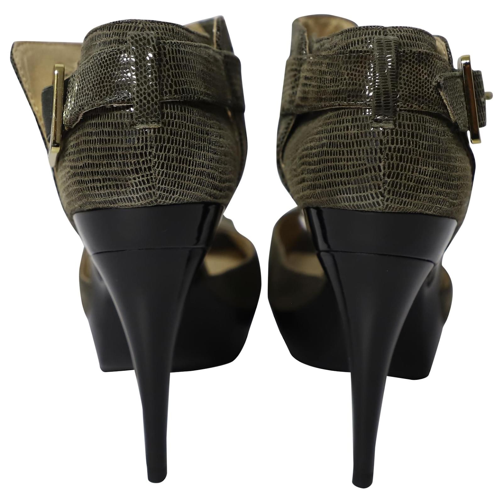 Lend your outfit the signature aesthetics of Michael Kors by adorning these sandals. Constructed from leather, they are decorated with sparkling embellishments all over and flaunt wide strap ankle buckle closure, platforms, and heels.\nMichael Kors Heidi Platform Heels in Black Leather\nsign of wear: Dust stains all over\nCondition: Good, Comes with shoe box\nMaterial: leather\ncolor: Black\nSize: 7/Uk4/eu37\nSKU: 139543 \n \n Product ID: 139543 \n