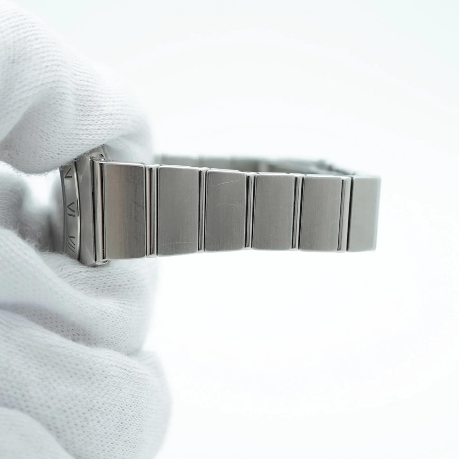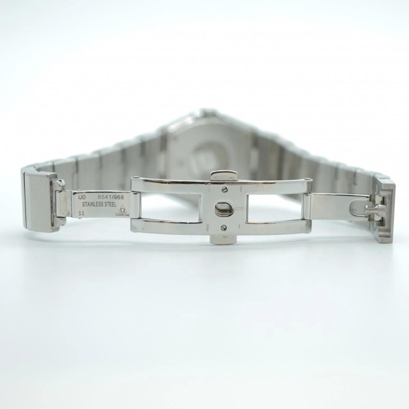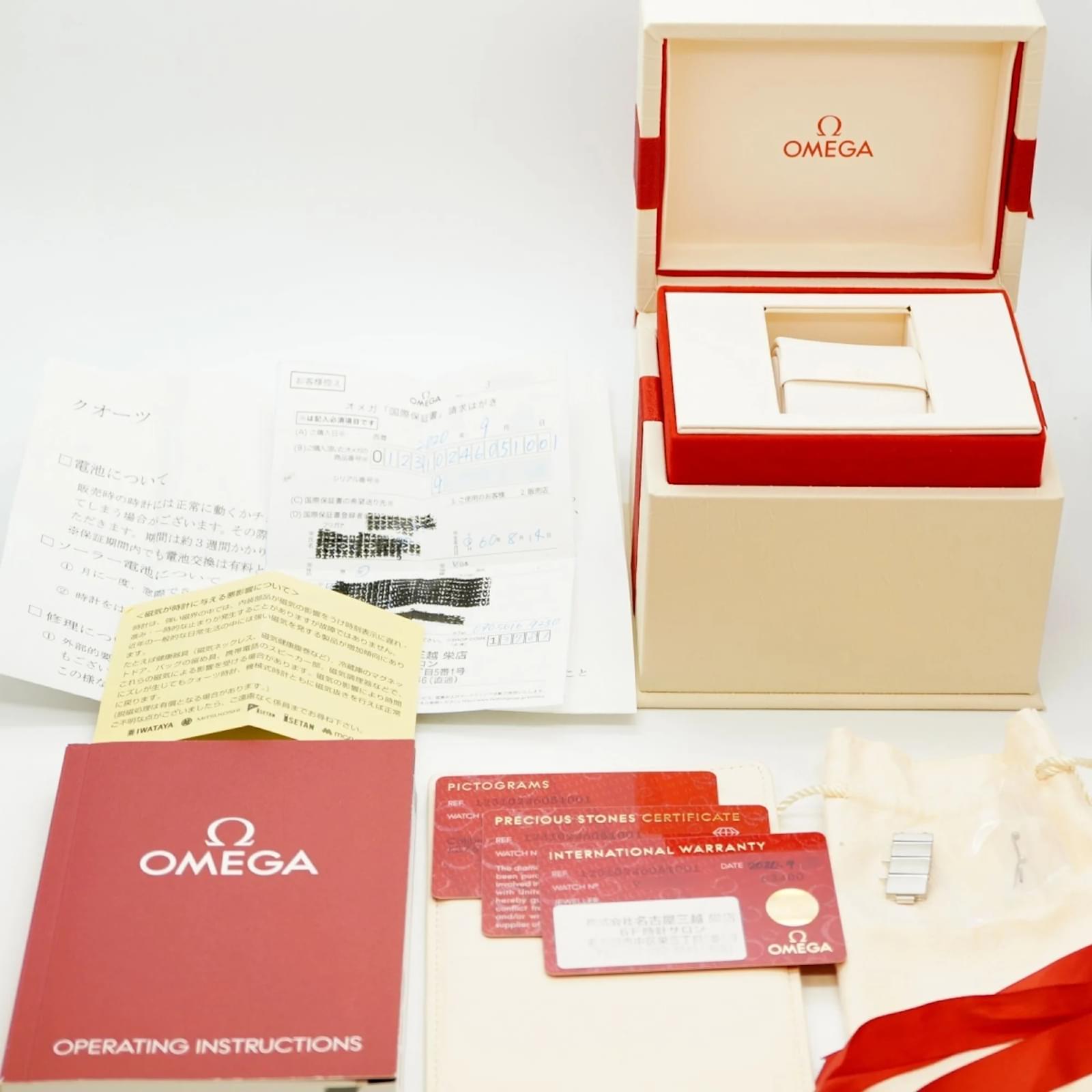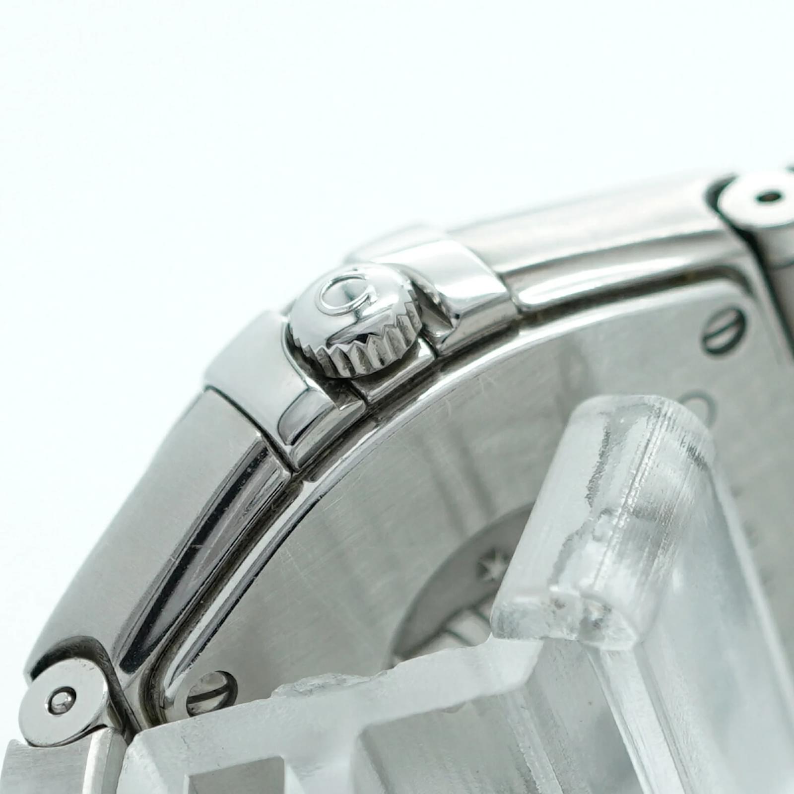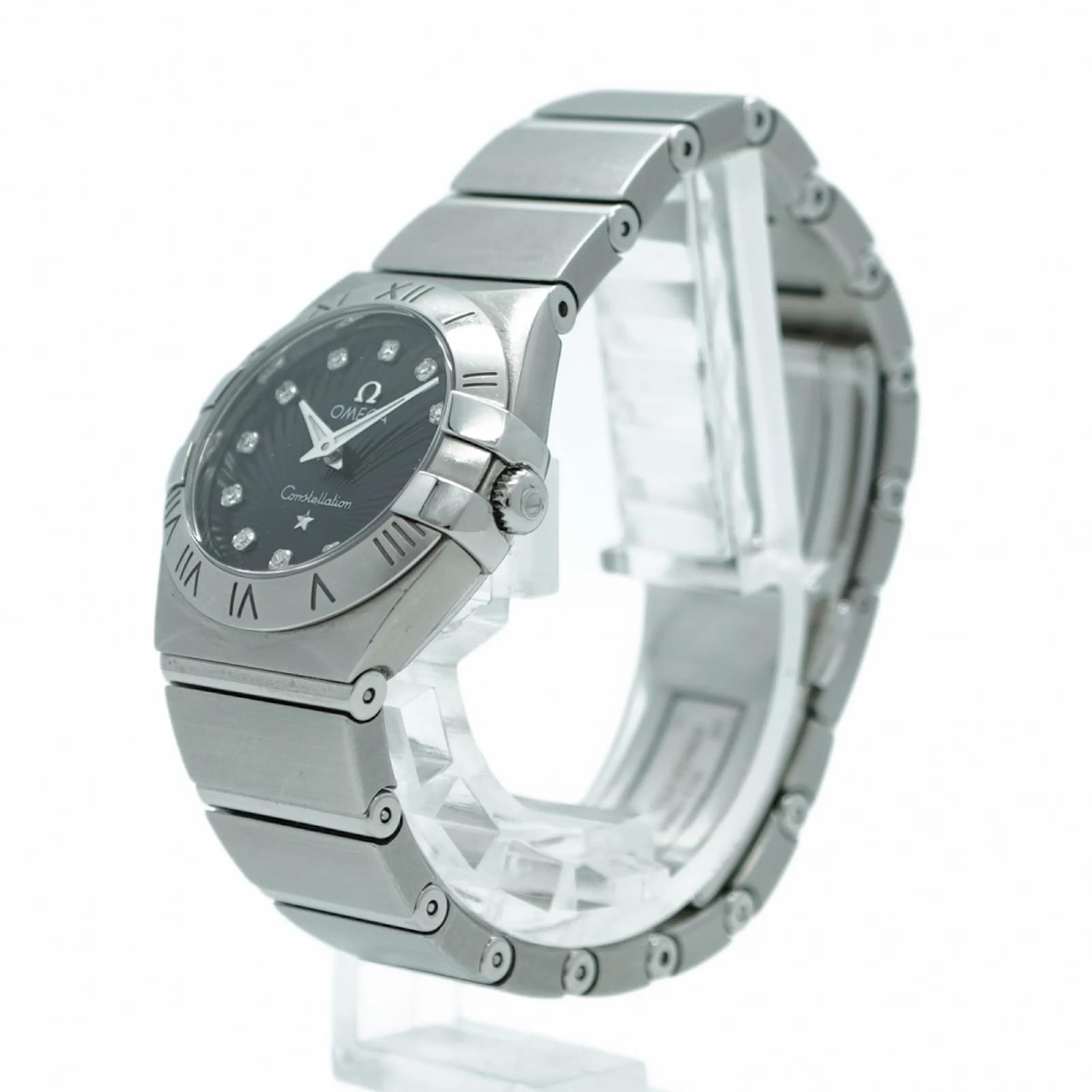 The Omega Constellation 123.10.24.60.51.001 is a stylish wristwatch designed for women, featuring a classic black dial. The watch is crafted with a stainless steel band, ensuring durability and a sleek appearance. It operates on a reliable quartz movement and is suitable for a wrist size of 13cm (5.11 inches) with a case diameter of 25mm (0.98 inches). \n\nThis pre-owned timepiece is in good condition, showing slight signs of wear, including minor scratches on the bezel, case back, dial, glass, and crown. The seller ranks it as \”Rank AB,\” indicating it has traces of usage but remains generally in good condition. \n\nIncluded with the watch are a guarantee card, inner box, outer box, and pictogram. Potential buyers are encouraged to review the images for a detailed view of the item’s condition and included accessories.