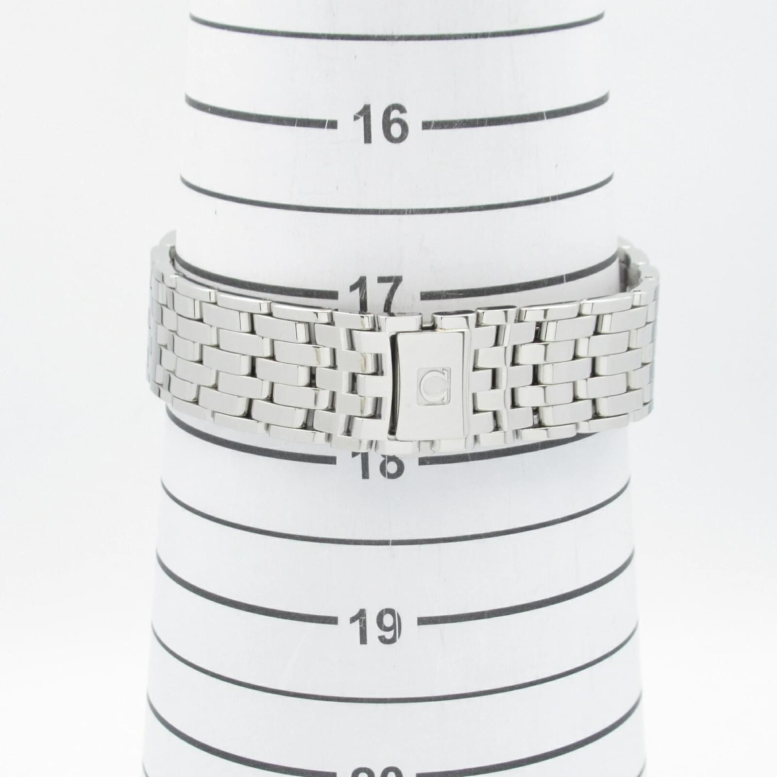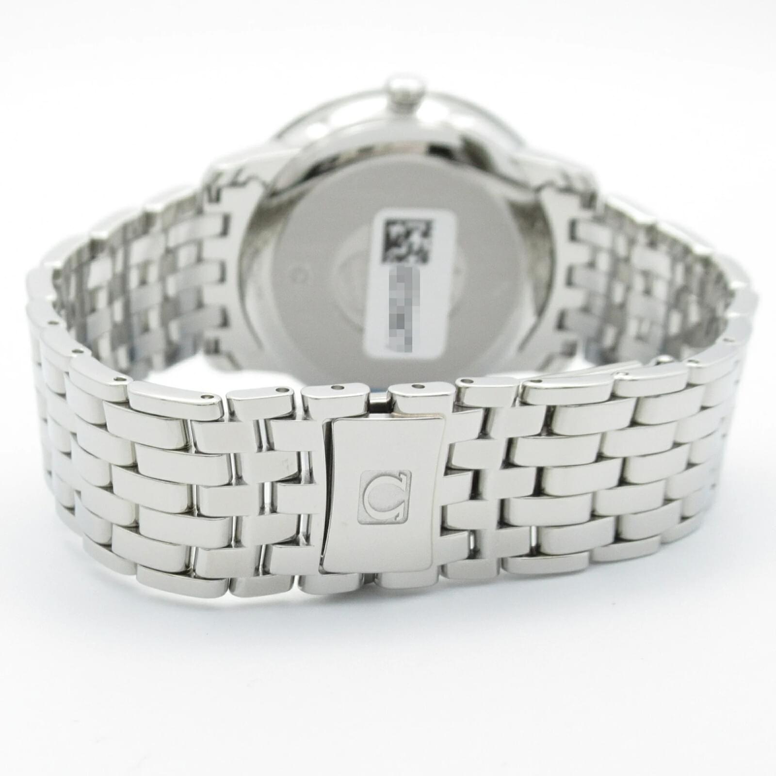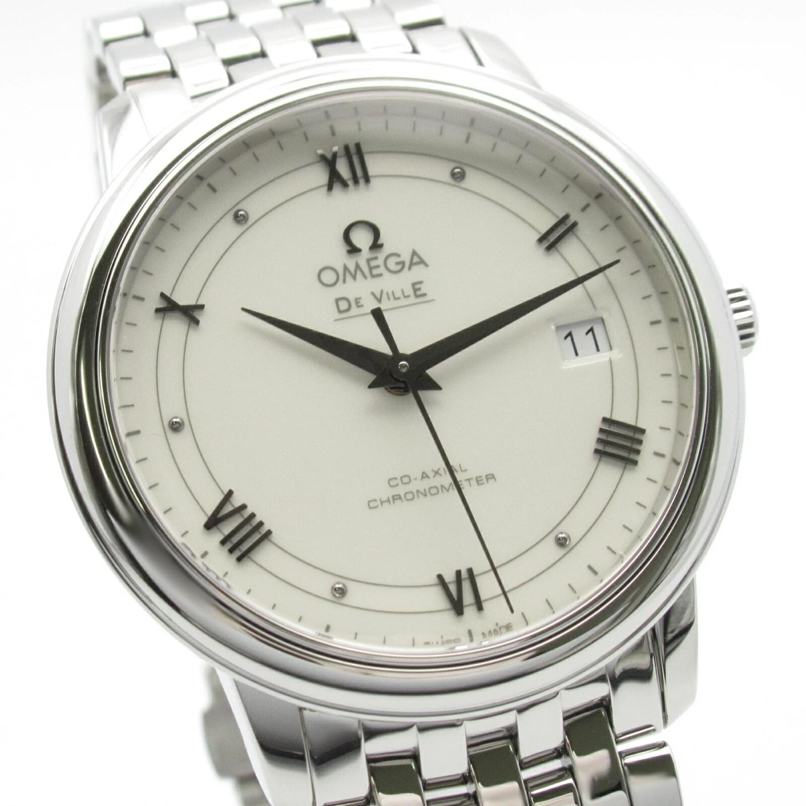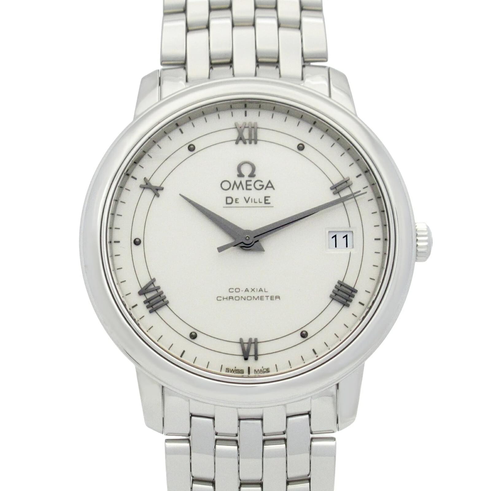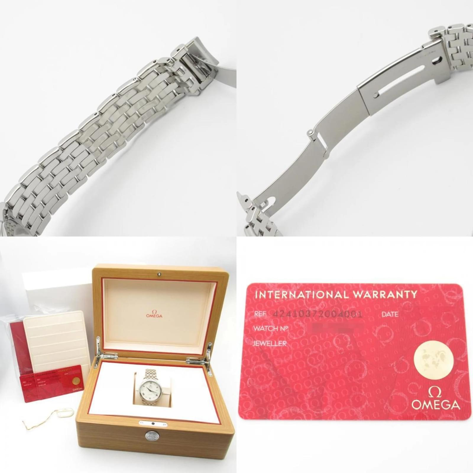 The OMEGA De Ville Prestige Watch is a sophisticated wristwatch designed for men, featuring a classic white dial. The case and band are crafted from durable stainless steel, ensuring both style and longevity. This timepiece operates on a self-winding automatic movement, providing reliable performance. \n\nThe watch is in opened but never used condition, with no visible scratches on the bezel, case back, dial, glass, or crown, indicating it is in mint condition. Included with the watch are a guarantee card, inner box, and outer box. Potential buyers are encouraged to review the images for a detailed view of the item’s condition and included accessories.