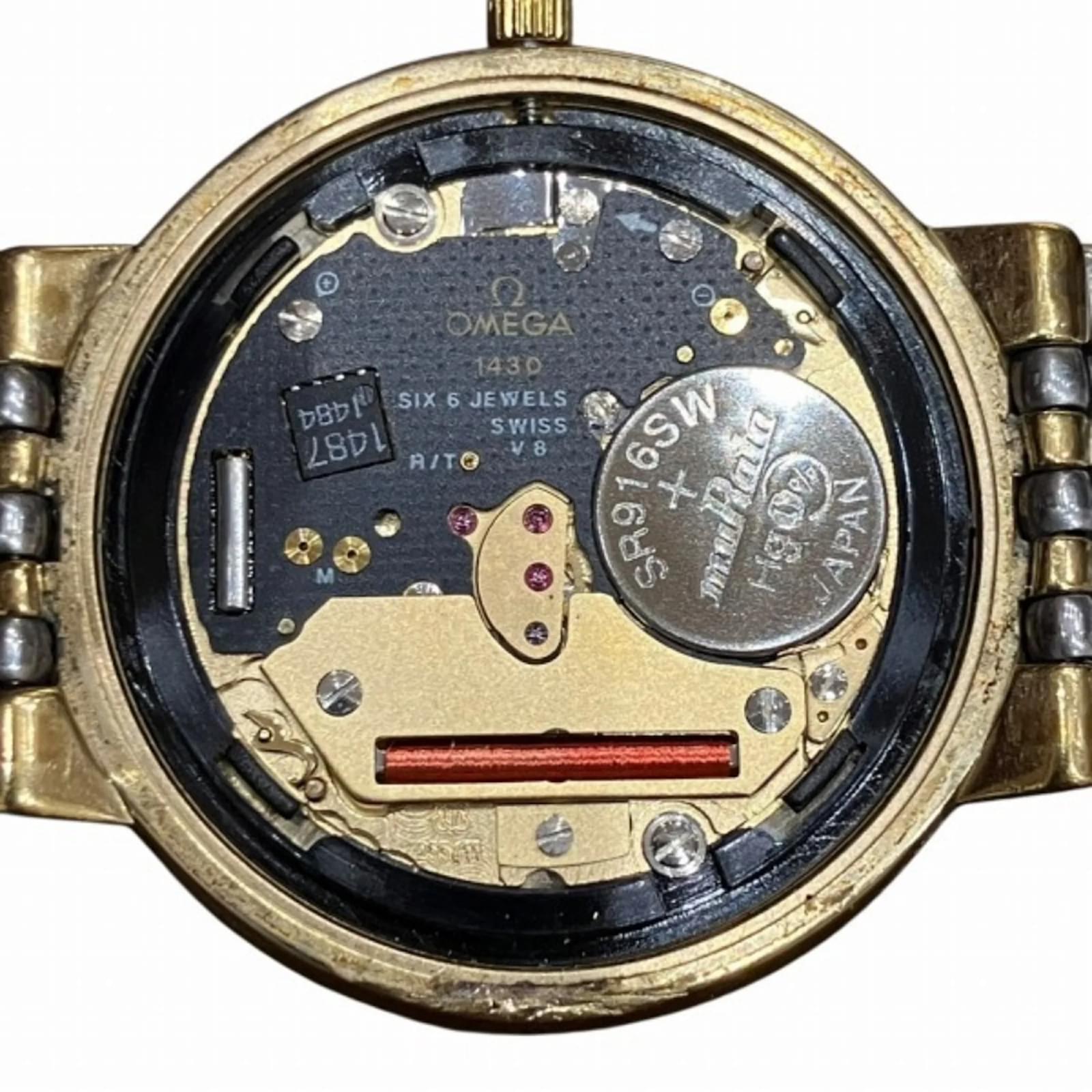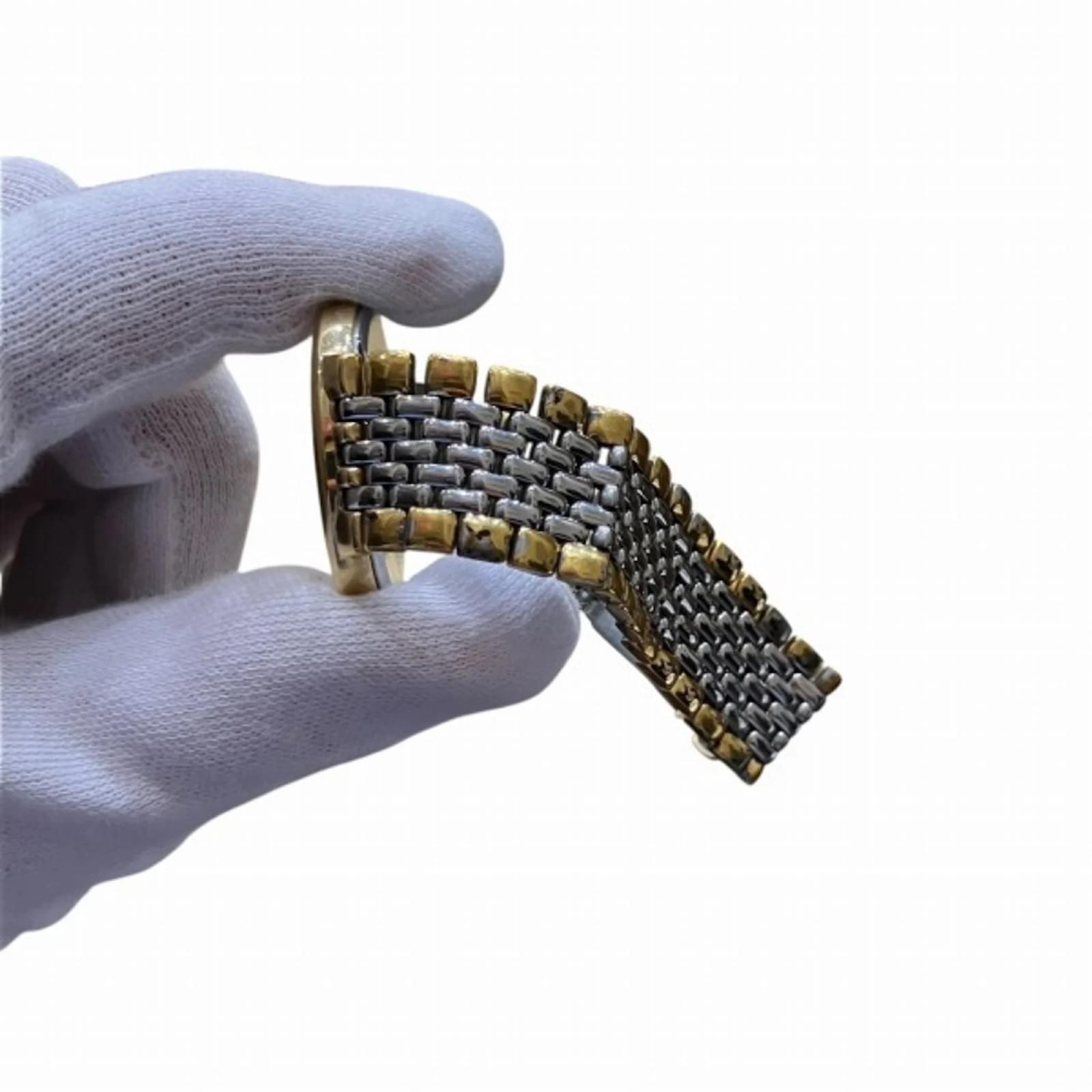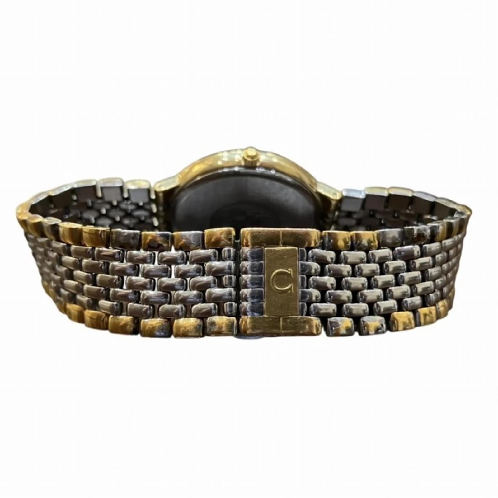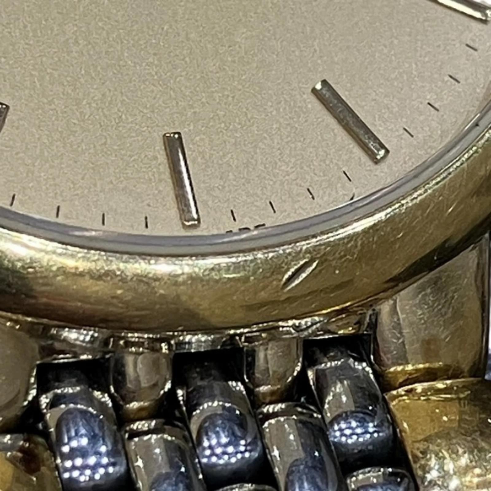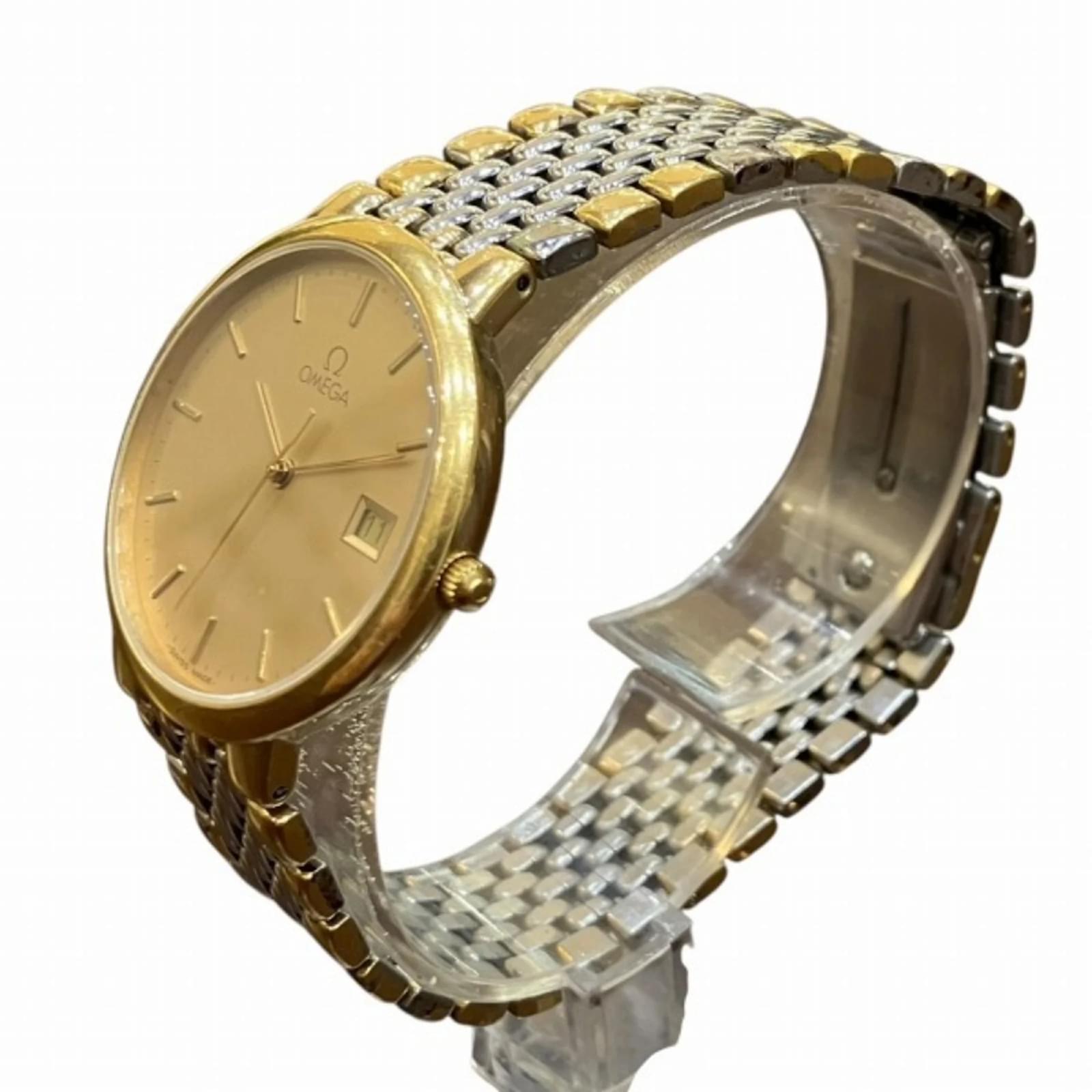The Omega De Ville Quartz Two-tone Watch is a stylish wristwatch designed for men, featuring a gold dial that complements its gold plated and stainless steel case and band. With a case diameter of 32.5mm and suitable for a wrist size of 18cm (7.08 inches), this watch combines elegance with functionality. \n\nThis timepiece operates on a reliable quartz movement and is classified as used, showing signs of wear such as slight scratches on the bezel, case, and glass, but remains in good condition overall. The watch has insignificant scratches on the dial and minimal wear on the band. It is important to review the provided images for a detailed view of its condition. \n\nNo accessories are included with the watch.
