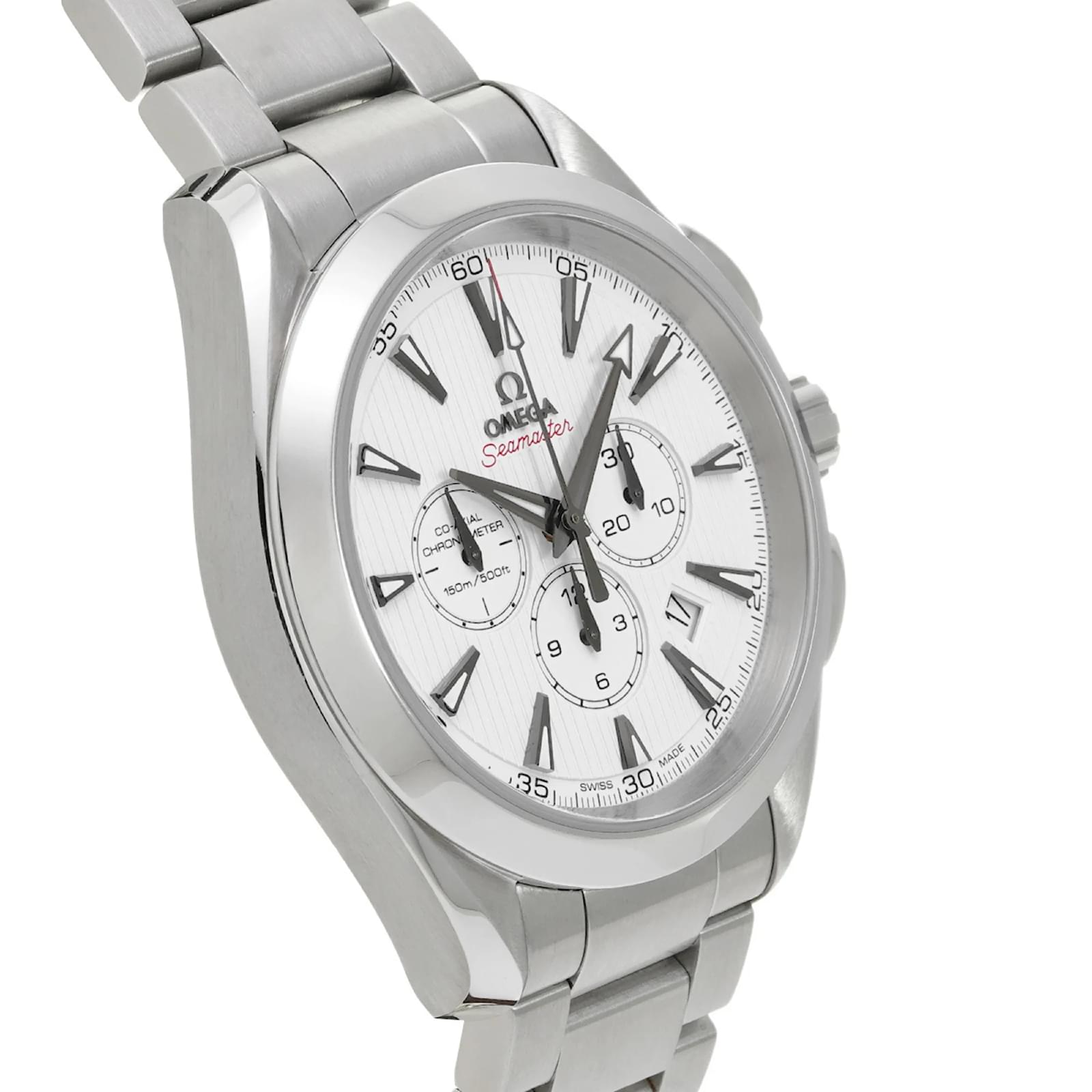 The Omega Seamaster Aqua Terra 231.10.44.50.04.001 is a sophisticated wristwatch designed for men, featuring a white dial protected by a sapphire crystal. The case and band are crafted from stainless steel, ensuring durability and a sleek appearance. This automatic watch has a self-winding movement and includes chronograph functions, making it both functional and stylish. \n\nWith a case diameter of 44mm and a thickness of 14mm, it fits a wrist size of 20cm (7.87 inches). The watch is water-resistant, suitable for various activities. This particular model is in very good used condition, showing only minor traces of usage, with insignificant scratches on the case and bezel. It comes with a certificate and is recommended to check the images for the exact condition before purchasing.