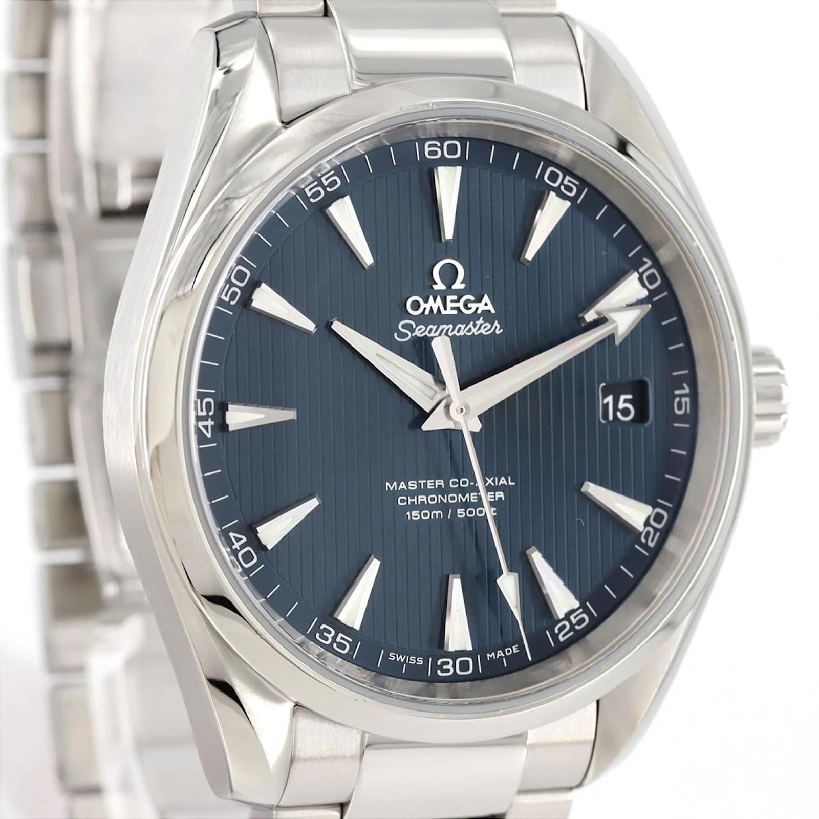 The Omega Seamaster Aqua Terra 231.10.42.21.03.003 is a stainless steel wristwatch featuring a blue dial. This automatic timepiece has a case diameter of 42mm and is suitable for a wrist size of 19.5cm (7.67 inches). The watch is classified as used, with a condition ranking of B, indicating it shows traces of usage, including slight scratches on the glass, but remains in acceptable condition for continued wear. It has been overhauled and polished to maintain its functionality. Included with the watch are the inner and outer boxes, along with a warranty. Potential buyers are encouraged to review the images for a detailed view of the item’s condition and included accessories.