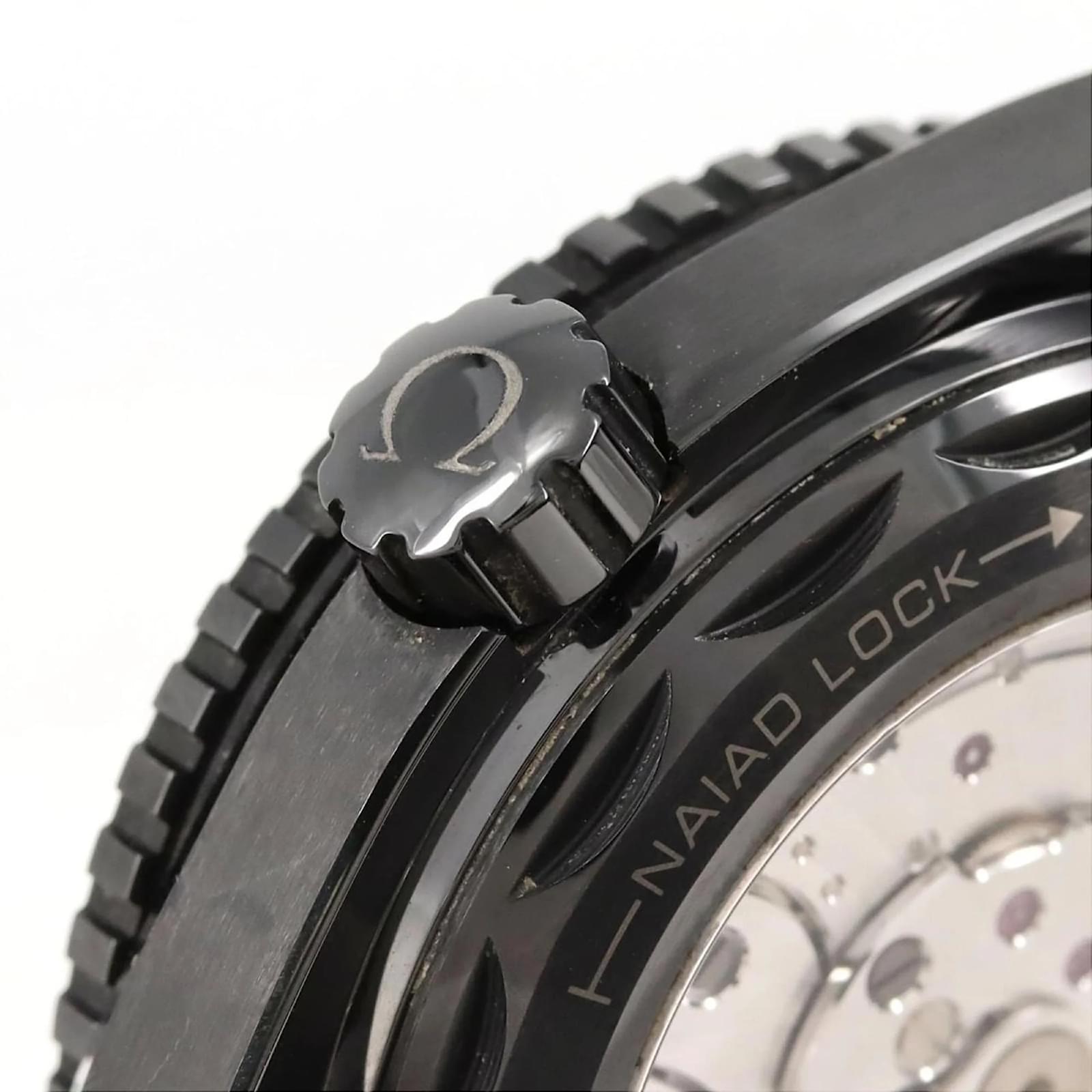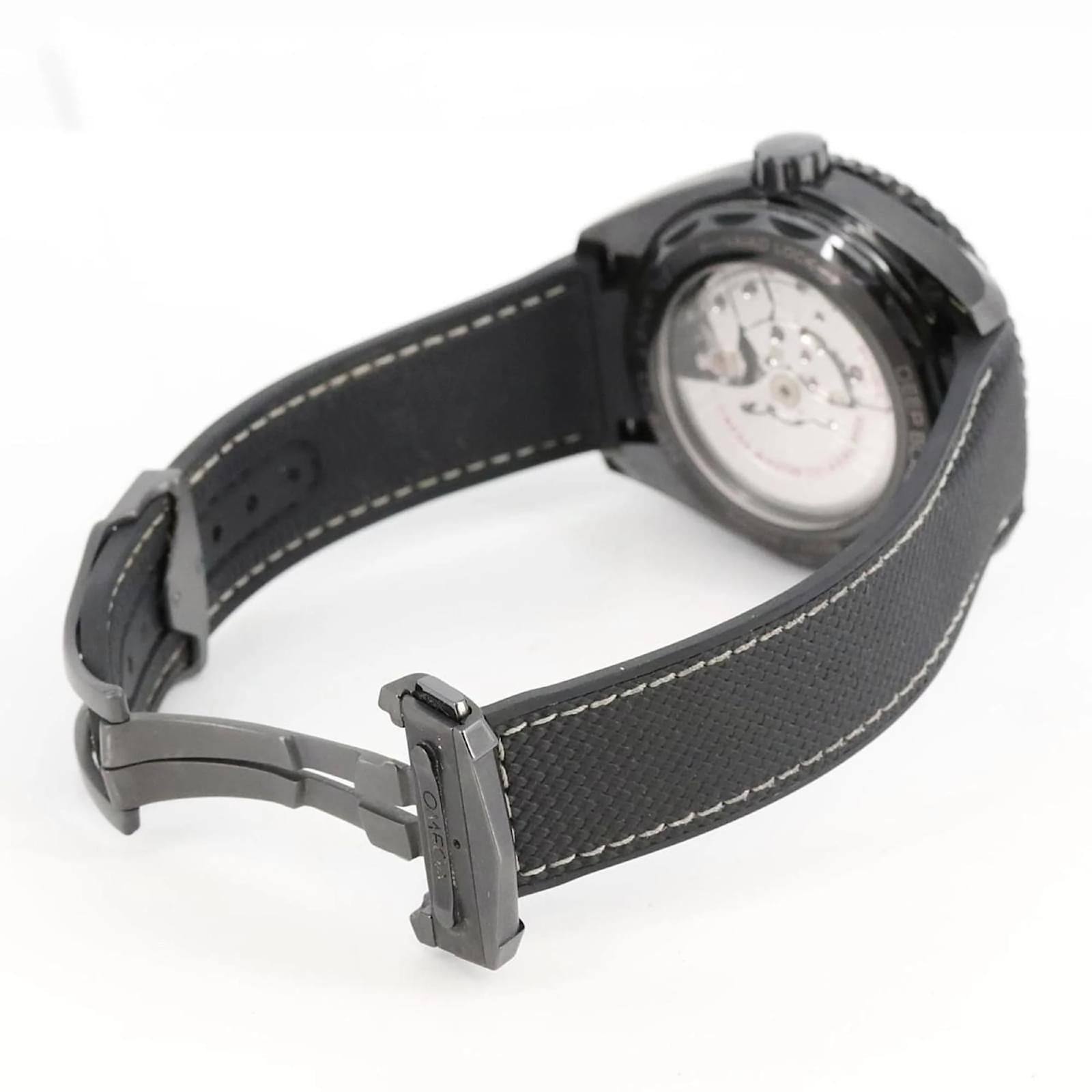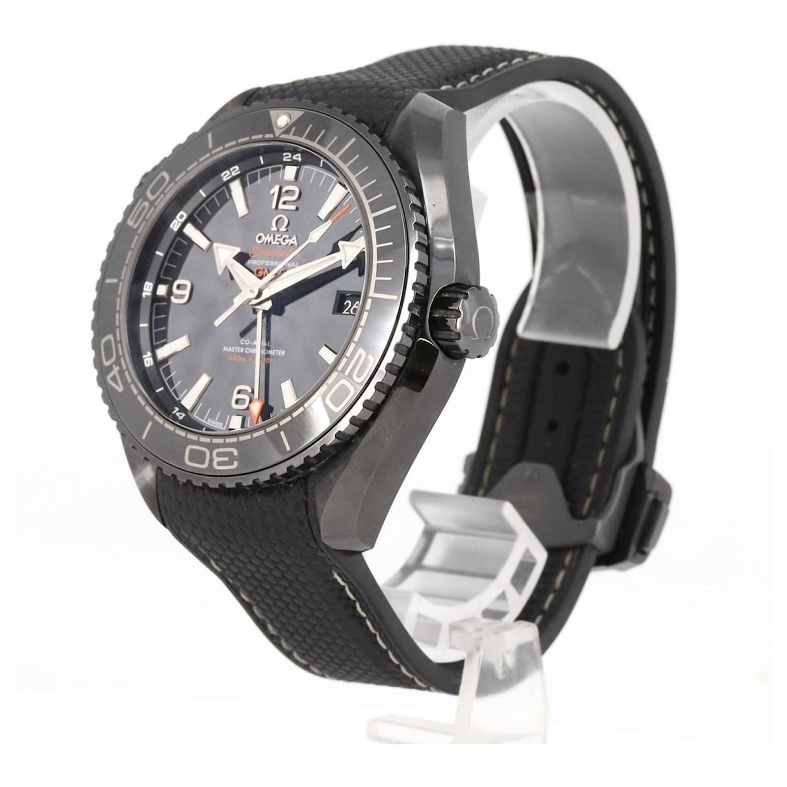 The Omega Seamaster Planet Ocean Deep Black GMT is a sophisticated wristwatch designed for those who appreciate both style and functionality. Featuring a black ceramic case with a diameter of 45.5mm, this timepiece is complemented by a durable black rubber band. It operates on a self-winding automatic movement, ensuring precision and reliability. The watch is in very good used condition, with insignificant hand scratches and traces of usage, classified as Rank A. Included with the watch are the inner and outer boxes, along with a warranty. For a complete understanding of its condition, potential buyers are encouraged to review the provided images.