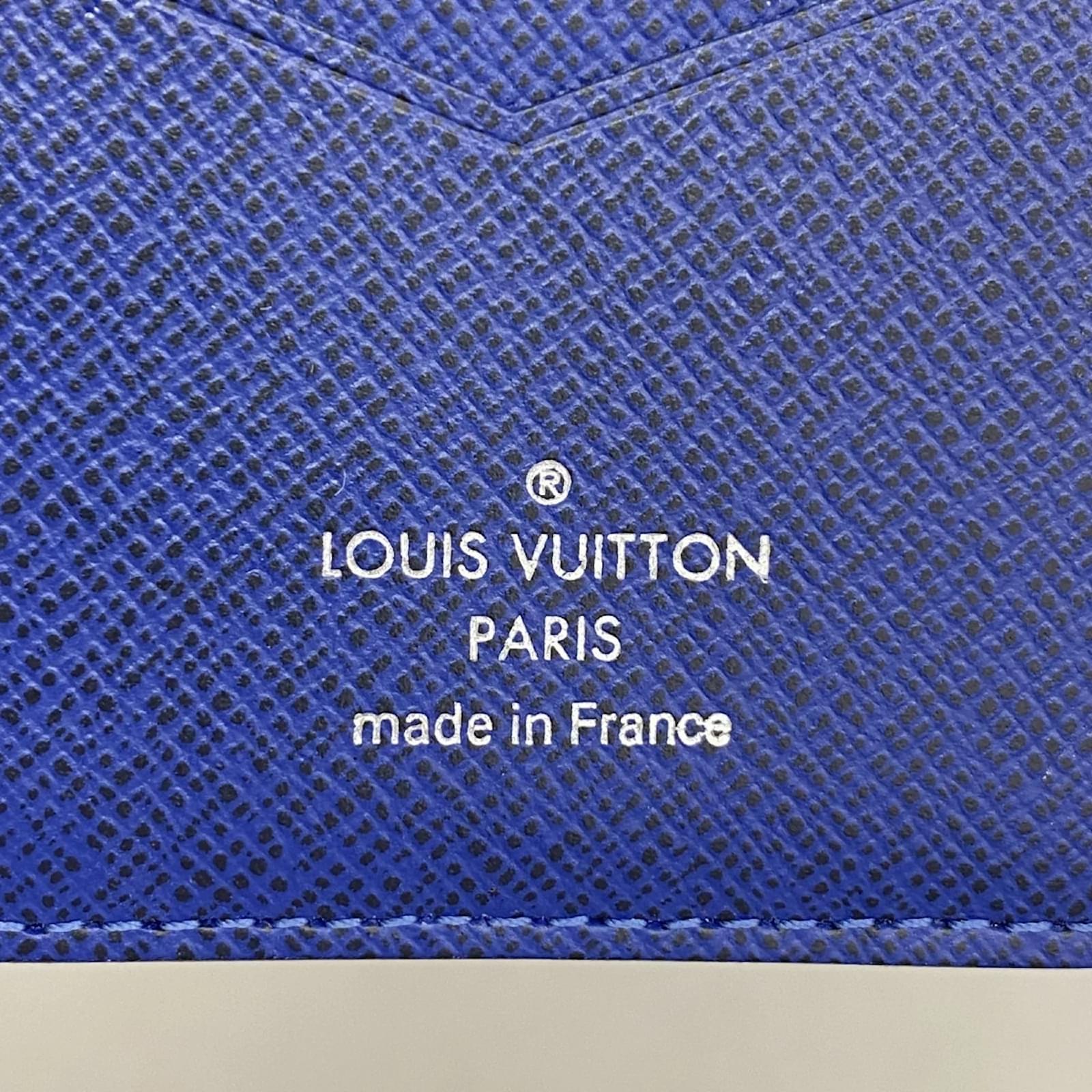 This Louis Vuitton business card holder, also known as the Taiga Rama Organizer de Poche M30301, is designed in a striking cobalt color. It is categorized as a card case, ideal for organizing business cards. The item is pre-owned and classified as being in good condition, with slight traces of use, including minor scratches and dirt. It is important to review the provided images for a clear understanding of its condition before purchasing. No additional accessories are included with this item.
