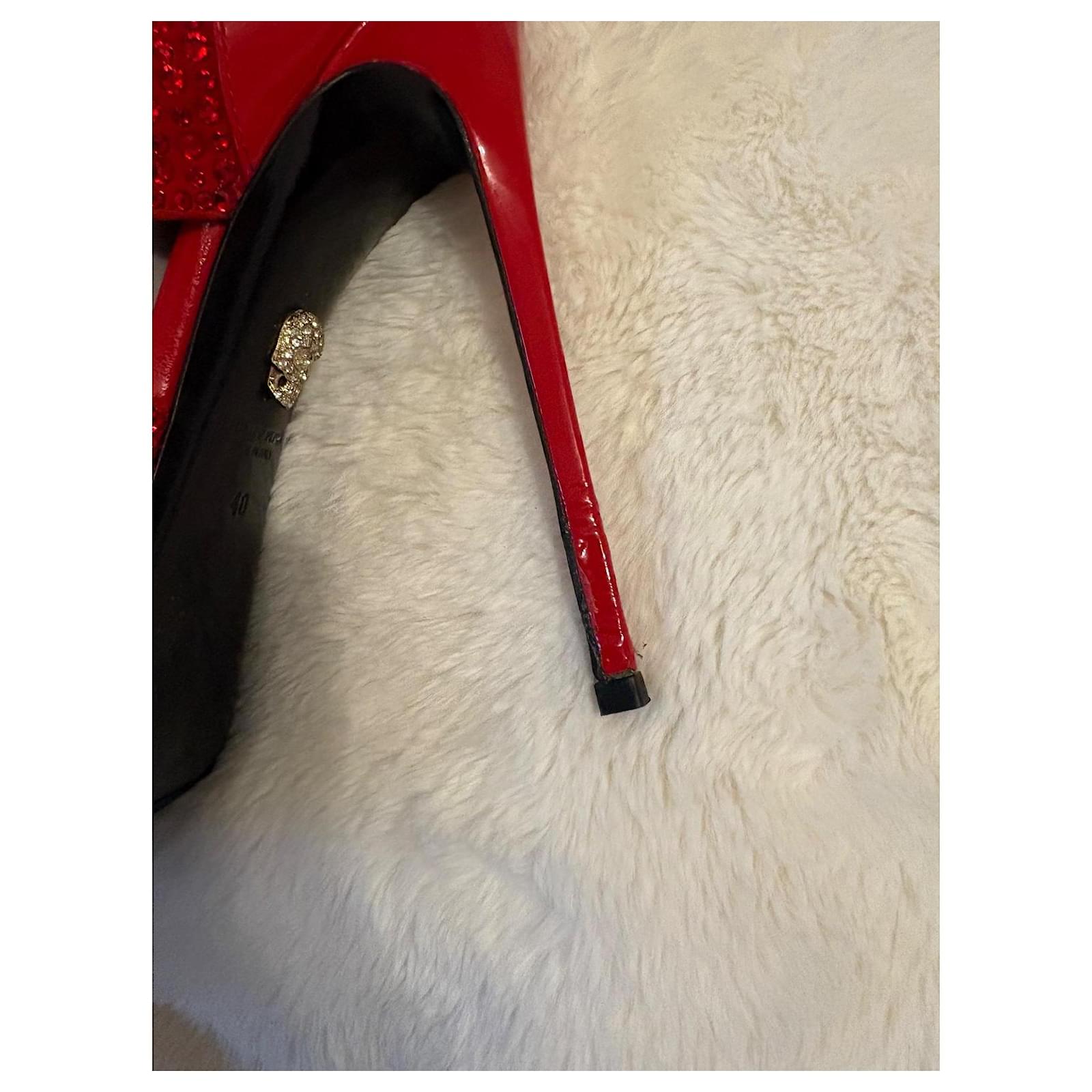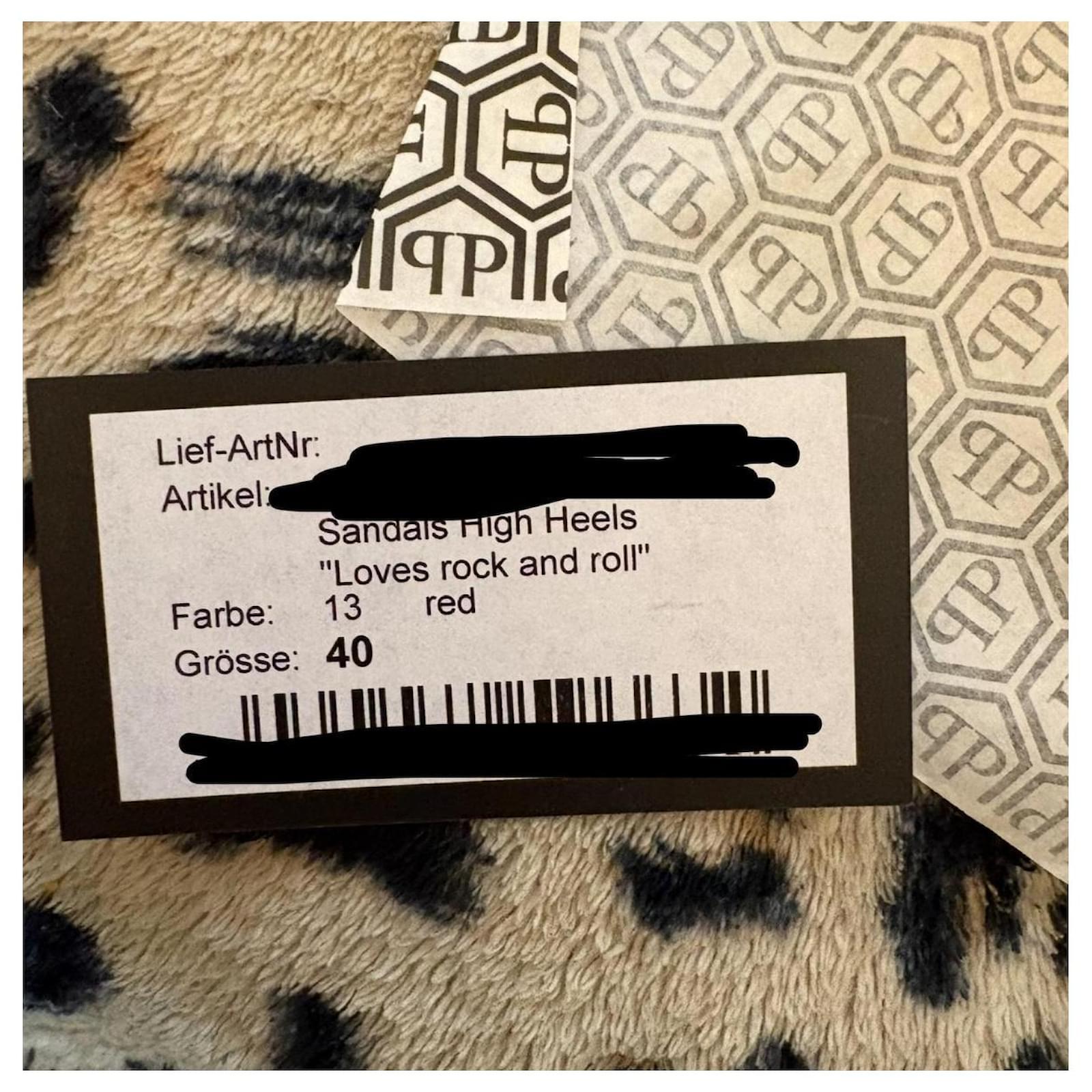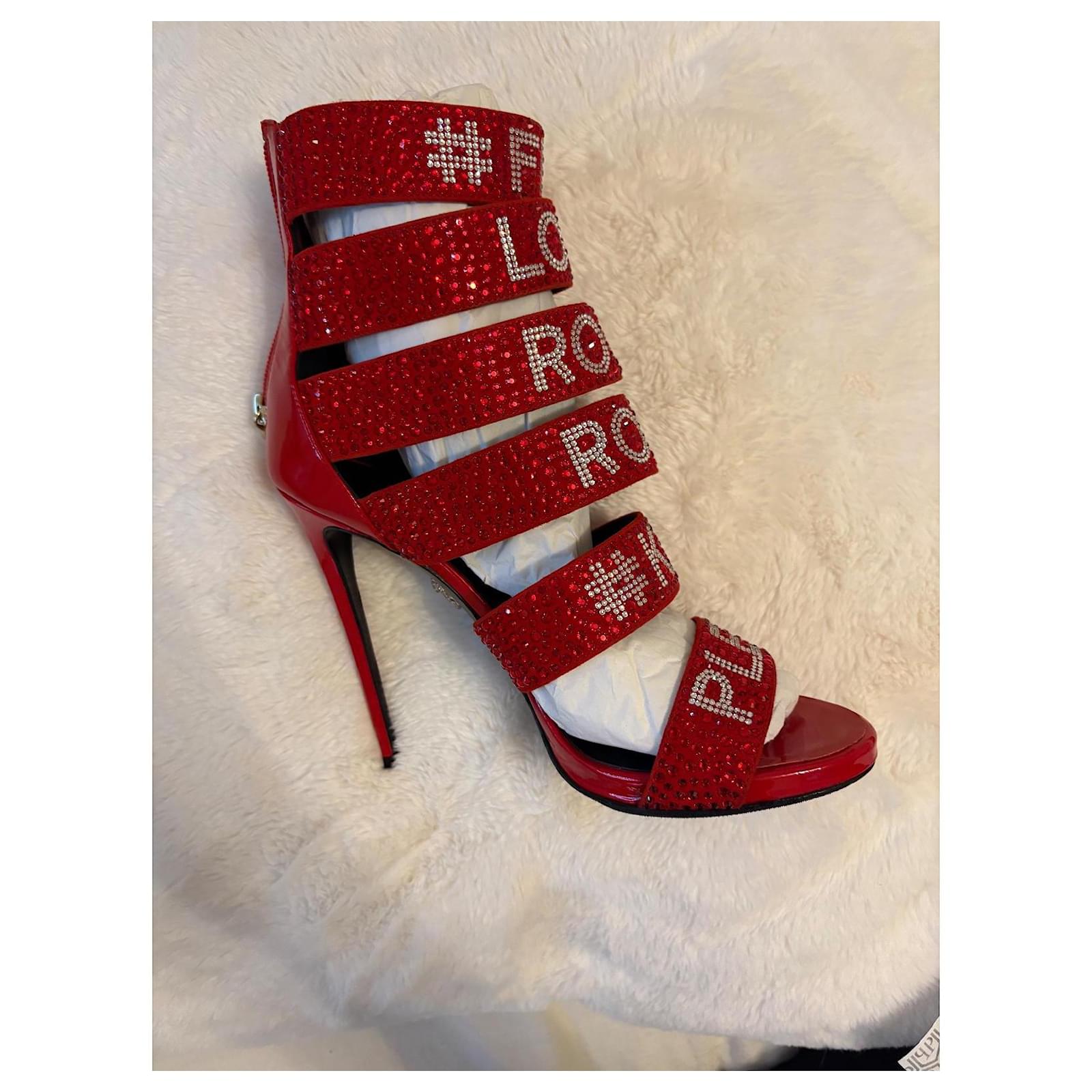 Stunning red high-heeled sandals from the brand Philipp Plein – model \”Loves Rock and Roll\”, ultra collector.\nDetails with rhinestones, slogans \”#Love\”, \”#Kiss\”, \”#Rock\”, logo sole and skull.\nSize 40 – Condition: new, worn only once. A defect on the right heel, visible only up close.\nRetail value: €2,300\nSold with their original box.\nModel unavailable today – perfect for fans of bold fashion!