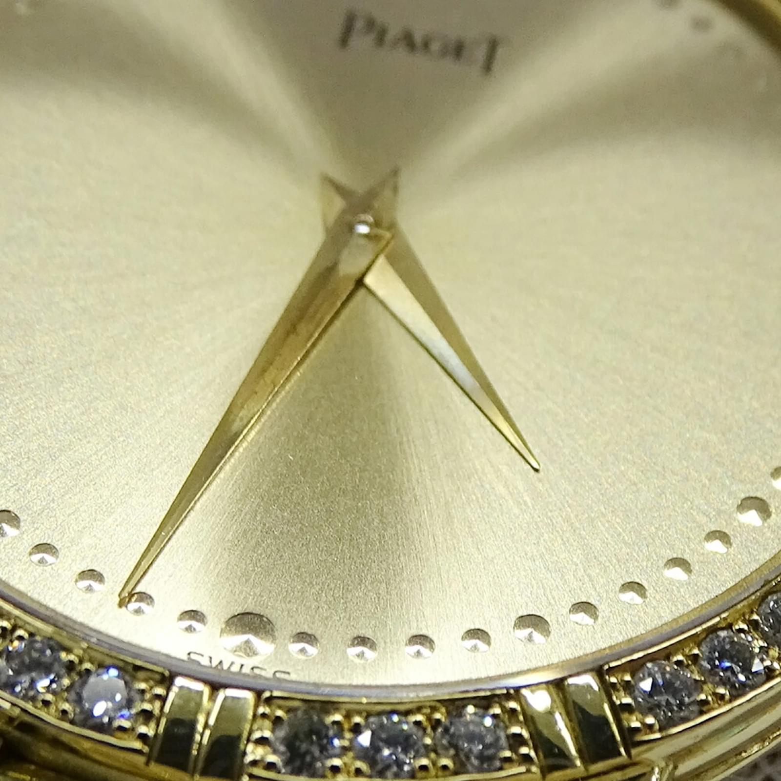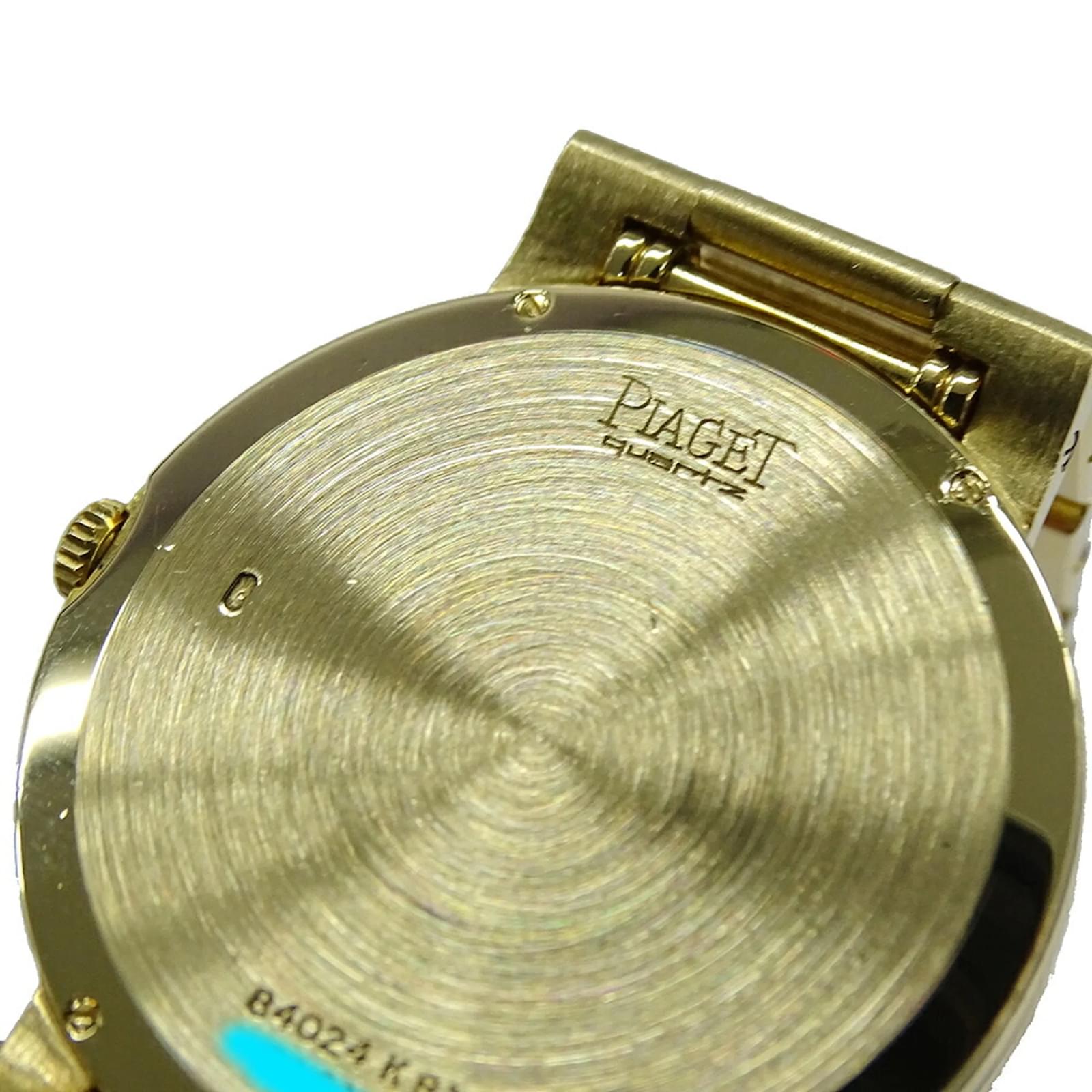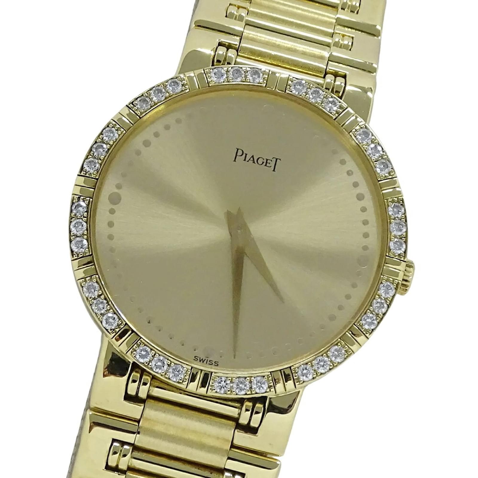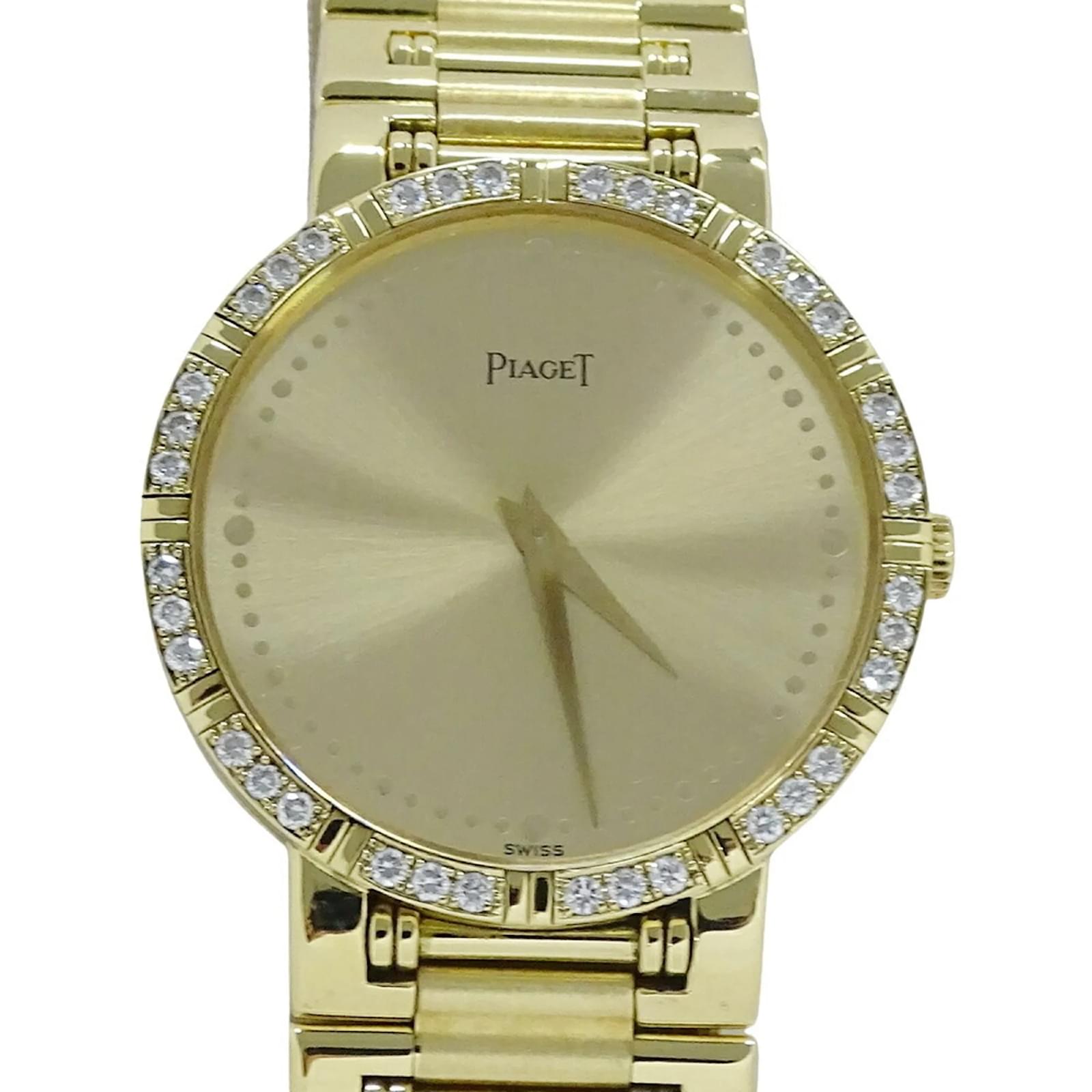 The Piaget Dancer Diamond Quartz wristwatch is a sophisticated timepiece crafted from 18K yellow gold, featuring a polished round case with a diameter of 31mm. The watch showcases a gold dial adorned with diamonds, providing an elegant touch to its analog display. It is designed for a wrist size of 17cm (6.69 inches) and weighs 82g (2.89oz). \n\nThis used watch is in good condition, with insignificant scratches on the bezel, case back, and bracelet, while the dial and glass remain free from any scratches. The watch has been polished and shows traces of usage, but overall, it is well-maintained. \n\nManufactured in Switzerland, this model, identified by the MPN 84024K81, is part of Piaget’s Dancer line. Please refer to the images for a detailed view of the item’s condition and included accessories.