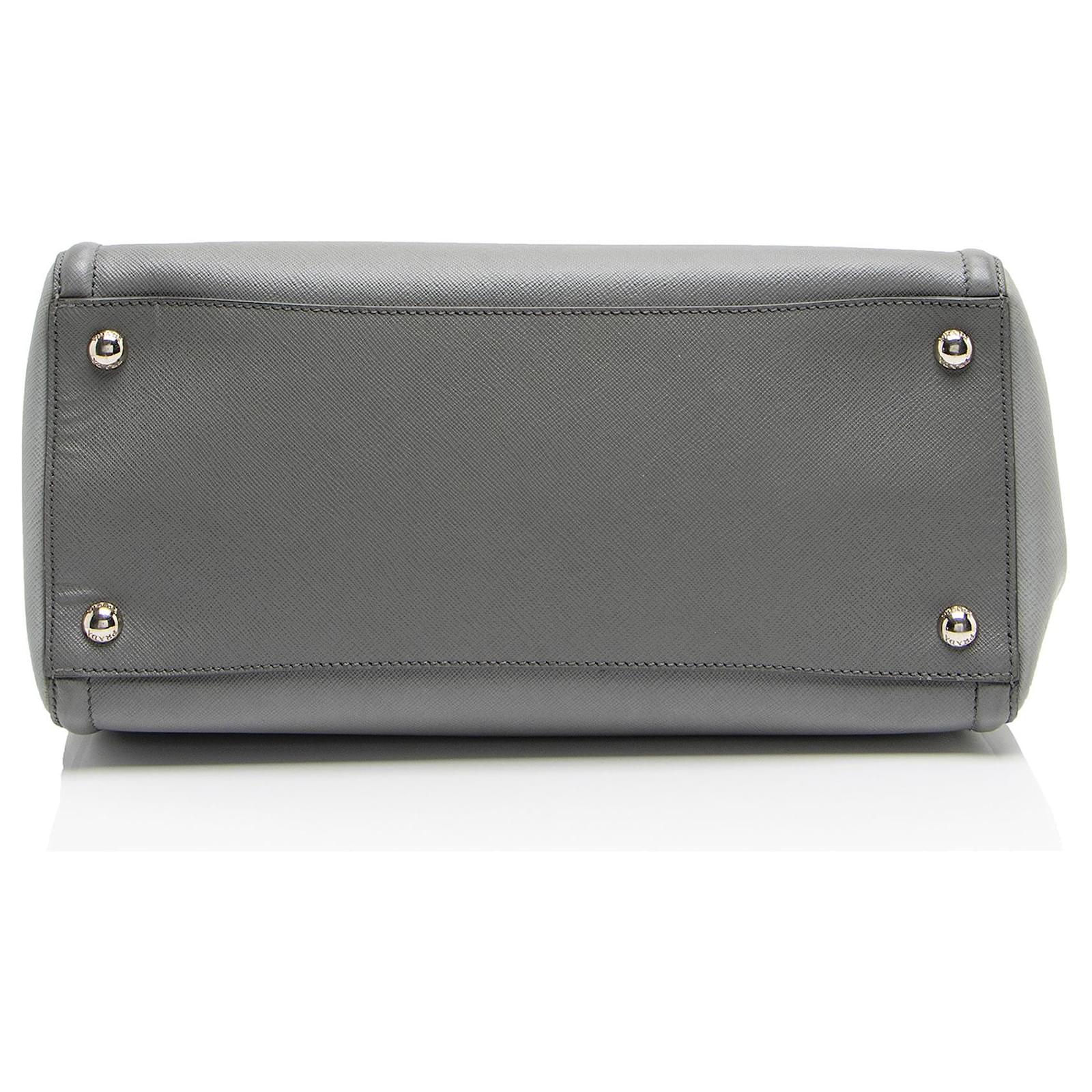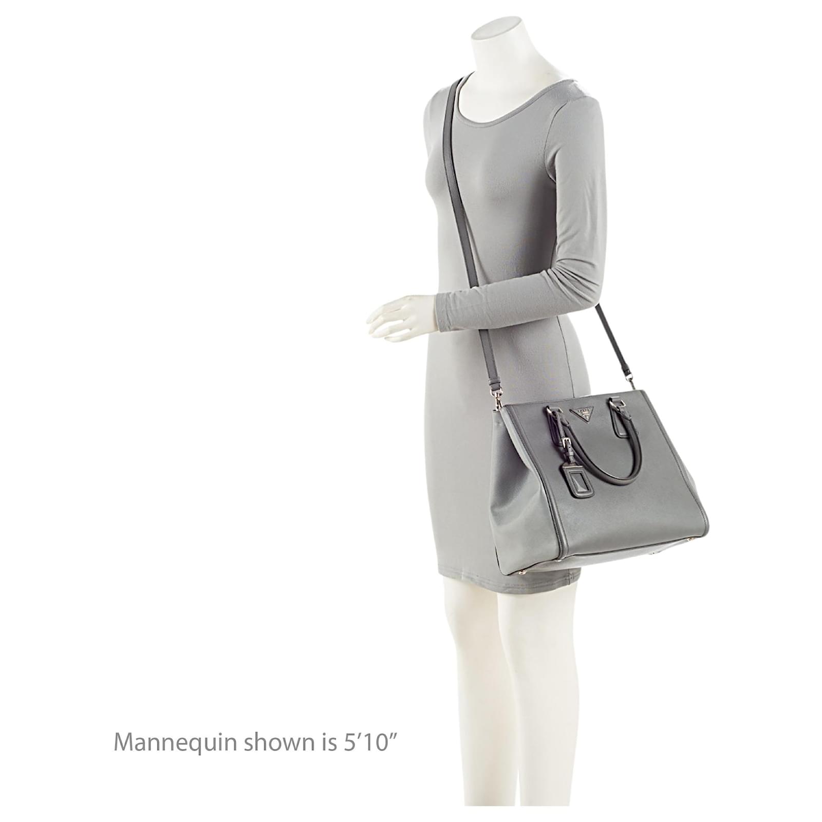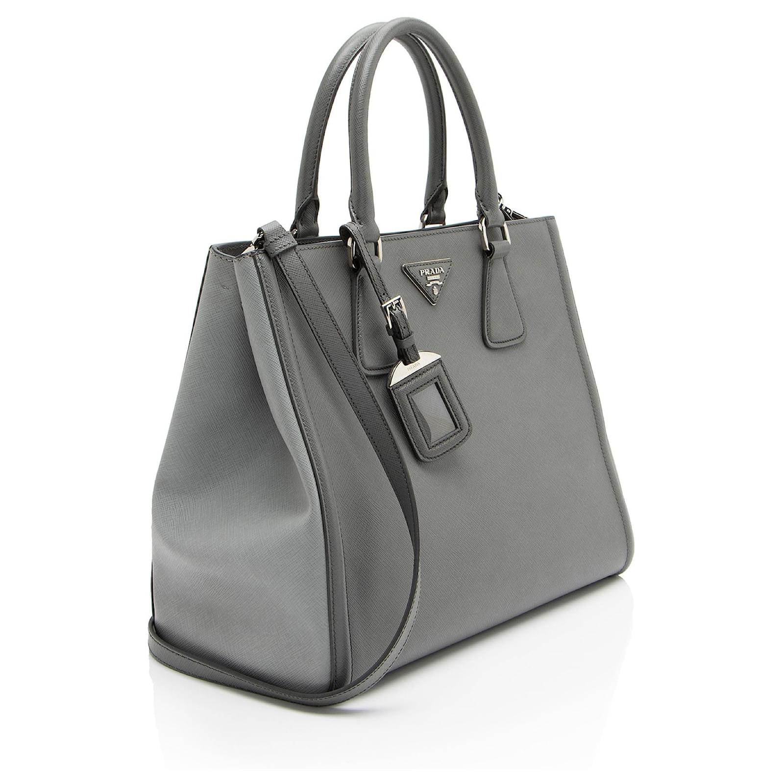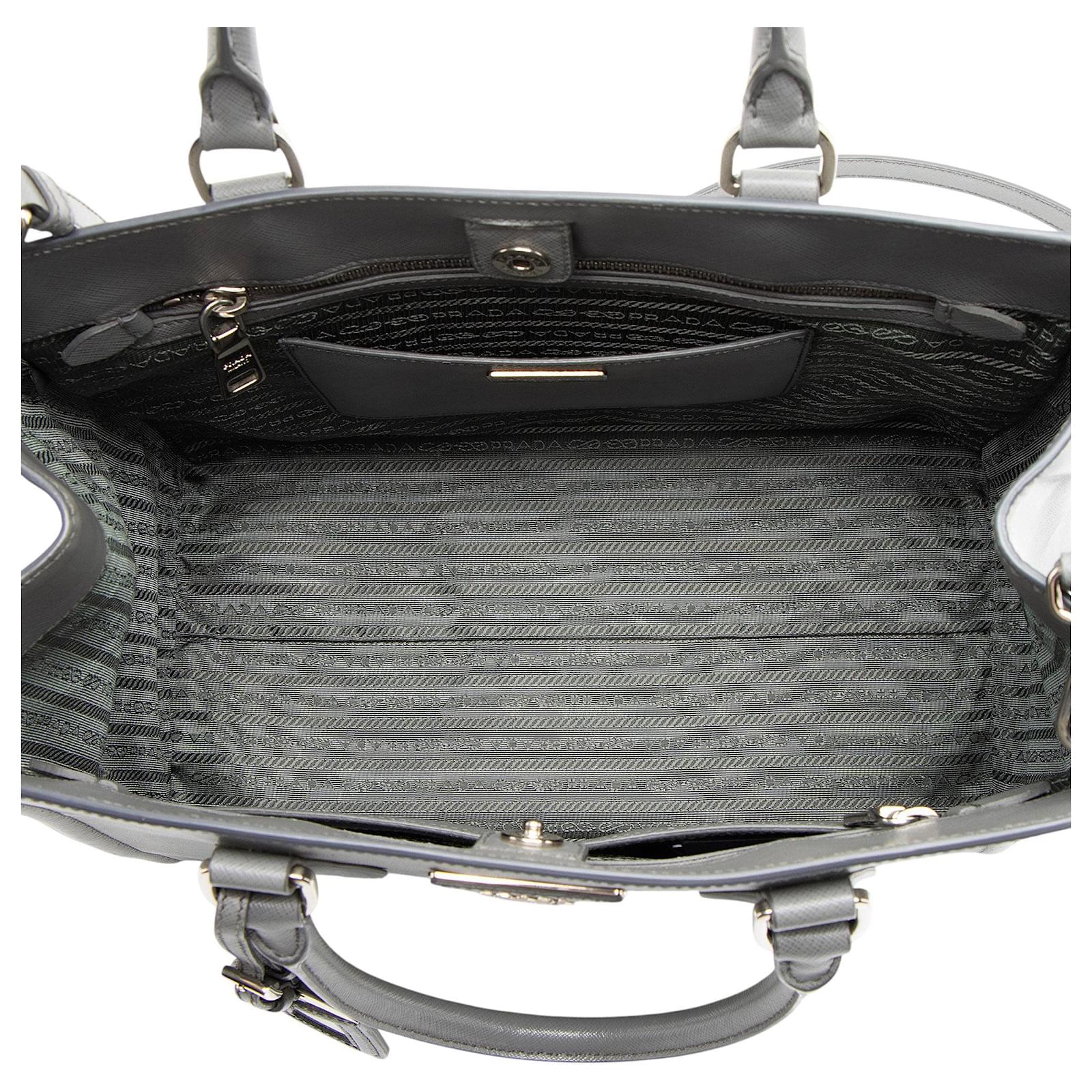 Founded by Mario Prada in 1913, the Italian fashion label of Prada is renowned for its original, yet practical designs. Each piece of the collection is meticulously crafted with the finest materials, consistent with its heritage as a leather goods shop. In 1978, the granddaughter of Prada, Miuccia Prada, took position as the brand’s lead designer. Prada was awarded the ‘Council of Fashion Designers of America’ award for accessories. The brand is also known for reviving the industry’s use of nylons. With a continuously artistic array of handbags and accessories, the brand remains a highly-coveted household name.Condition Notes: Minor scuffs to exterior bottom corners. Minor cracking to exterior top corner casing. Minor surface scratches to hardware.Width (at base): 13\”Height: 10.5\”Depth: 6\”Handle Drop: 6\”Shoulder Strap Drop: 22\”, AdjustableType of Material: LeatherColor: GreyLining: Grey Logo JacquardPockets: Five InteriorHardware: Silver ToneClosure: SnapOrigin: ItalyIncludes: Detachable Shoulder Strap, Luggage Tag Measurments: width: 330 mm height: 266 mm strap length: 558.8 mm handle drop: 152.4 mm \n Product Id: 510767 \n