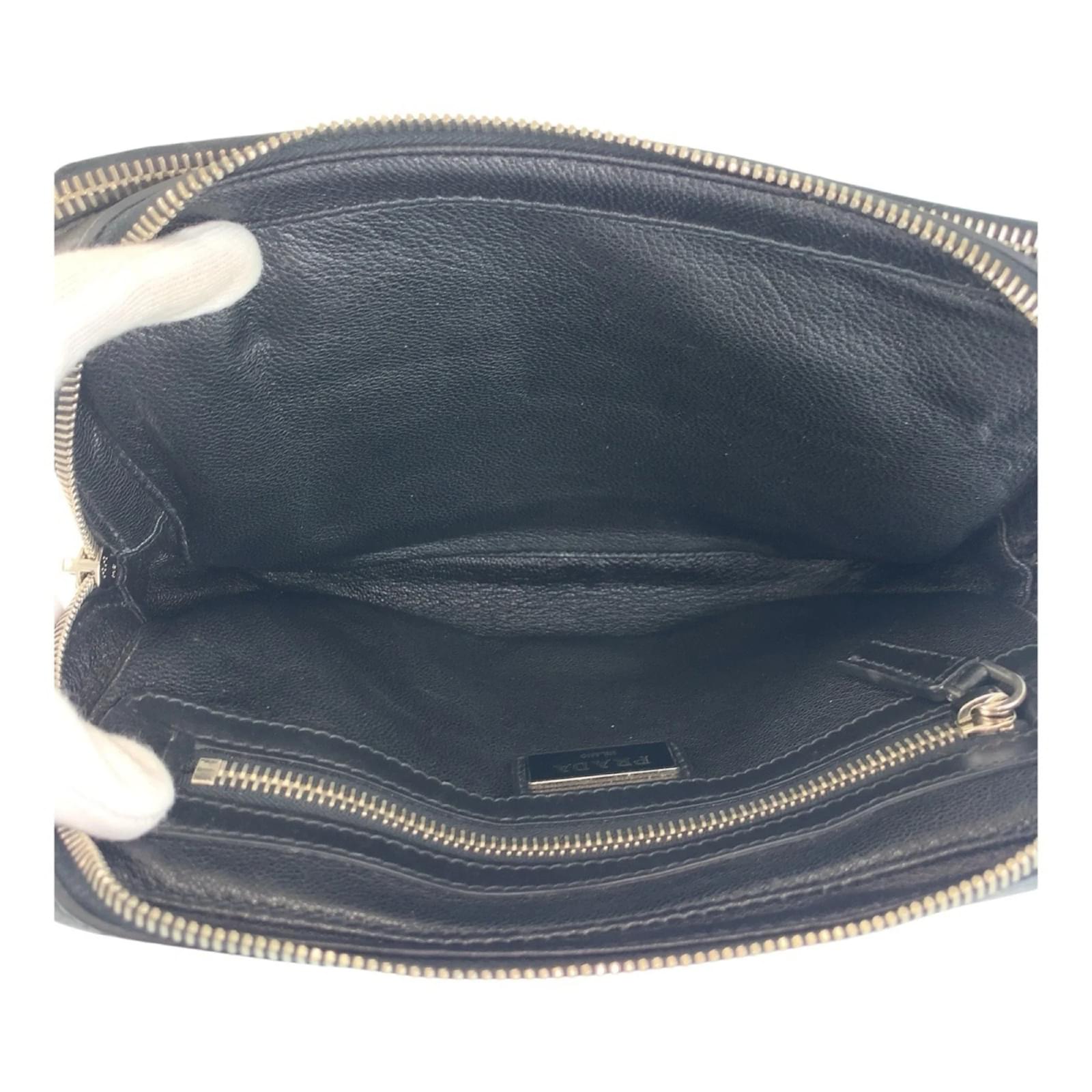 This Prada clutch bag features a sleek black leather design, complemented by a silver hardware triangle logo plate. Measuring 15cm x 23cm x 5cm, it is compact yet functional for various occasions. The bag is classified as used but remains in good condition, showing slight traces of use, including minor scratches and dirt. The handle has a minor misshape, but this does not detract from its overall appeal. Please refer to the images for a detailed view of the item’s condition and note that no additional accessories are included.