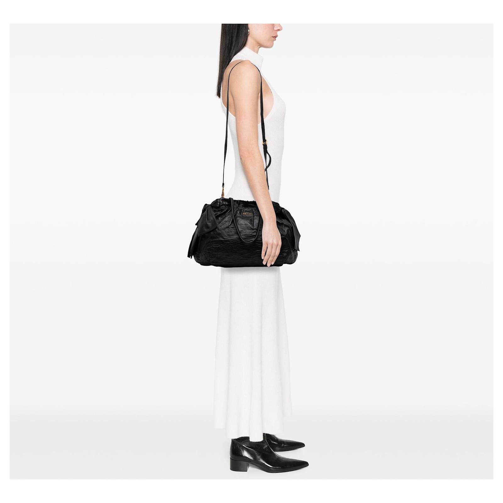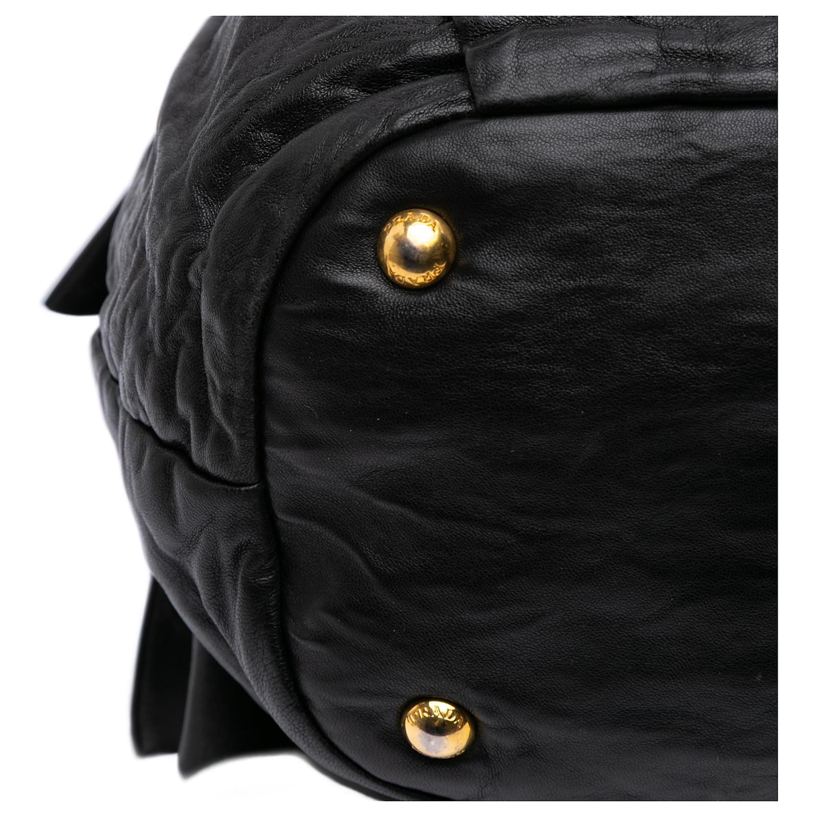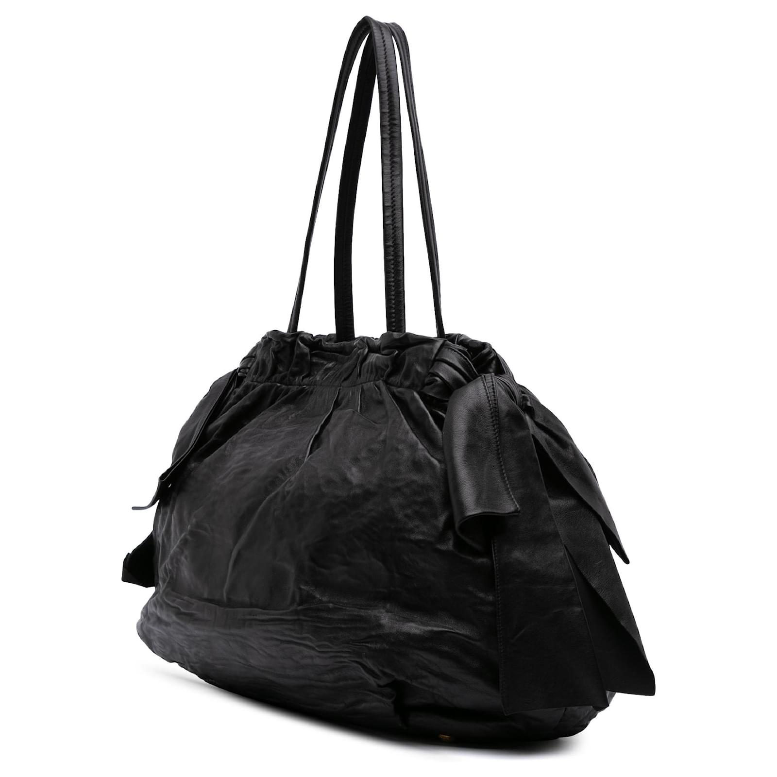 This satchel features nappa leather body with large leather bows on the sides, double flat leather handles, a detachable flat leather strap, an open top with magnetic snap button closure, and interior zip and slip pockets. It carries a B+ condition rating.\r\n\r\nExterior Back Creased. Exterior Bottom Worn. Lock Scratched. Exterior Corners Worn. Exterior Front Creased. Exterior Handle Creased, Split. Interior Lining Worn. Practical Attachment Scratched. Exterior Side stained with Other. Exterior Top Worn. Zipper Scratched. \r\n\r\nDimensions: \r\nLength: 35 cm\r\nWidth: 36 cm\r\nDepth: 15 cm\r\nHand Drop: 24\r\nShoulder Drop: 68\r\n\r\nInclusions: No longer comes with original accessories.\r\n\r\nColor: Black\r\n\r\nMaterial: Leather x Nappa Leather\r\n\r\nCountry of Origin: Italy\r\n\r\nBoutique Reference: PJC316649F956 \r\n