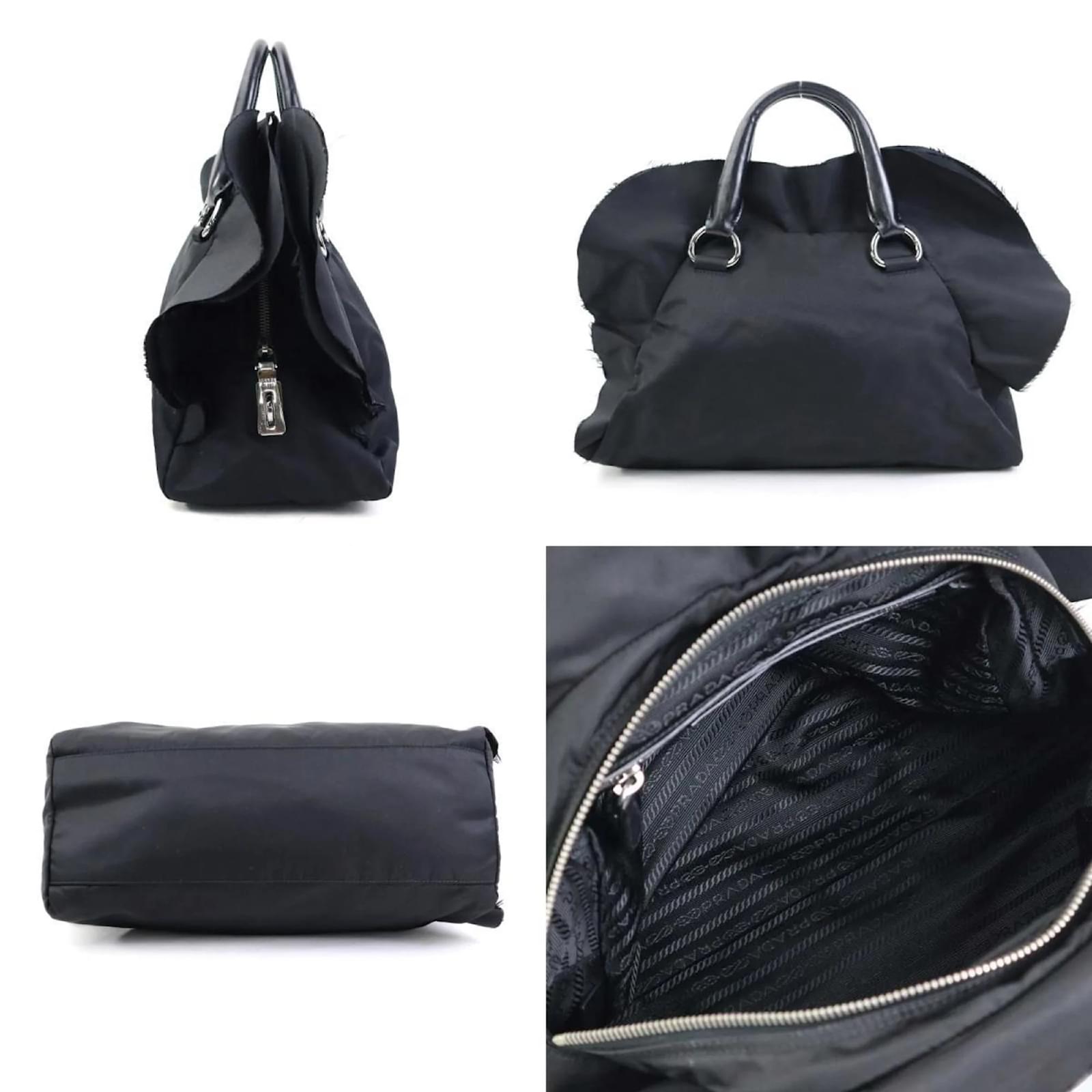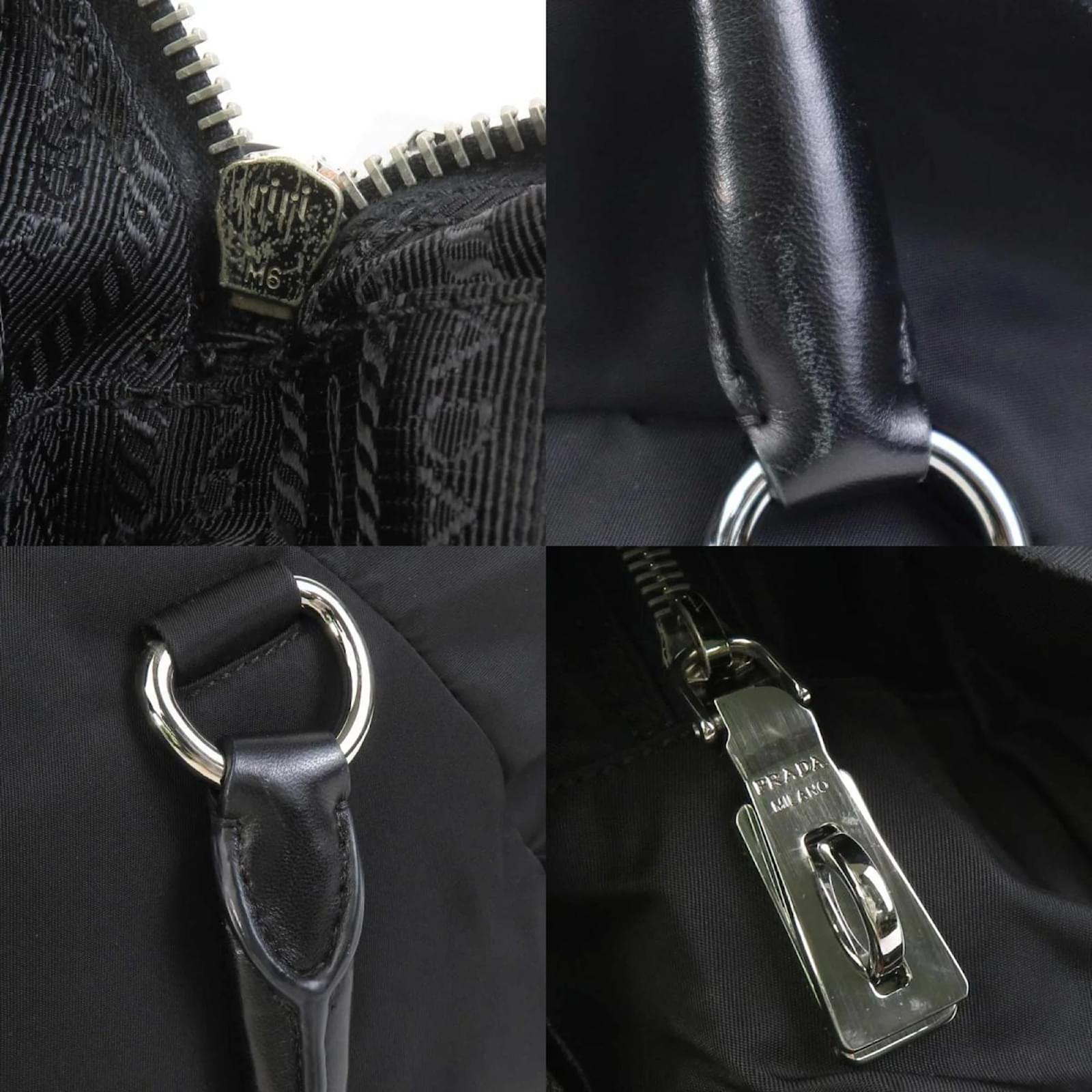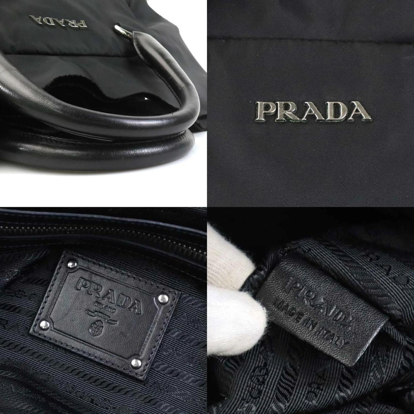 This Prada handbag combines nylon and leather in a sleek black design, featuring silver hardware. It has a zipper closure and includes both a zipper pocket and a snap pocket for organization. The handbag measures 25cm in height, 33cm in width, and 14cm in depth, with a handle length of 12cm. \n\nOriginating from Italy, this item is classified as used but remains in good condition, showing slight traces of usage such as minor scratches and dirt. Potential buyers are encouraged to review the provided images for a detailed view of the handbag’s condition. No additional accessories are included with this purchase.