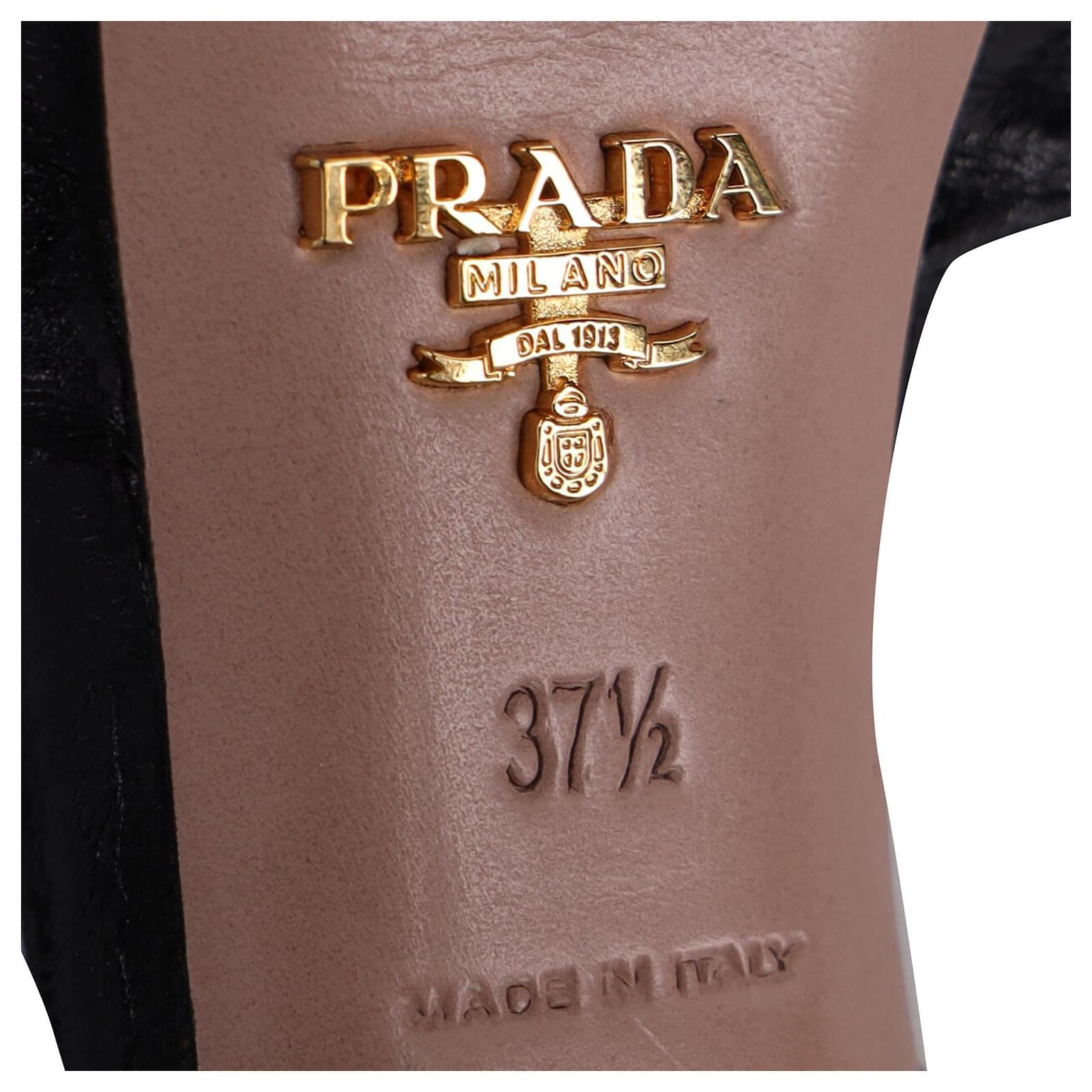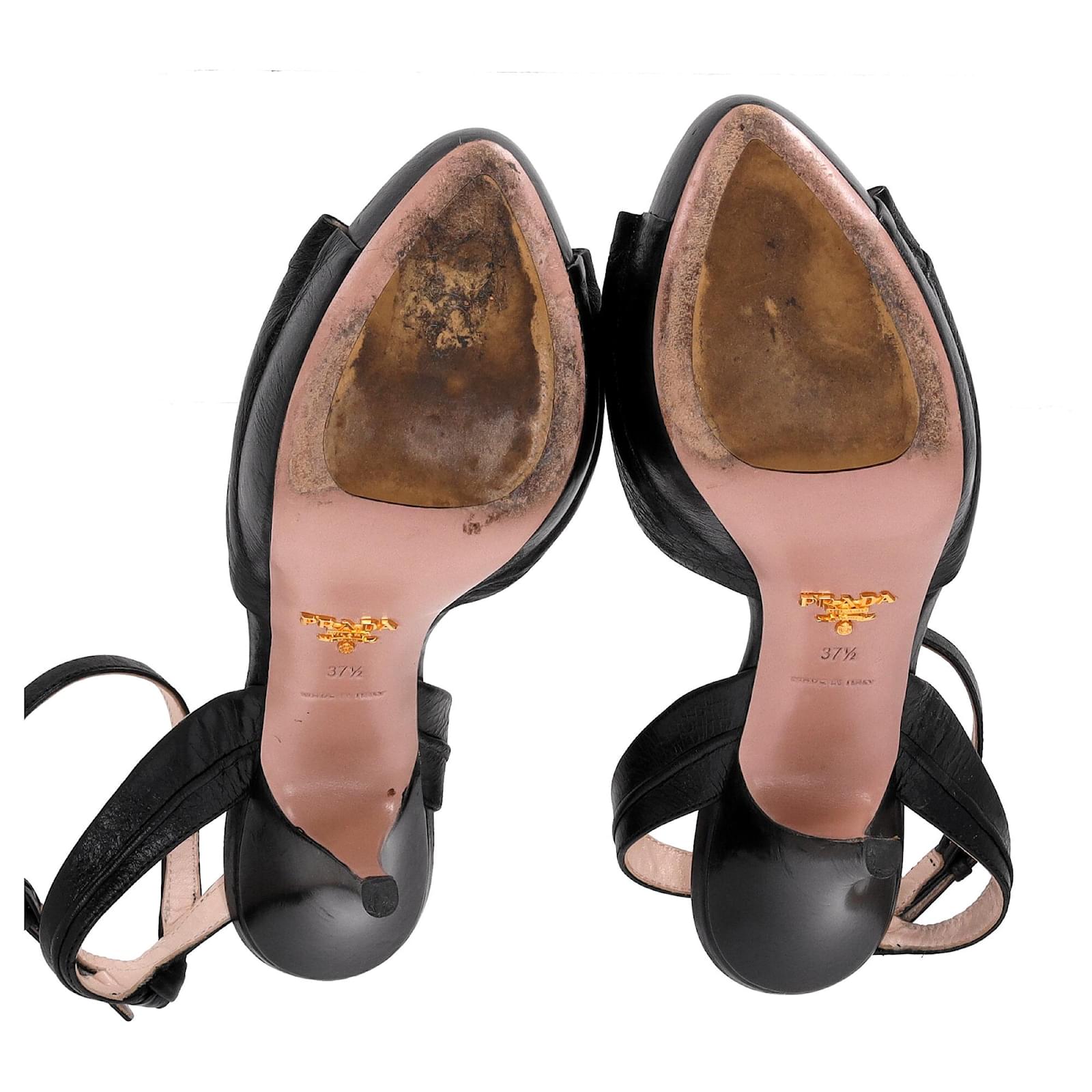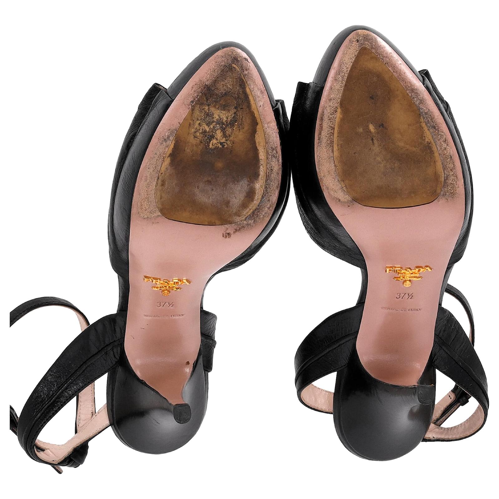 The Prada Knot Detail Platform Sandals in Black Leather are a perfect blend of sophistication and modern edge. Featuring a unique knot detail on the straps, these sandals add a touch of artistic flair to a classic design. The black leather construction offers durability and luxury, while the platform sole adds both height and comfort, making them ideal for both day and night wear.\n\n\nwith Box, Dust bag\n\nPrada Knot Detail Platform Sandals in Black Leather\nCondition: Very good\nSigns of wear: Minor markings, Lightly used but very well maintained. Minor mark at soles & creasing, light scuffing at the soles and heels.\nPackaging: Box, Dust bag\nColor: black\nMaterial: Leather | leather\nSize: EU | 37\nMeasurements: Heel height: 120; Insole length: 230\nSKU: NAPPUFRSH466299W \n Product Id: 466299 \n