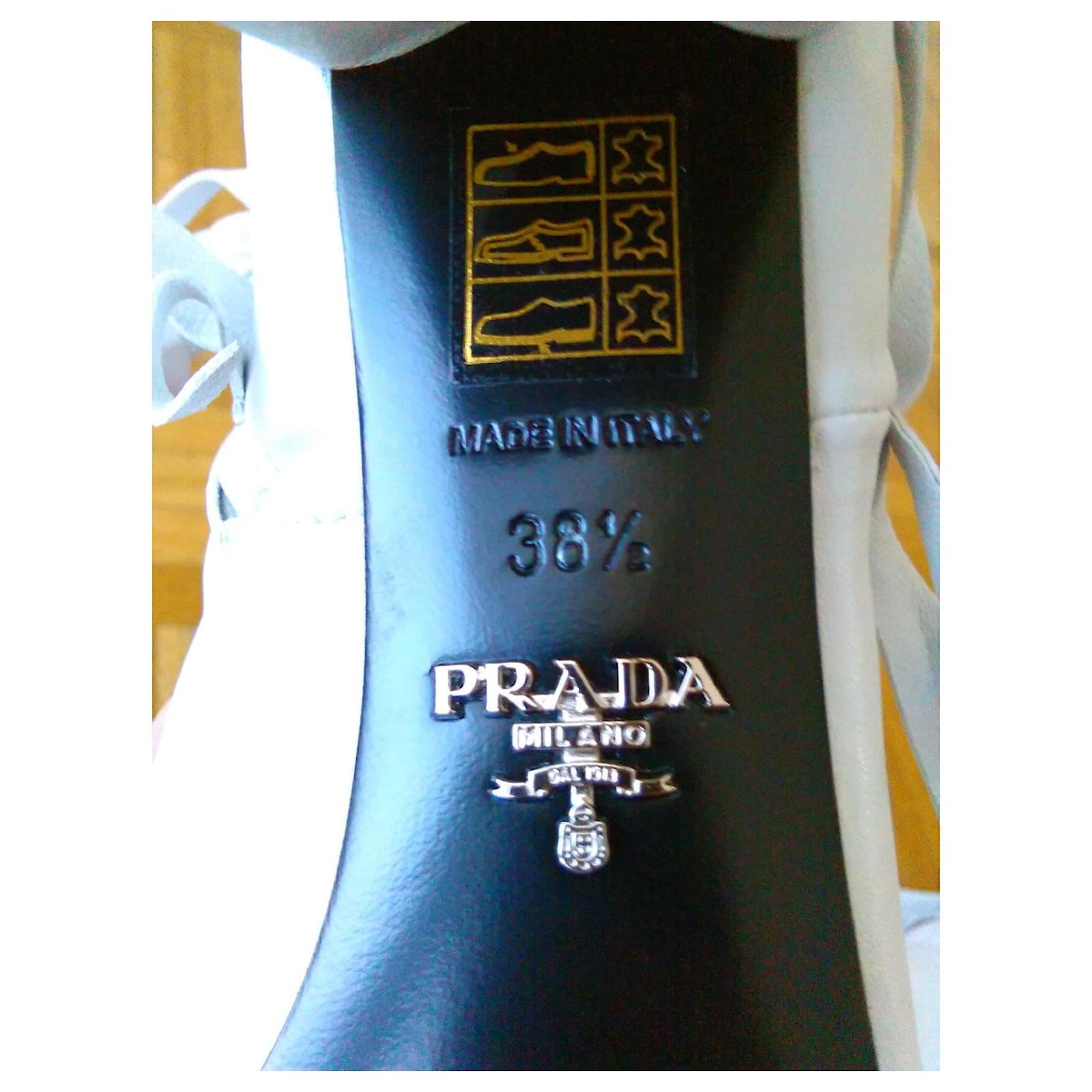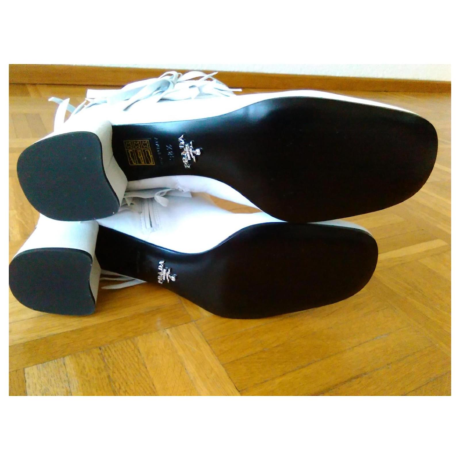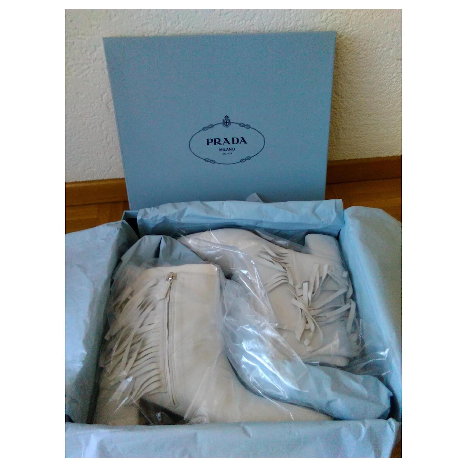 Beautiful Prada ankle boots made of white leather featuring a simple and refined design with a versatile character.\nDetails: Nappa, solid basic color, fringes, zip, leather interior, leather sole, covered geometric heel. The leather sole is enhanced by the iconic silver lettering logo.\nColor: White,\nSize: 38.5 (IT),\nDimensions:\nSole length: 25 cm,\nHeel height: 5.5 cm,\nUpper height: 14.5 cm,\nCalf diameter: 14 cm,\nMade in Italy.\nPackaging: Dustbag and original box\nCondition: NEW, never used (tried on only in store)